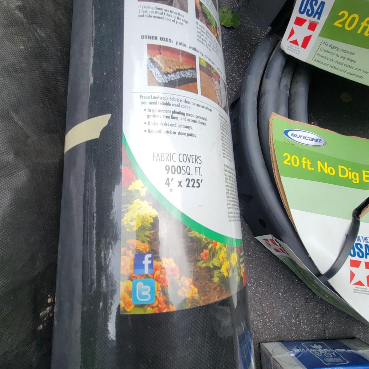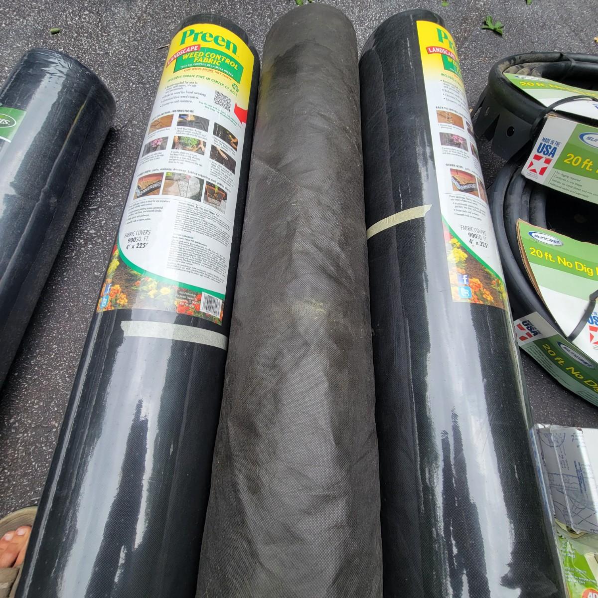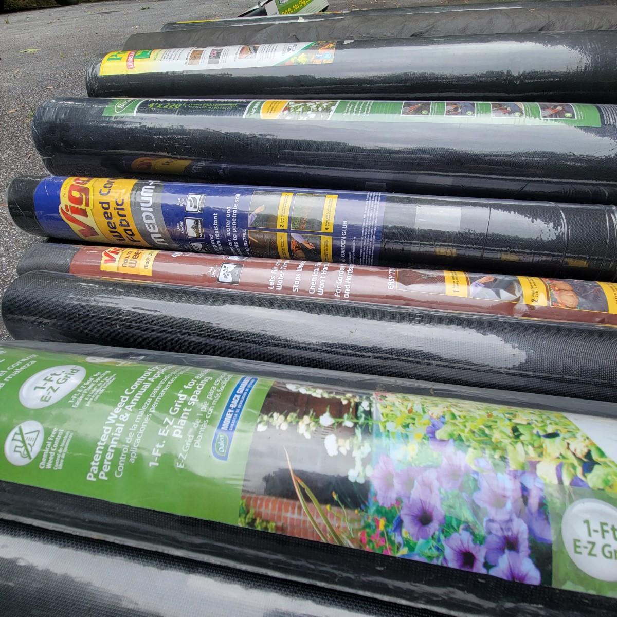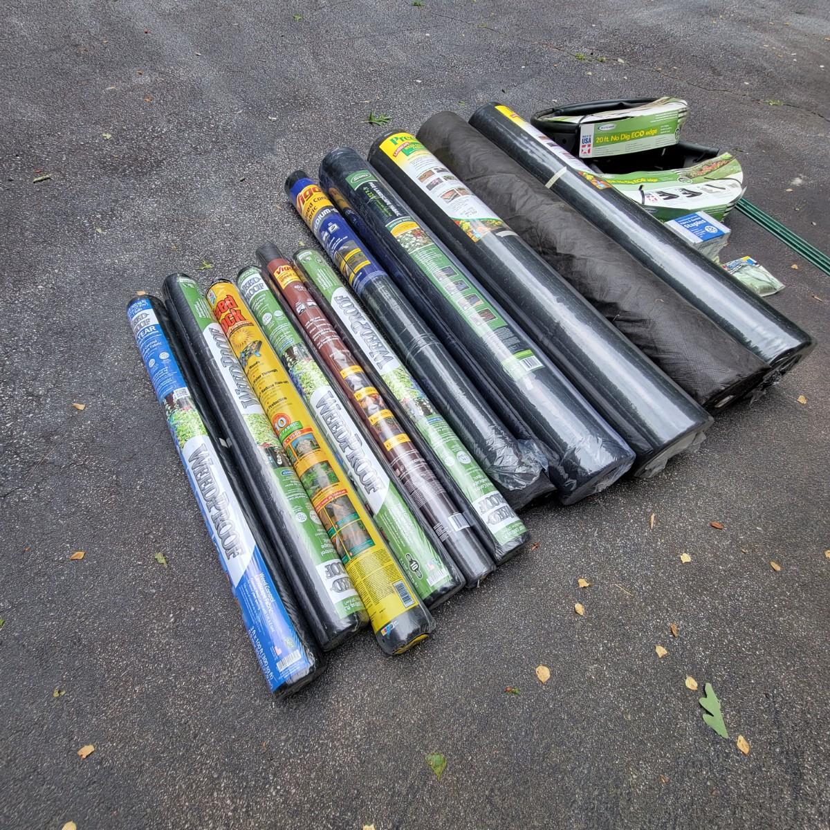 12 rolls of landscaping fabric in a variety of sizes and lengths. The largest are 4' x 225' and all are new except one that has a small amount used. Also includes two 6' posts, lawn fabric pins, flower bed edging and plant labels. Local pickup only.