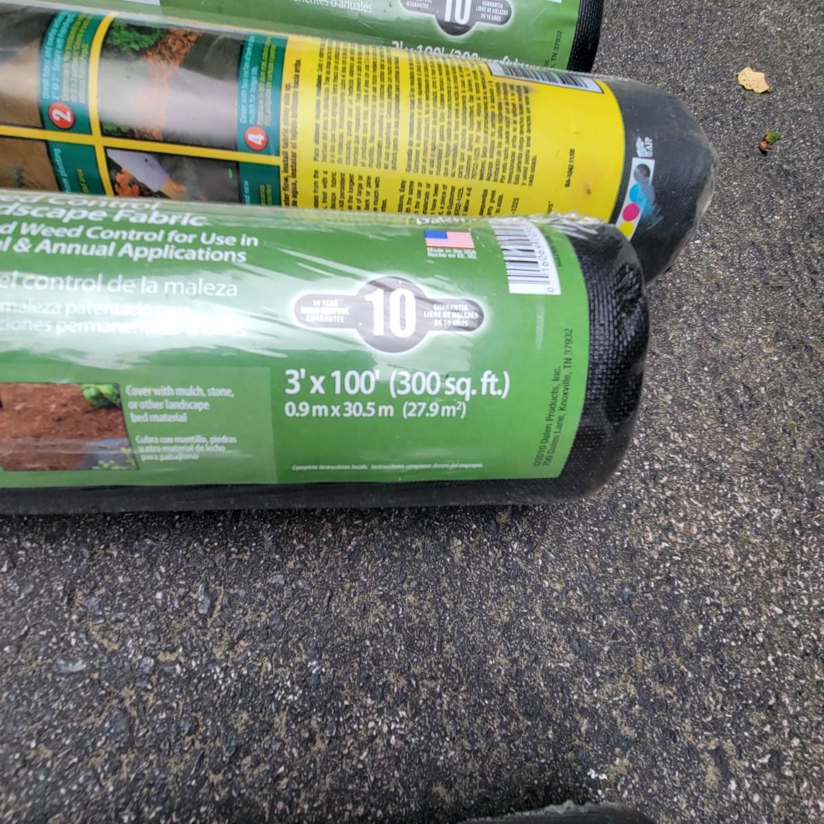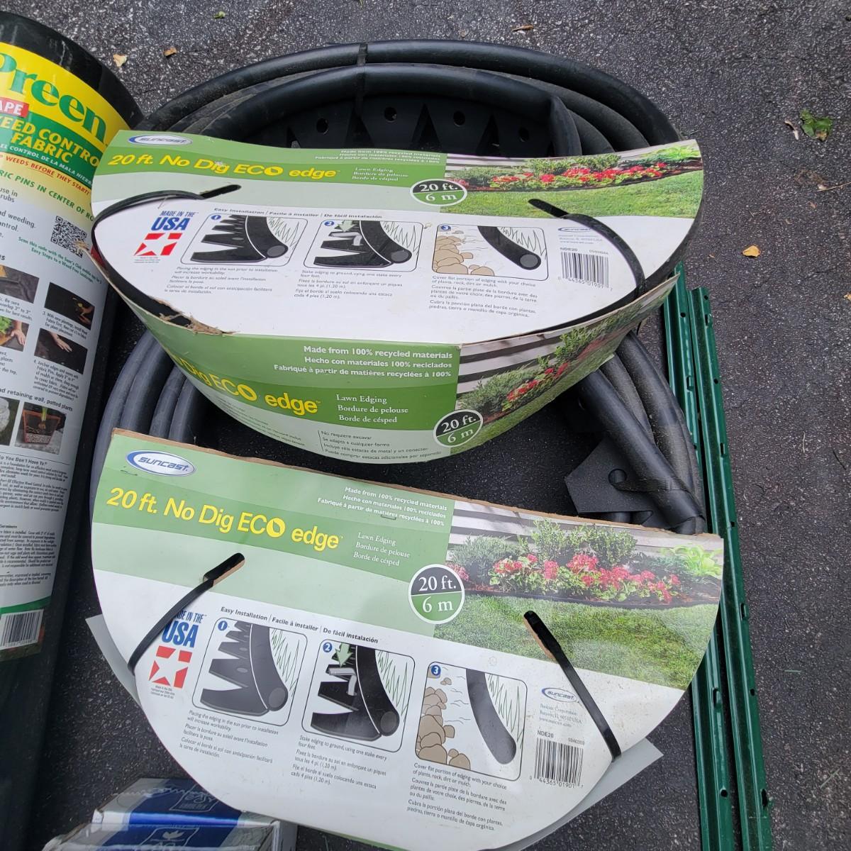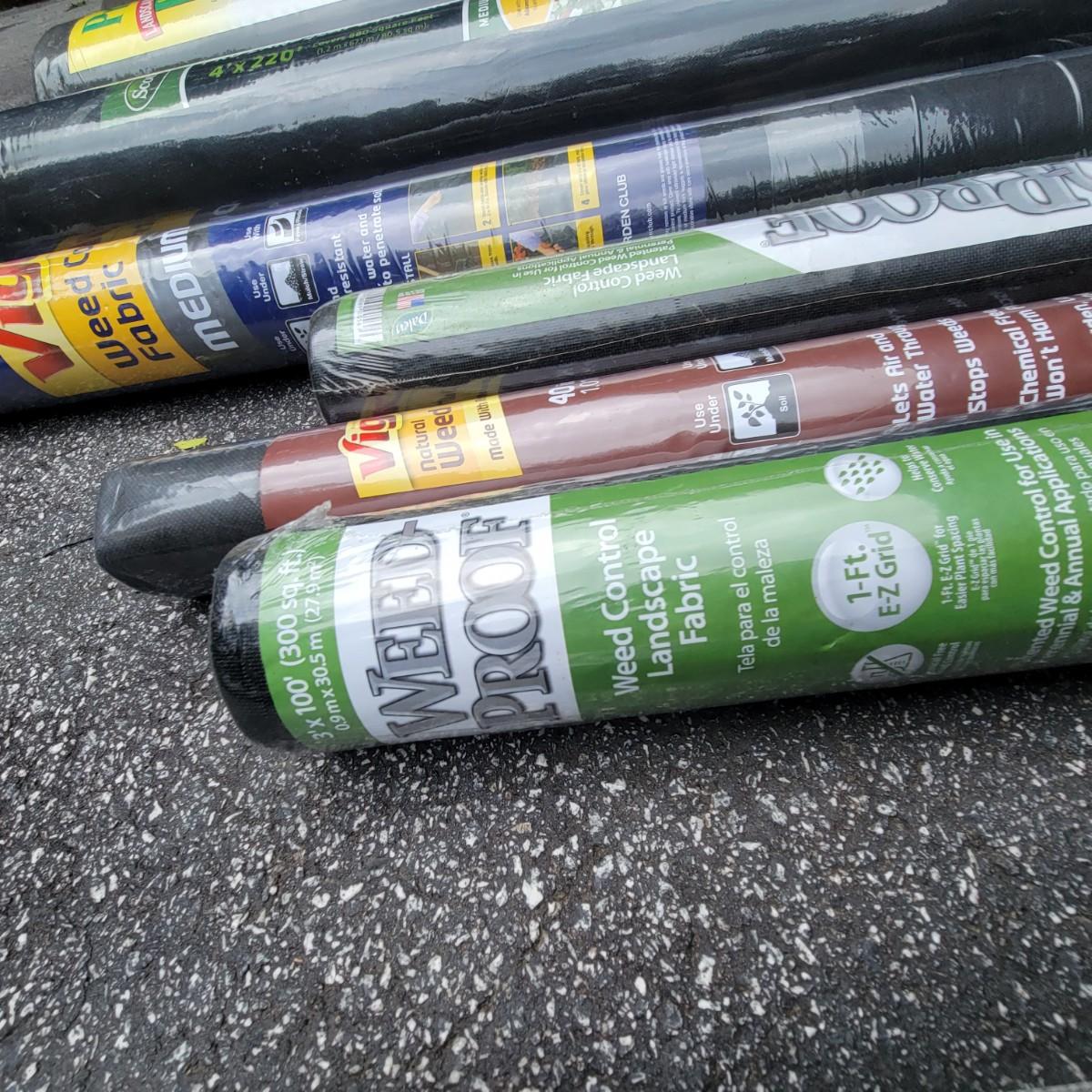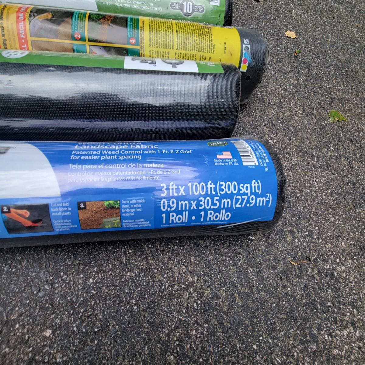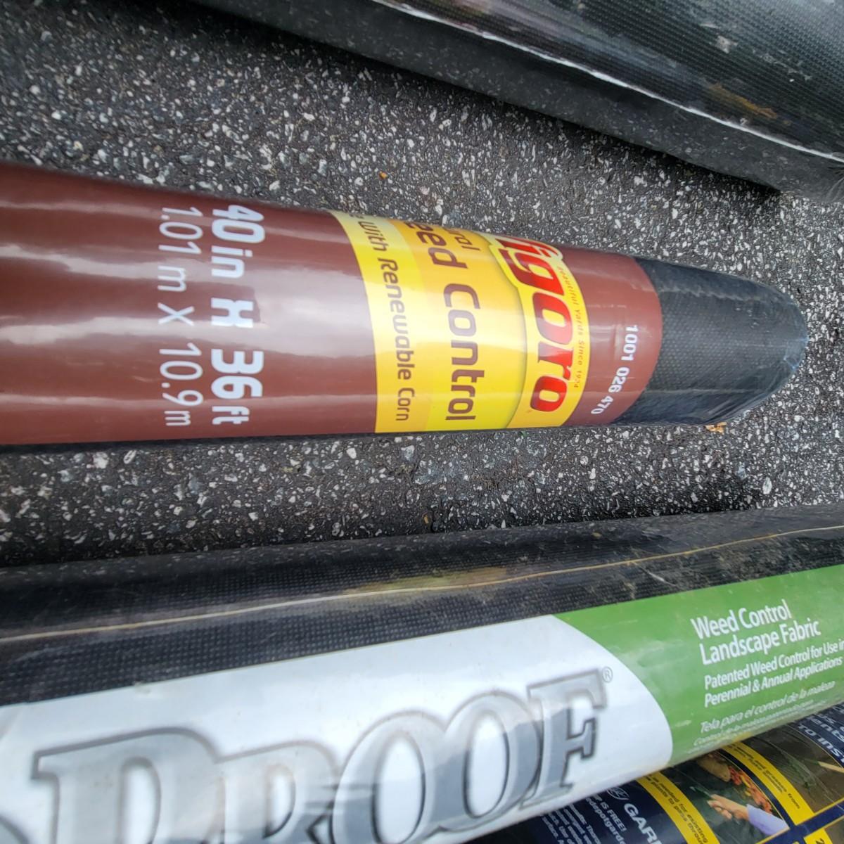 12 rolls of landscaping fabric in a variety of sizes and lengths. The largest are 4' x 225' and all are new except one that has a small amount used. Also includes two 6' posts, lawn fabric pins, flower bed edging and plant labels. Local pickup only.