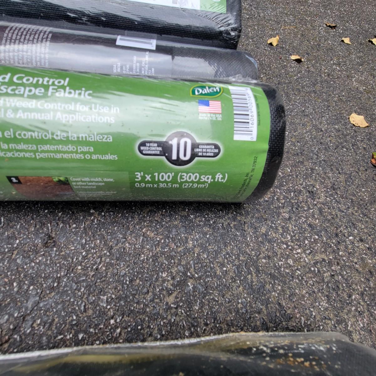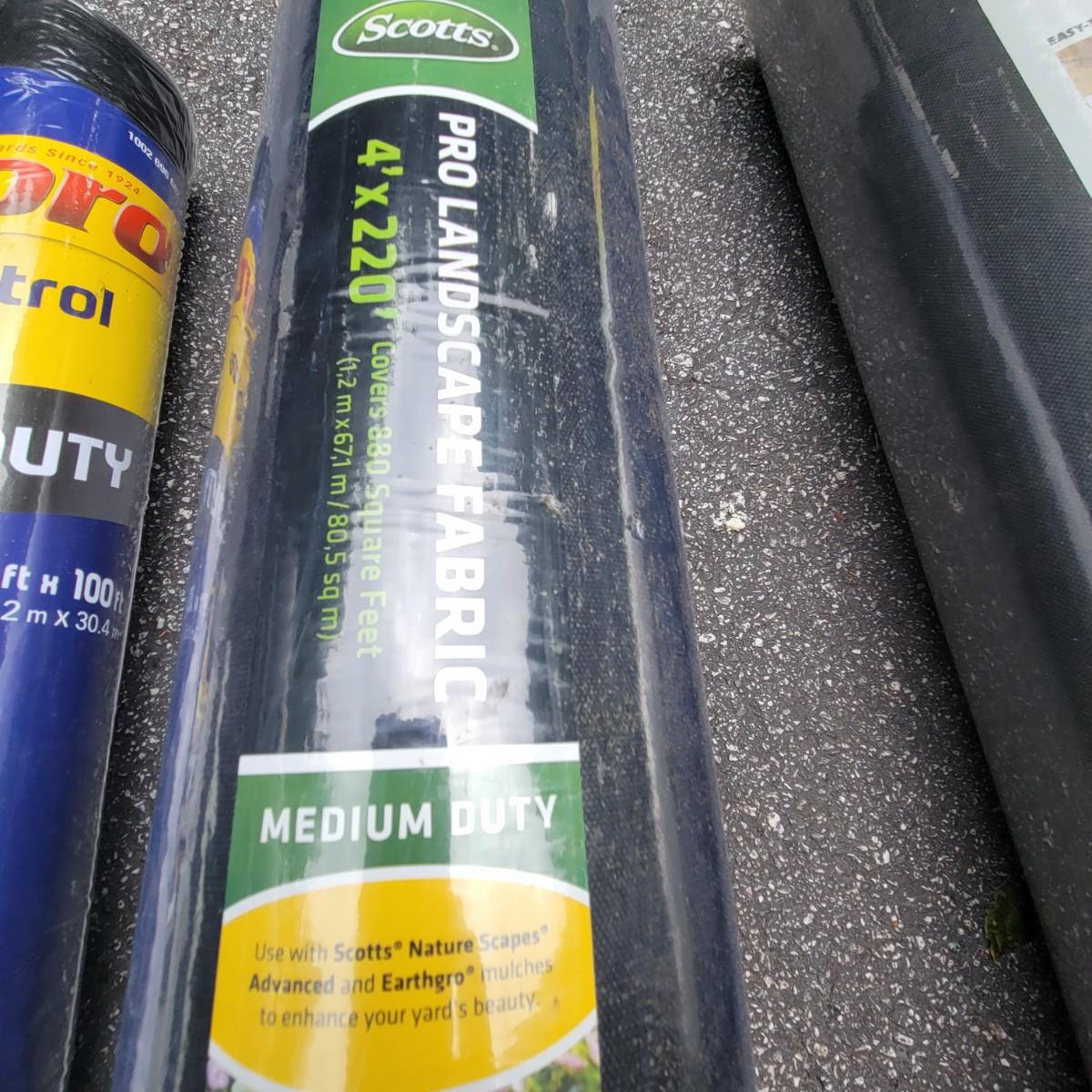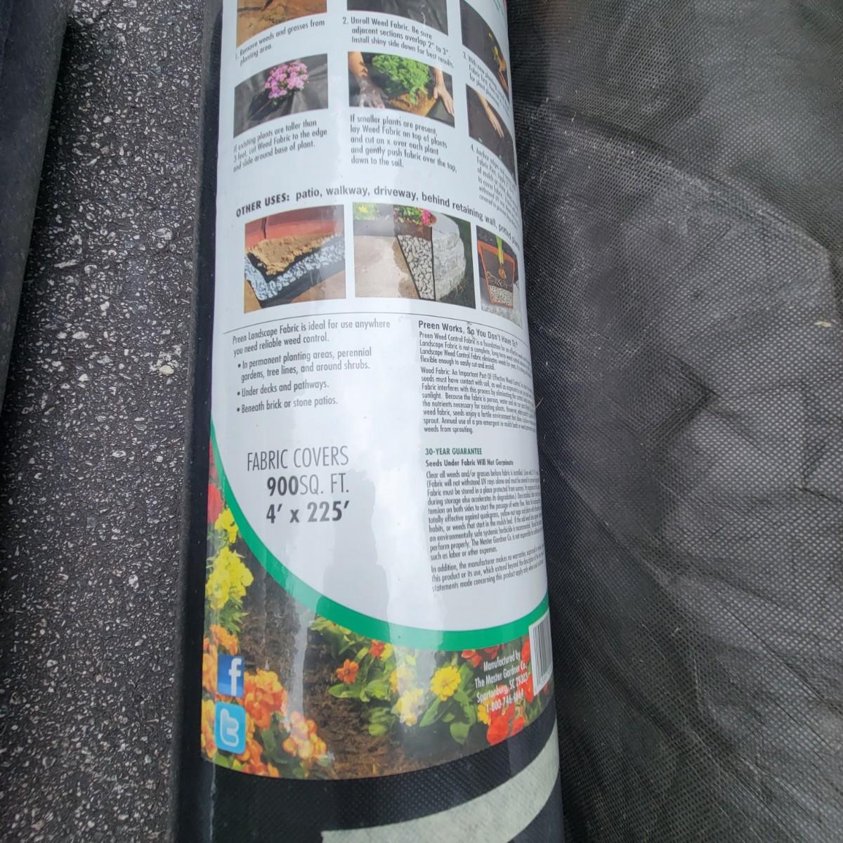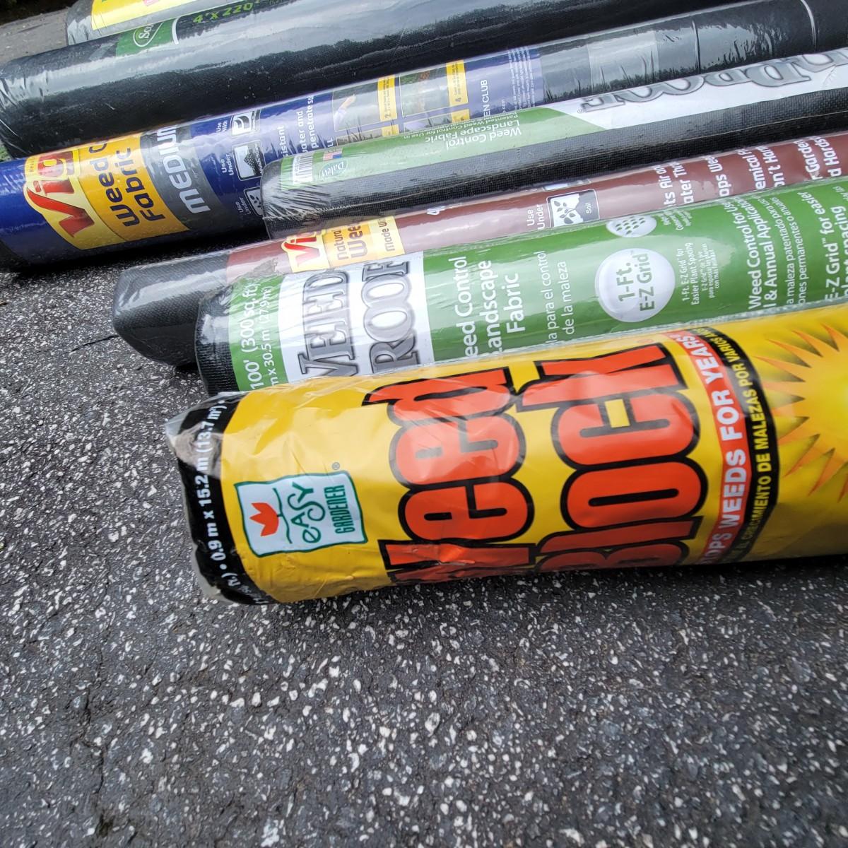 12 rolls of landscaping fabric in a variety of sizes and lengths. The largest are 4' x 225' and all are new except one that has a small amount used. Also includes two 6' posts, lawn fabric pins, flower bed edging and plant labels. Local pickup only.