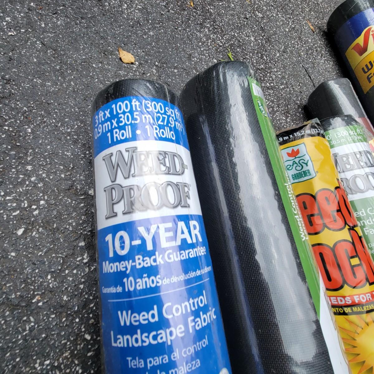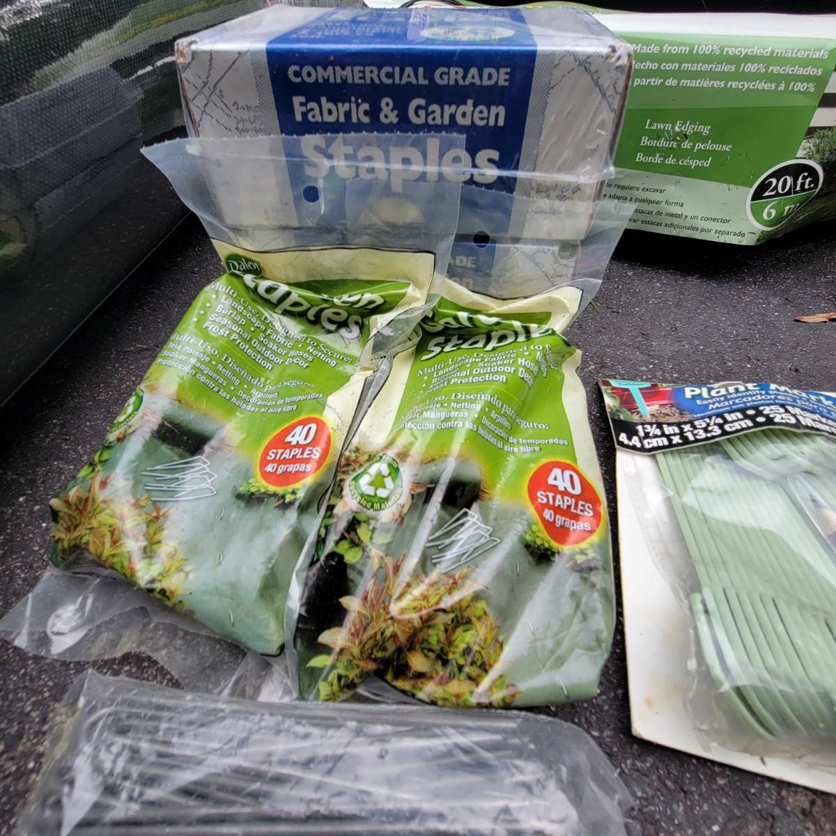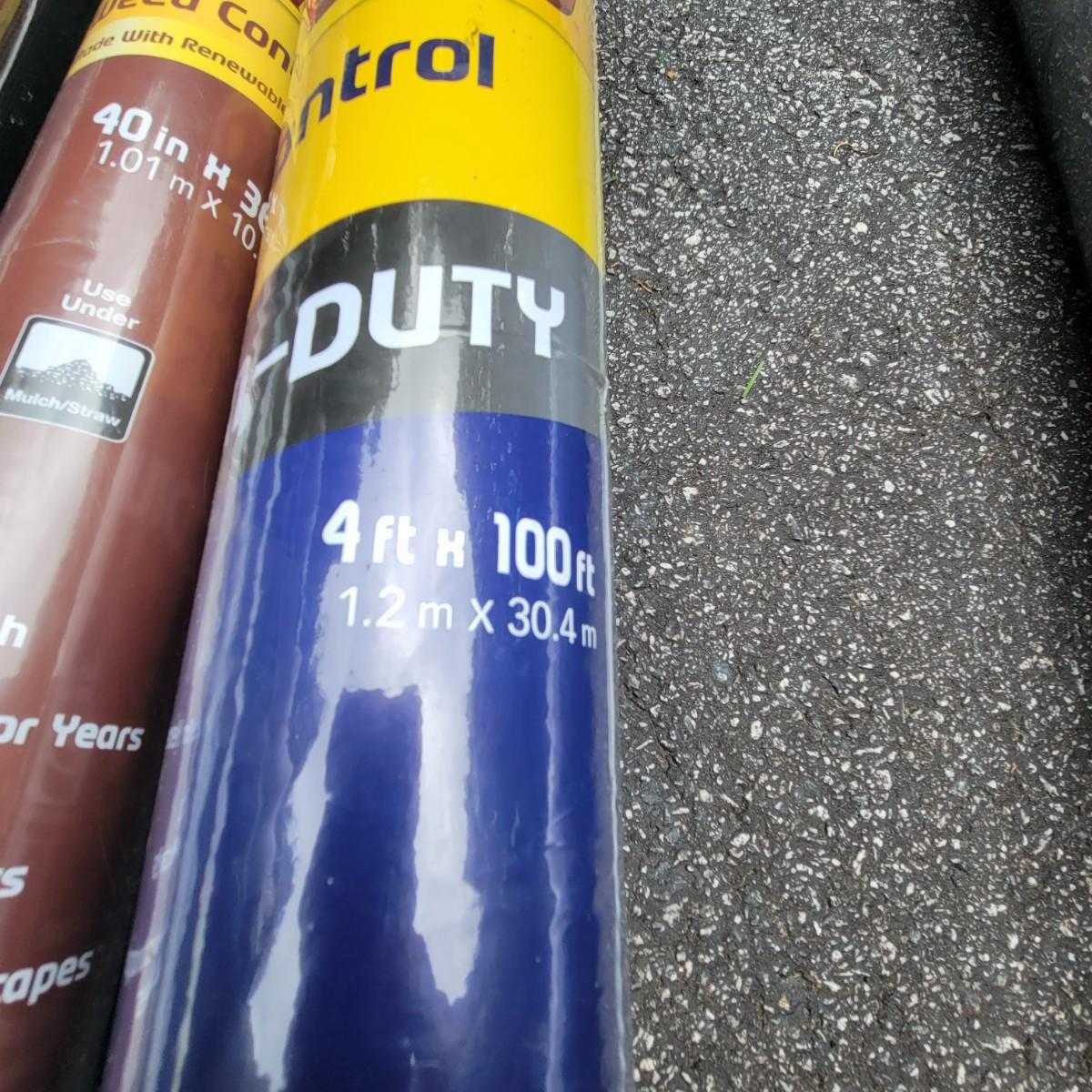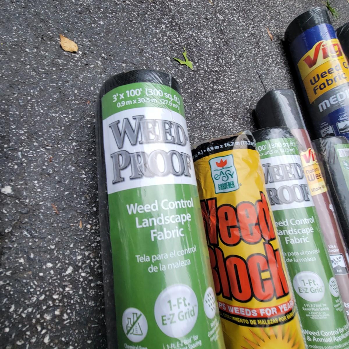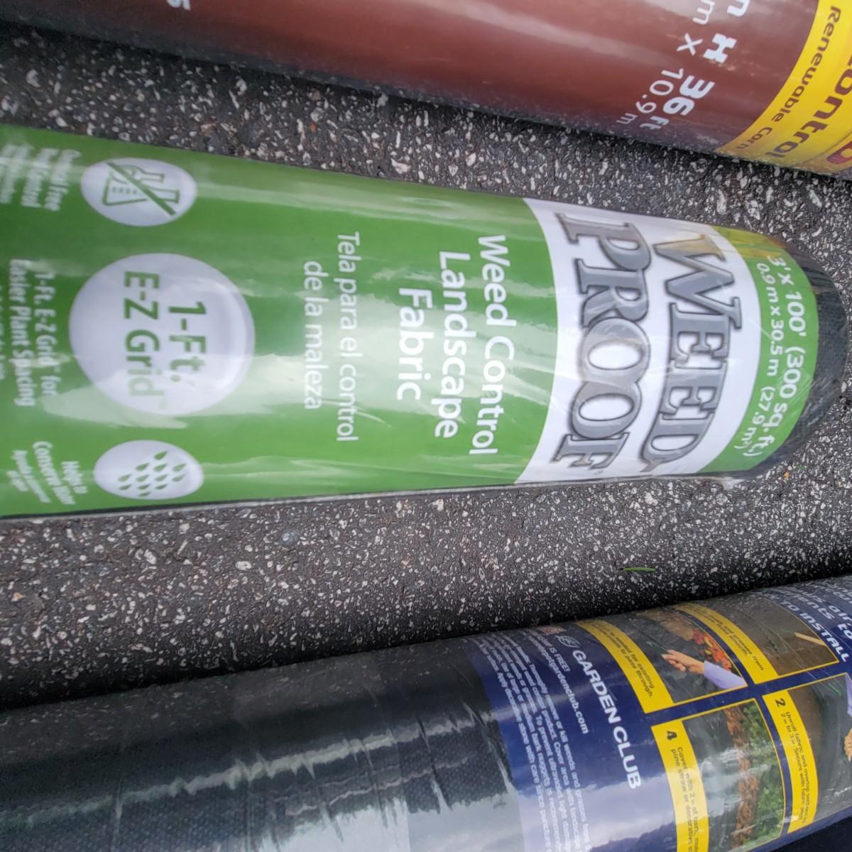 12 rolls of landscaping fabric in a variety of sizes and lengths. The largest are 4' x 225' and all are new except one that has a small amount used. Also includes two 6' posts, lawn fabric pins, flower bed edging and plant labels. Local pickup only.