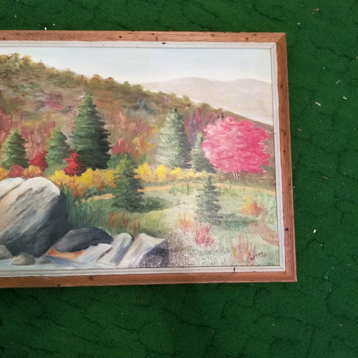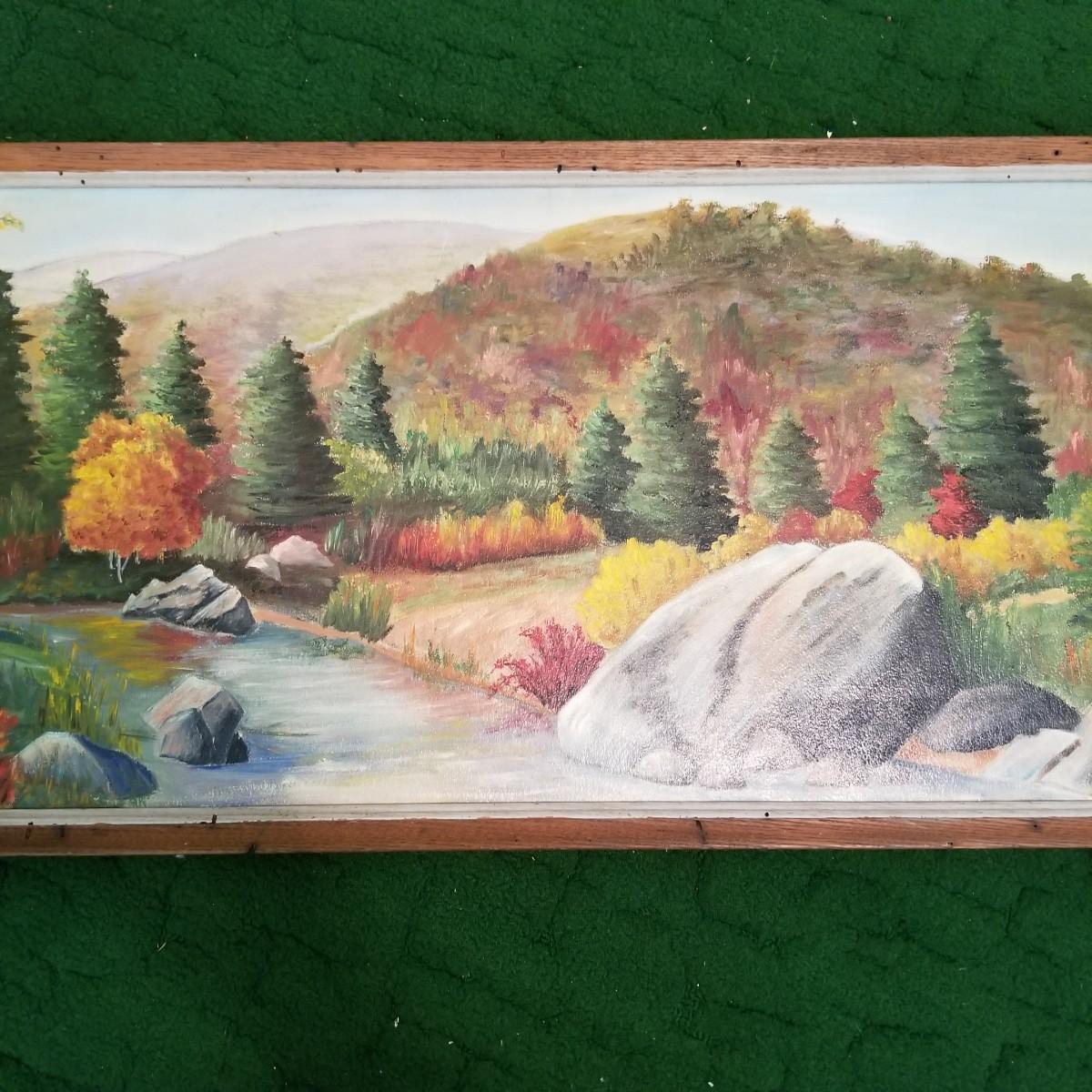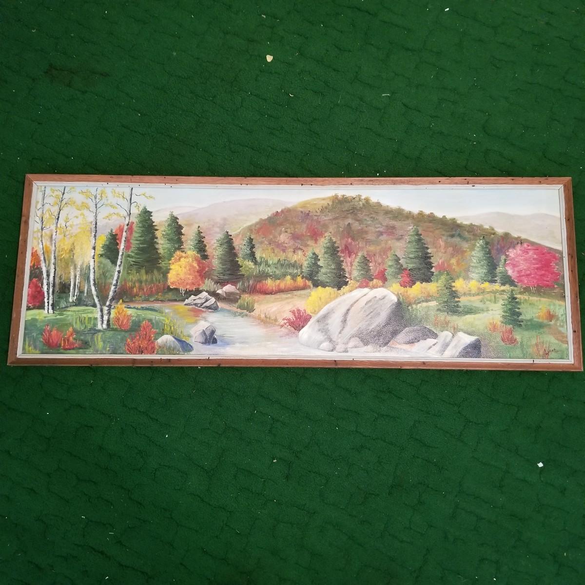 A large landscape, rocks stream and mountains. Oil is signed "Lucas". Wood frame, no glass. Painting measures 17" x50".  See photos for detail. Shipping Art can be costly please call UPS store at 828-252-6930 for quote.