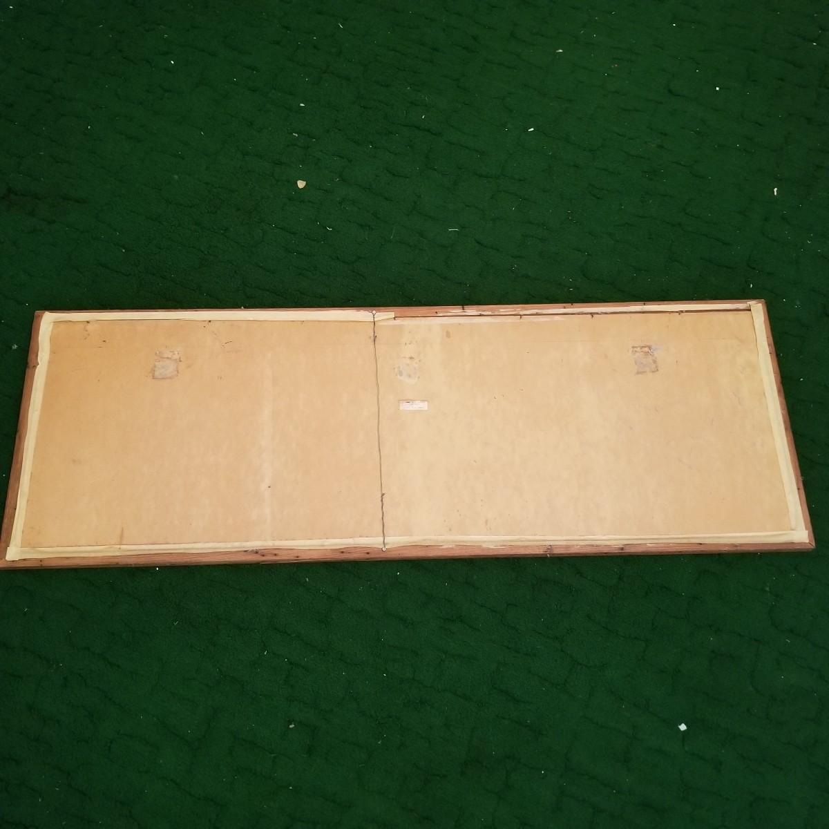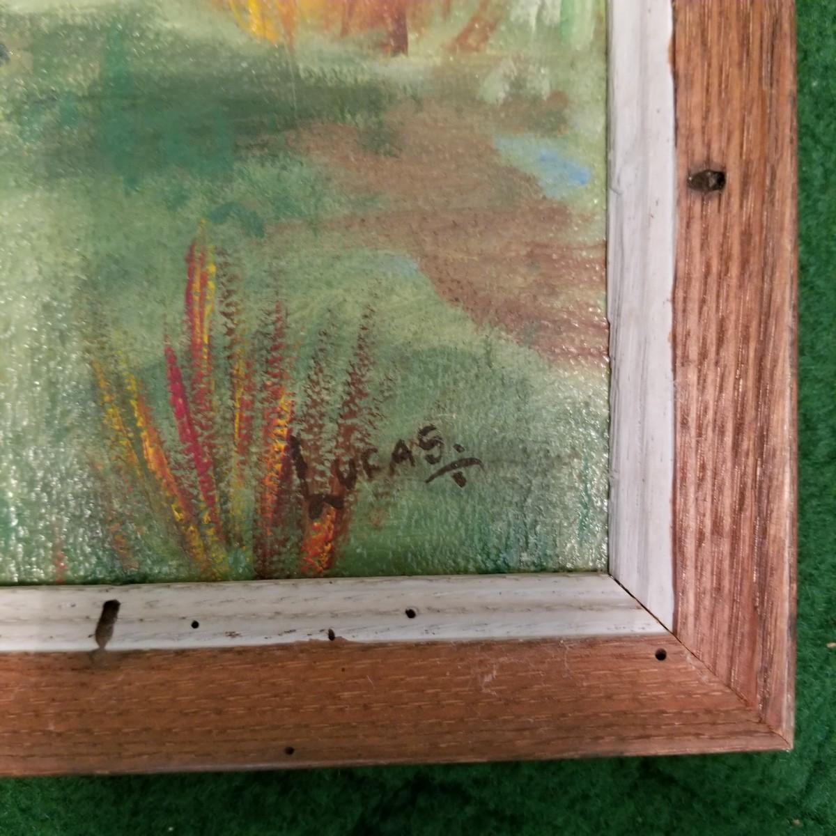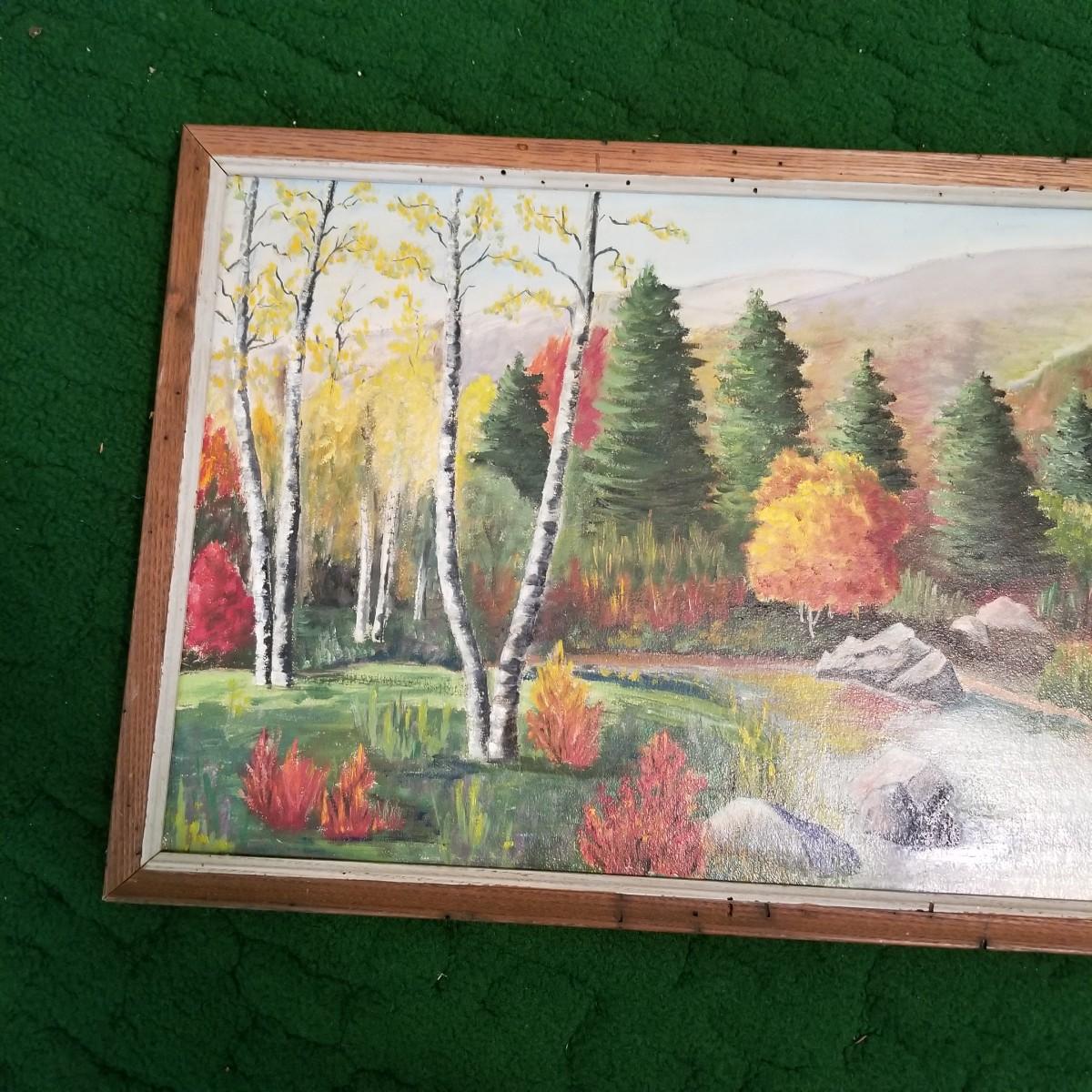 A large landscape, rocks stream and mountains. Oil is signed "Lucas". Wood frame, no glass. Painting measures 17" x50".  See photos for detail. Shipping Art can be costly please call UPS store at 828-252-6930 for quote.