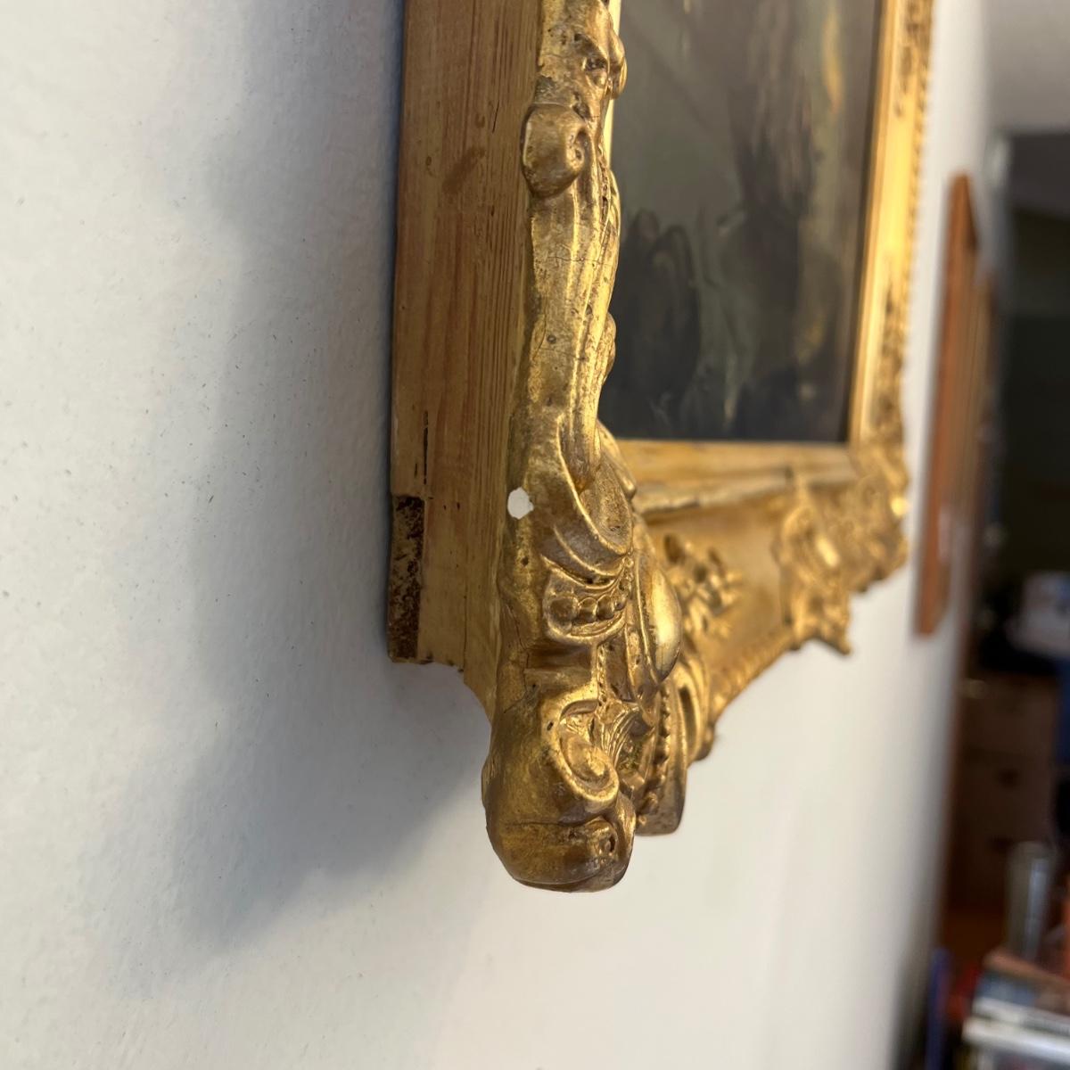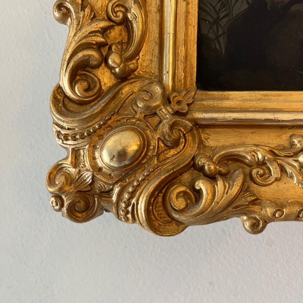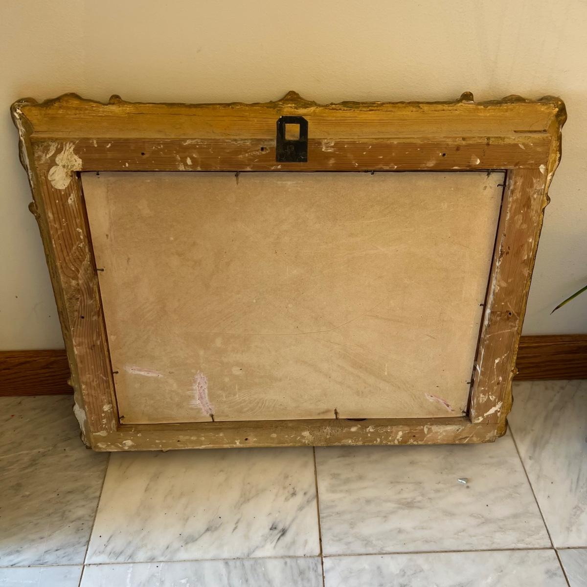 This art appears to be a painting on board and is housed in a very ornate gilded wooden frame (no glass). The frame has a few nicks but they are not visible from the front view.