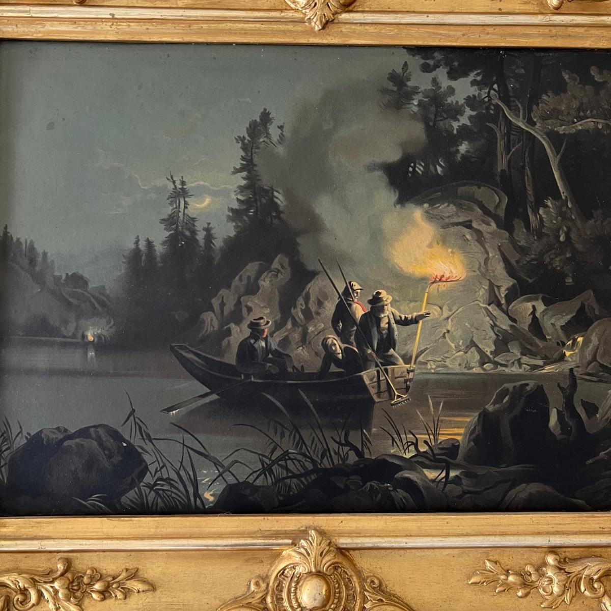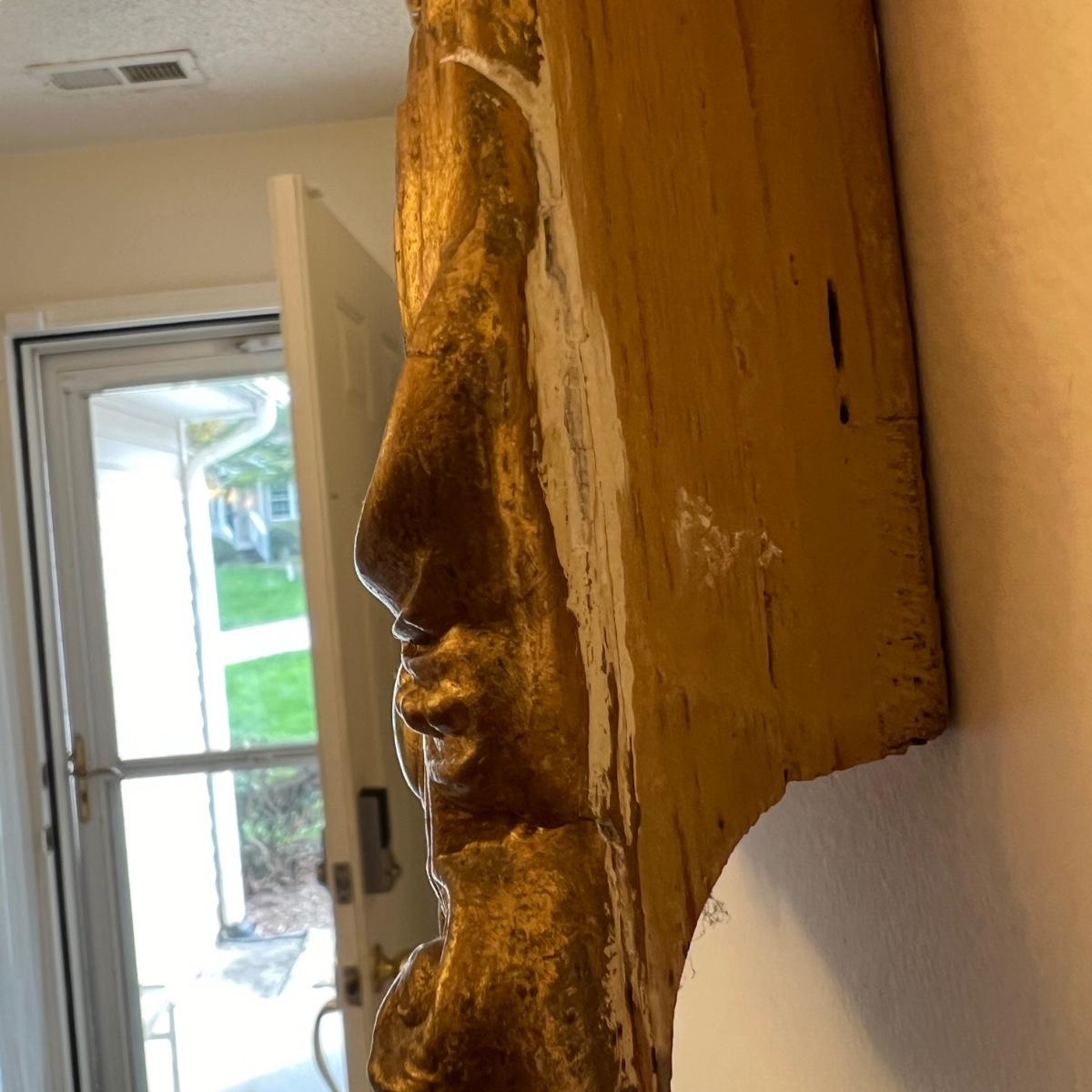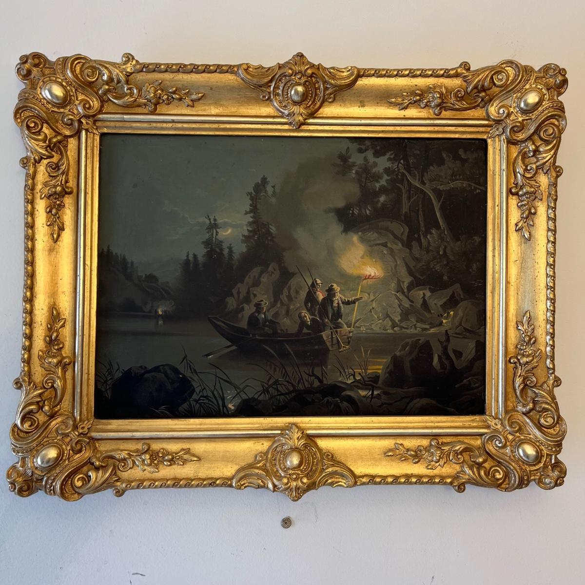 This art appears to be a painting on board and is housed in a very ornate gilded wooden frame (no glass). The frame has a few nicks but they are not visible from the front view.