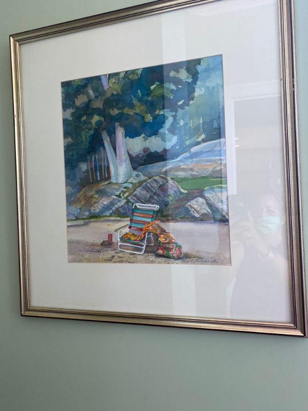 Landscape Watercolor Painting by Gail Gilchrist depicting landscape of beach with low beach chair and rocks and trees in background signed lower right measures 23.5" x 26"