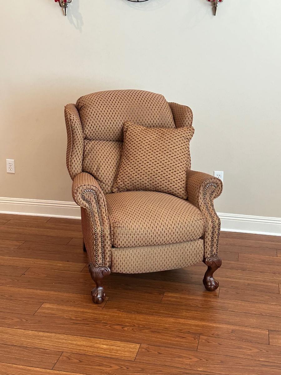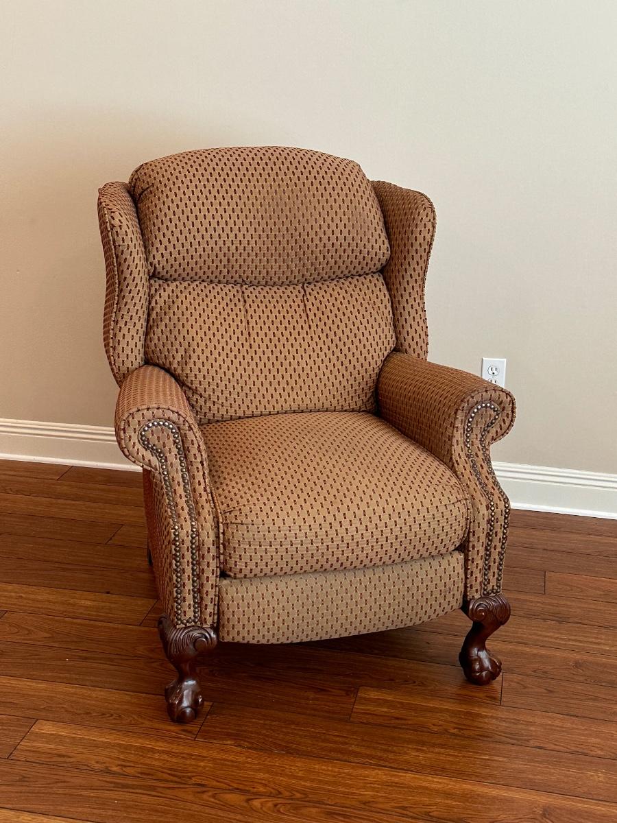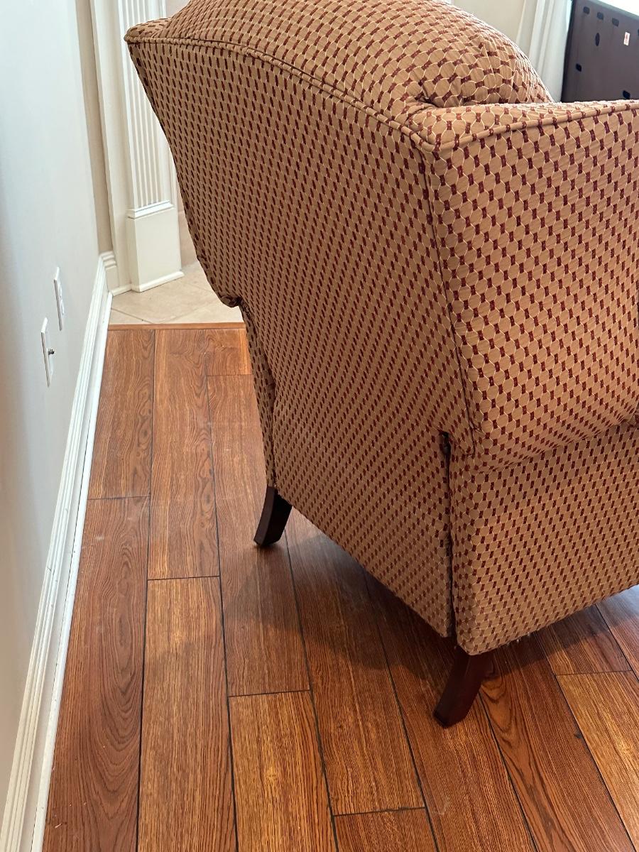 Chair has normal wear and can also be used as a recliner, however, as seen in photo, the bottom of the foot rest needs to be recovered. Arm rests show minor wear from use. Has been deodorized, sanitized & disinfected for your protection. No smoking, no pets 43” H x 35” W x 39” D ~ Color is a dark taupe with a burgundy/wine pattern.