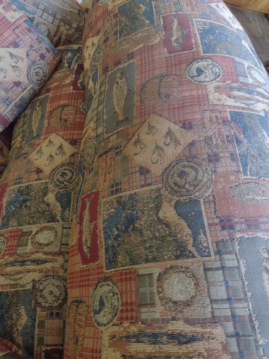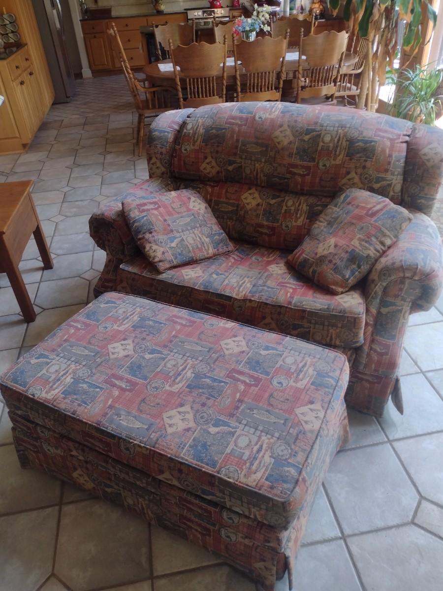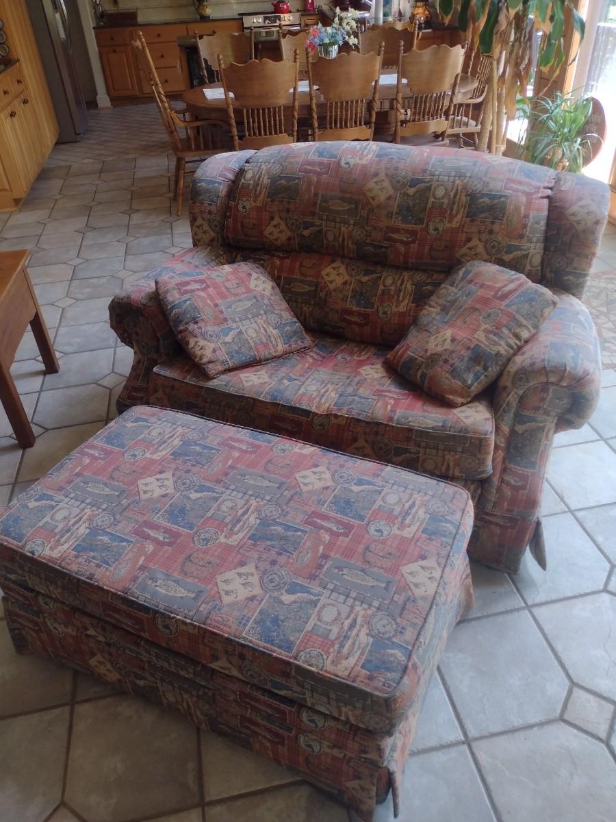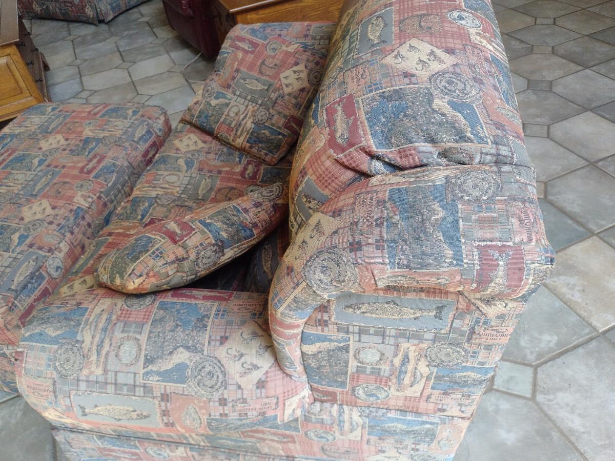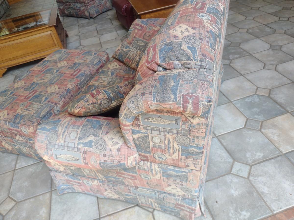 Lane Brand Oversized Sleeper Chair with Fishing Themed Upholstery Includes Storage Design Ottoman Choice B, Has some picks to the upholstery from a cat but no tearing or shredding as pictured.