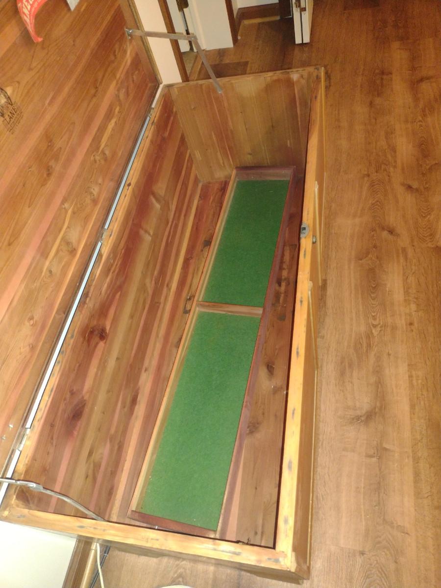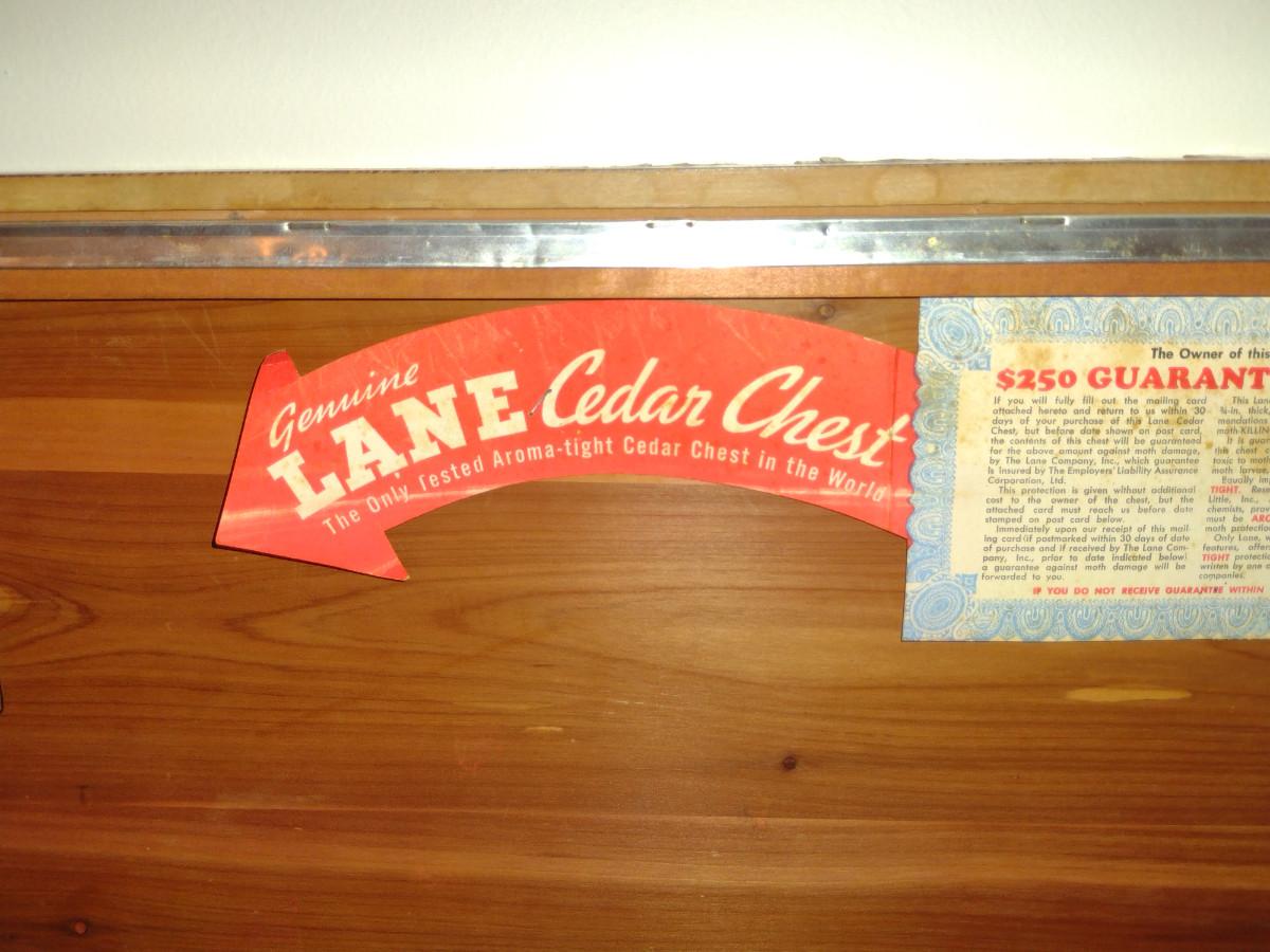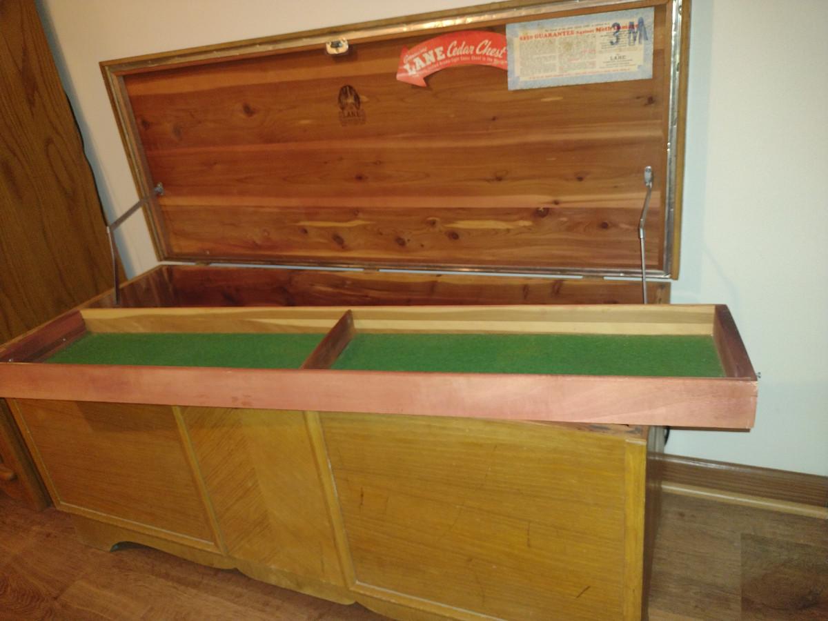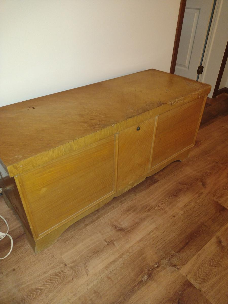 Lane Cedar Blanket Chest. Insert shown is smaller than interior and does not connect. Item has areas of de-lamination - please see all pictures.