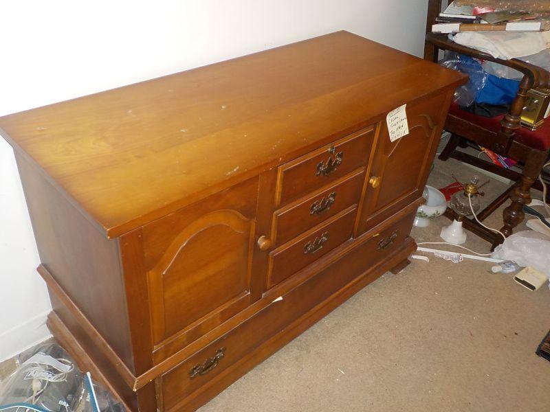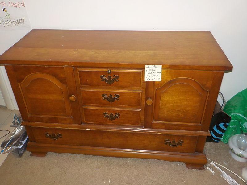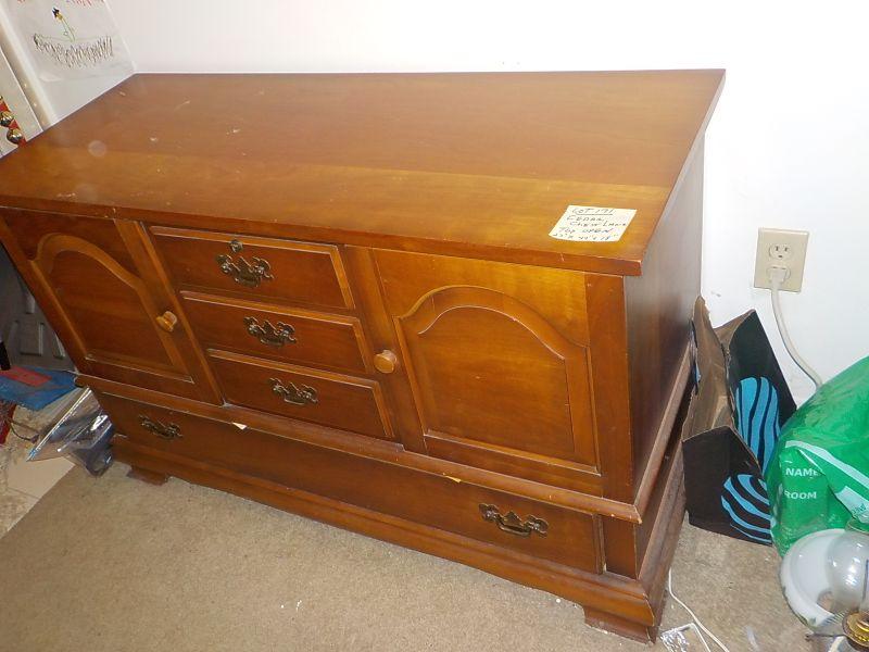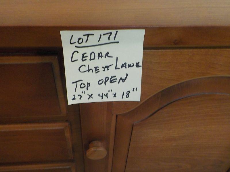 Top open lane cedar chest sz. 27 x 18 x 44. no stains or scratches and opens from top with bottom drawer.
