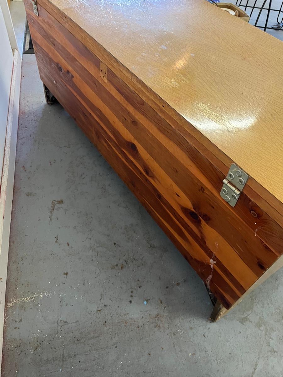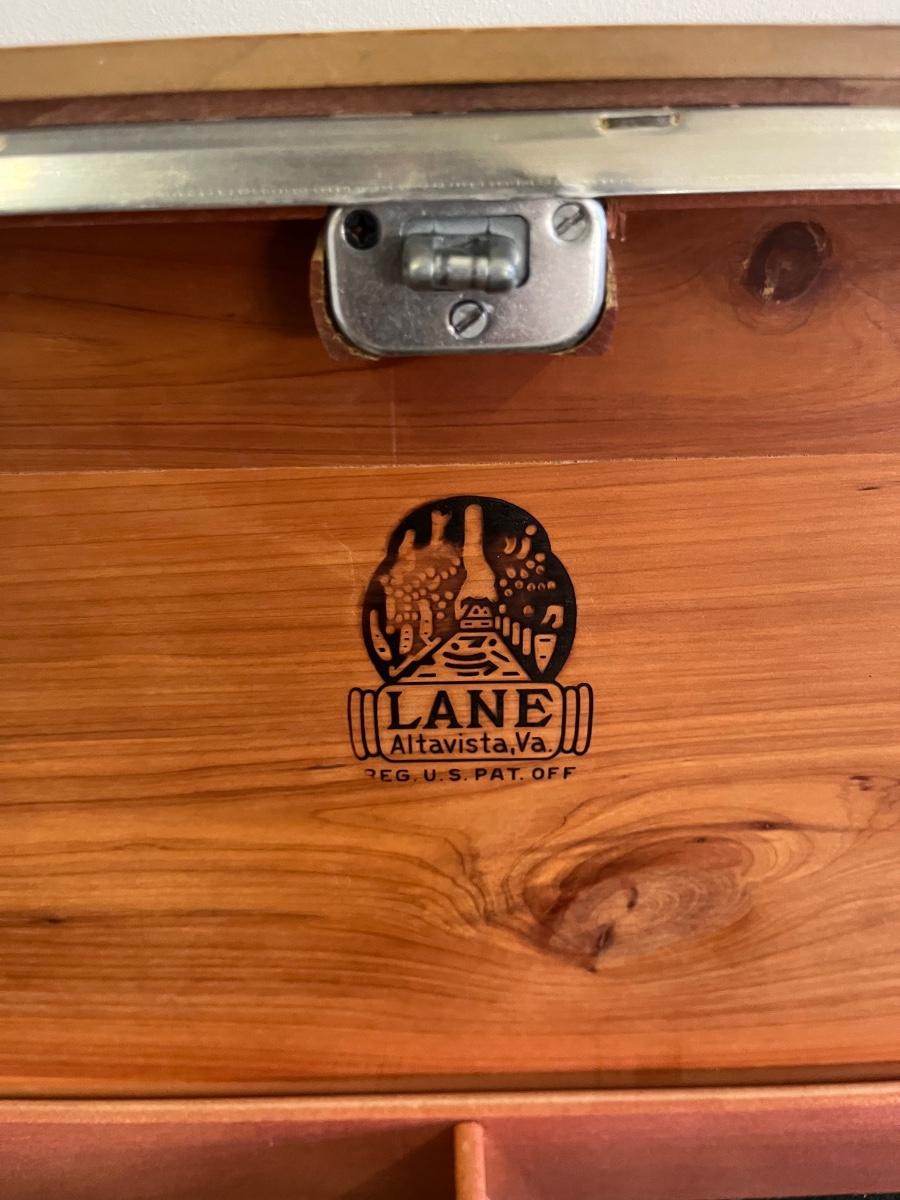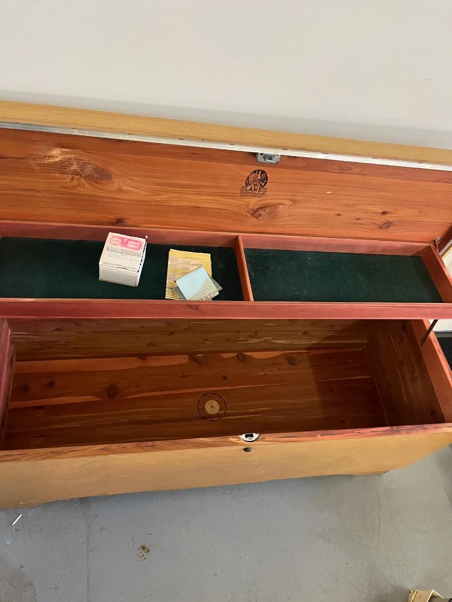 Lot includes a Lane cedar chest that measures 17.5” x 47” x 20”. Chest has one shelf lined with felt. Top of chest is worn, see pictures. Please note that Lane had several recalls on chests for locks. You can go to Lane.com to see if this chest needs a replacement lock. There is no charge for replacement. This is a safety recall and we cannot verify that this one has been done.