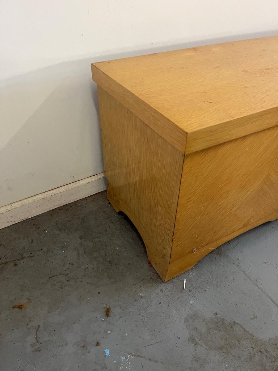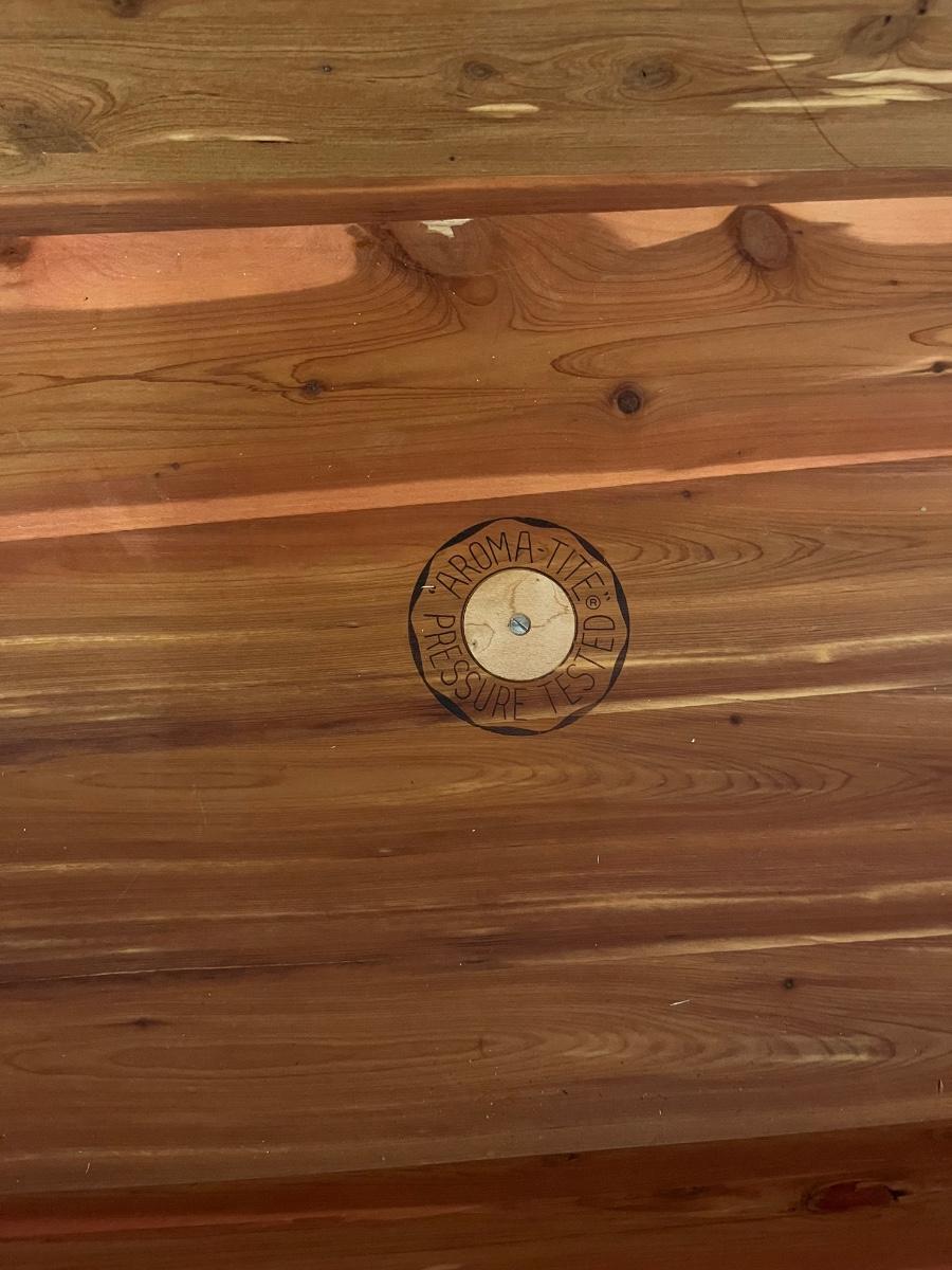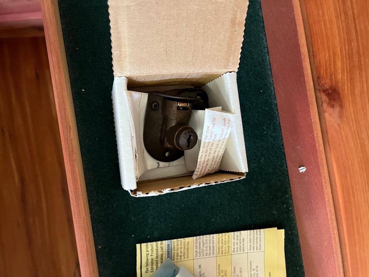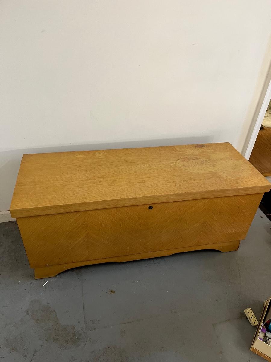 Lot includes a Lane cedar chest that measures 17.5” x 47” x 20”. Chest has one shelf lined with felt. Top of chest is worn, see pictures. Please note that Lane had several recalls on chests for locks. You can go to Lane.com to see if this chest needs a replacement lock. There is no charge for replacement. This is a safety recall and we cannot verify that this one has been done.