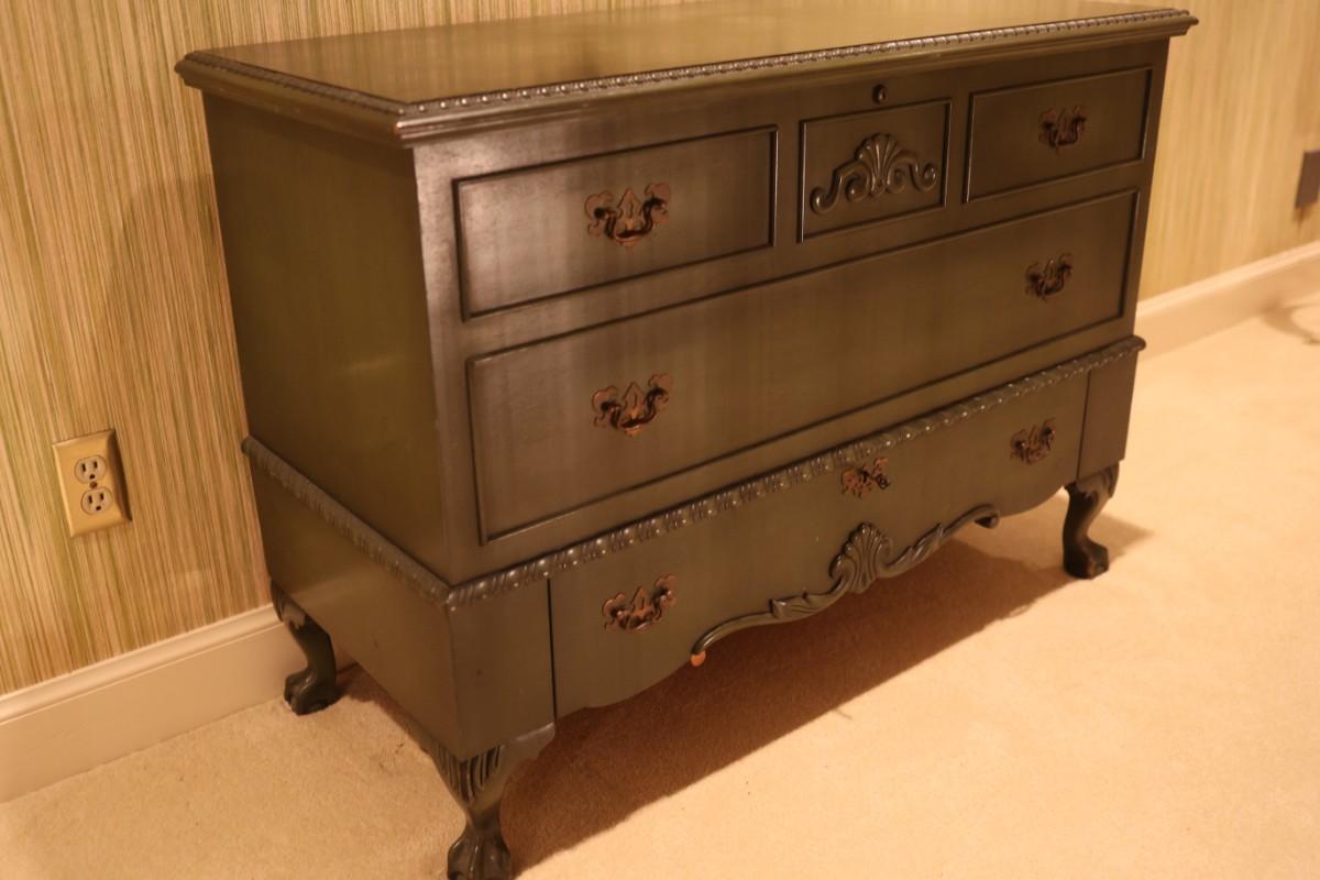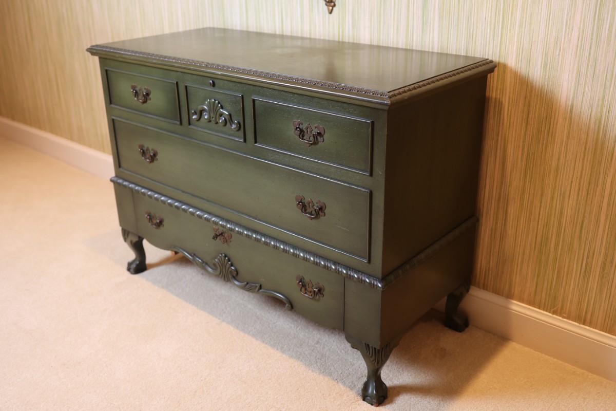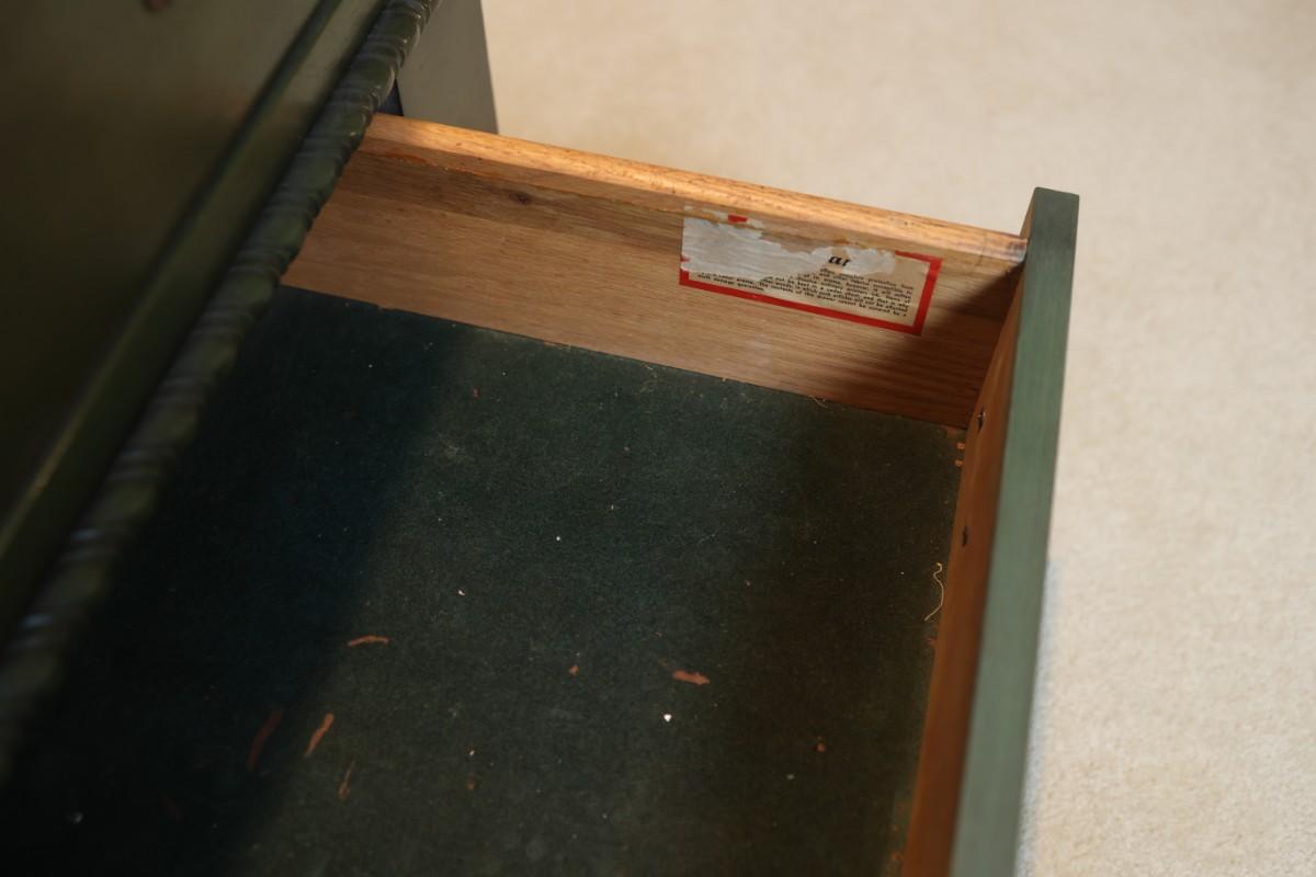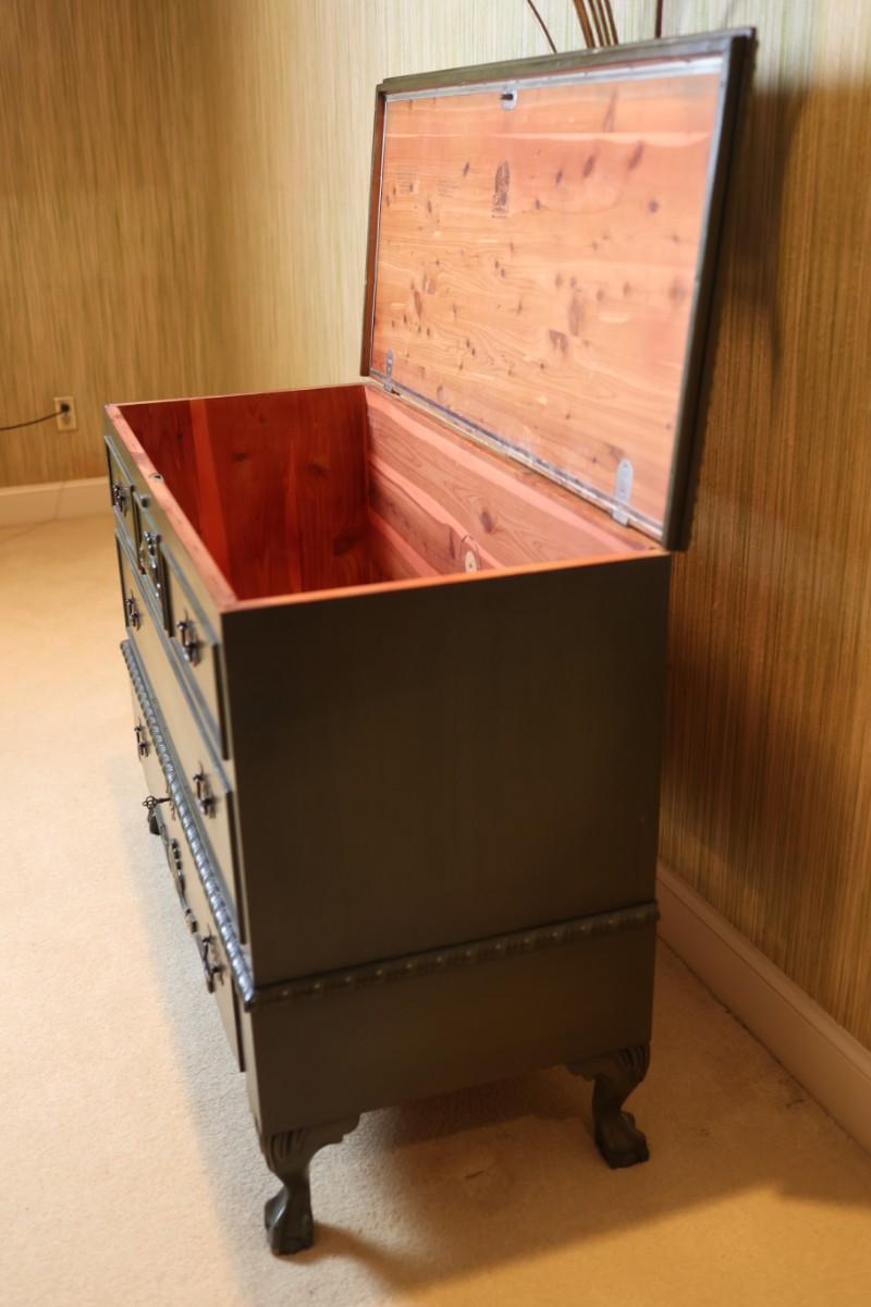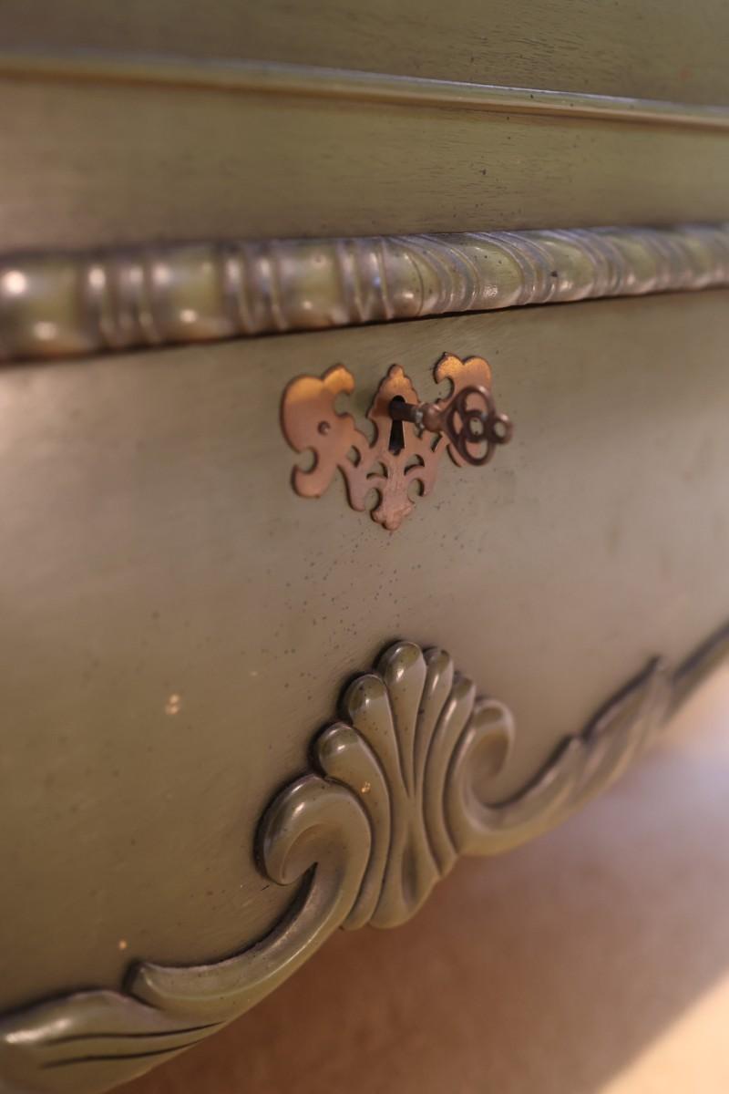 Key for drawer and chest included. There is a chip of the wood on the bottom decor. Light scratches on the edges of surface, see pictures.