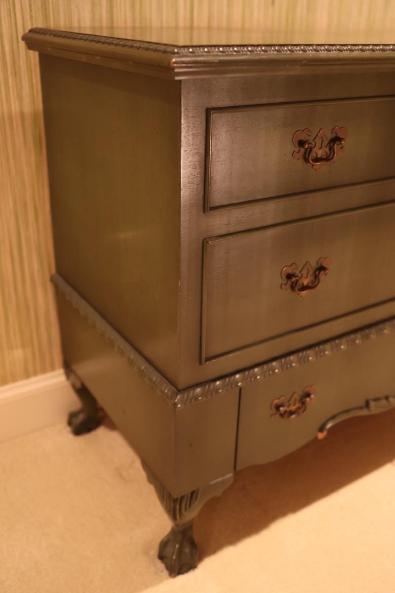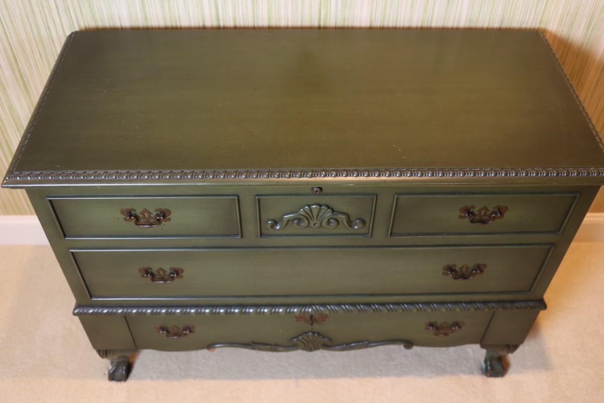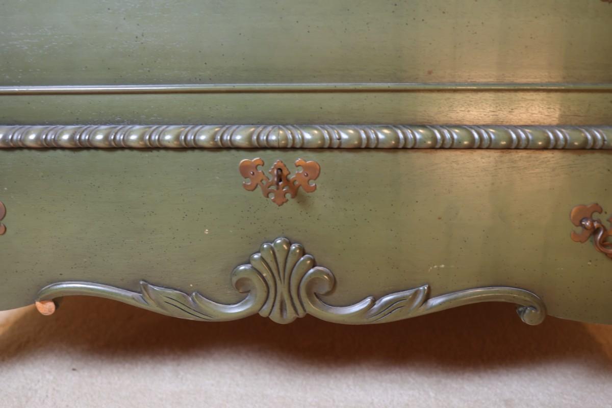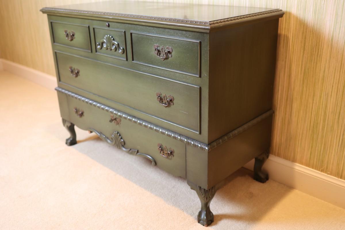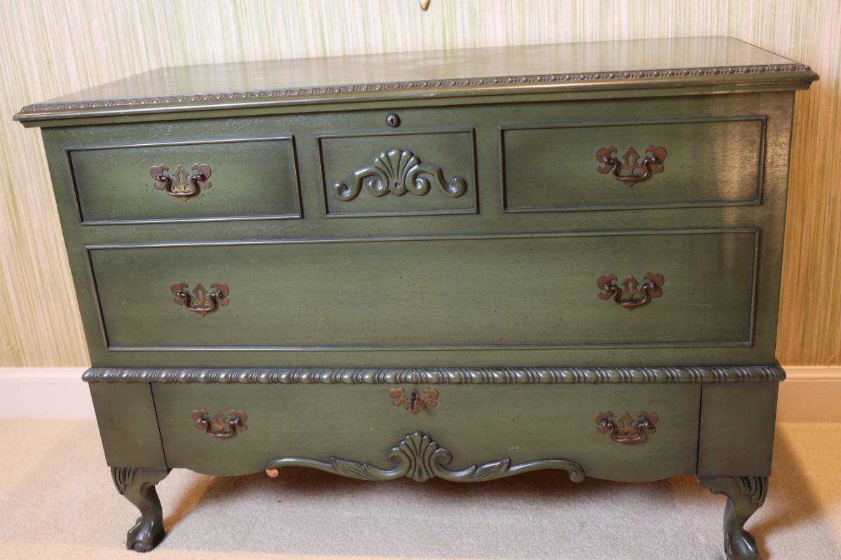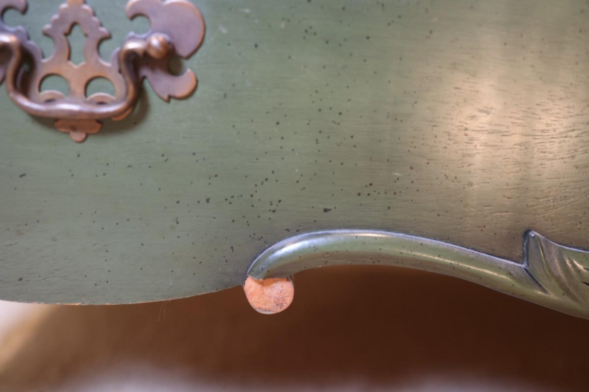Key for drawer and chest included. There is a chip of the wood on the bottom decor. Light scratches on the edges of surface, see pictures.