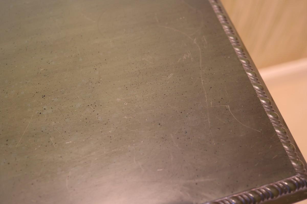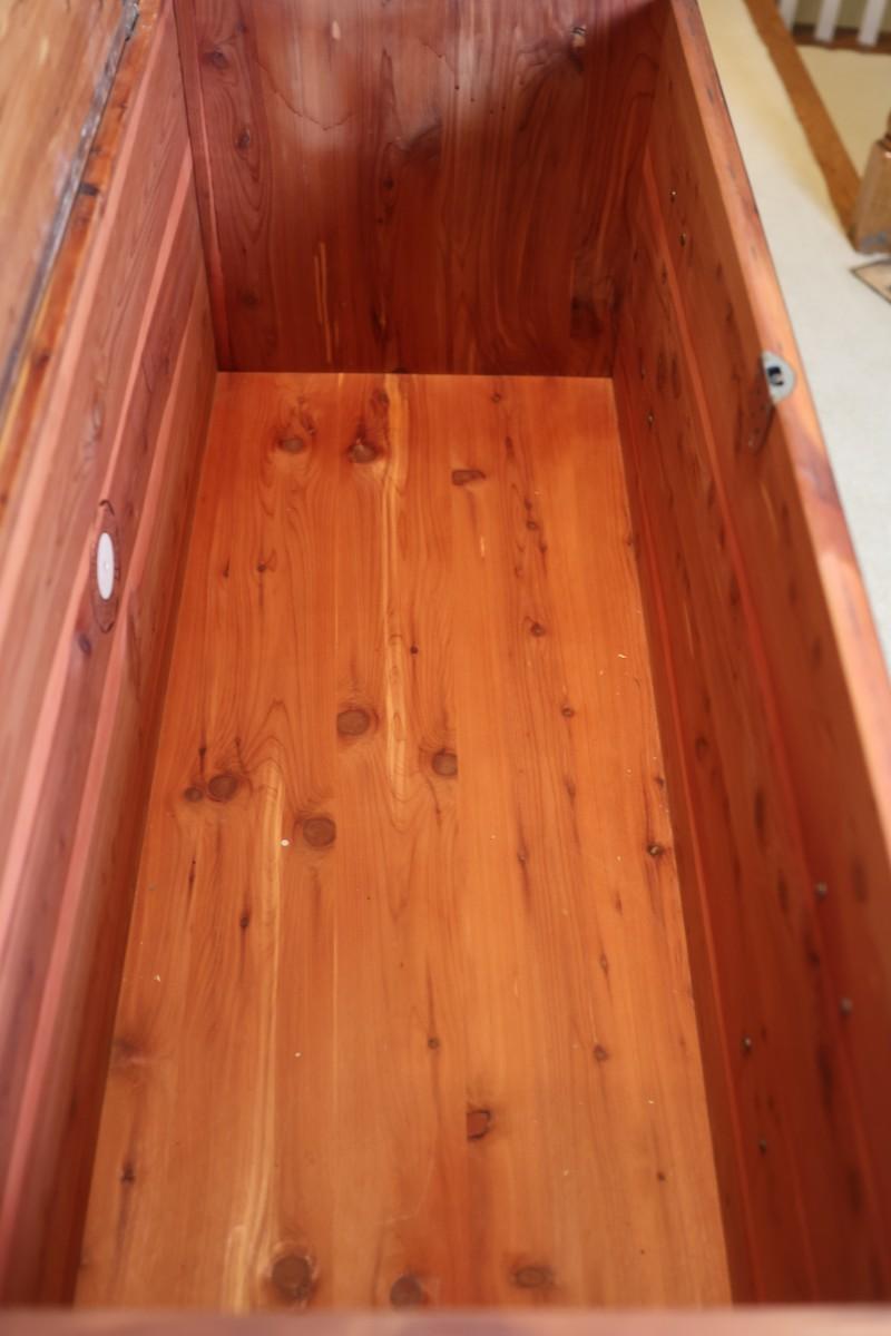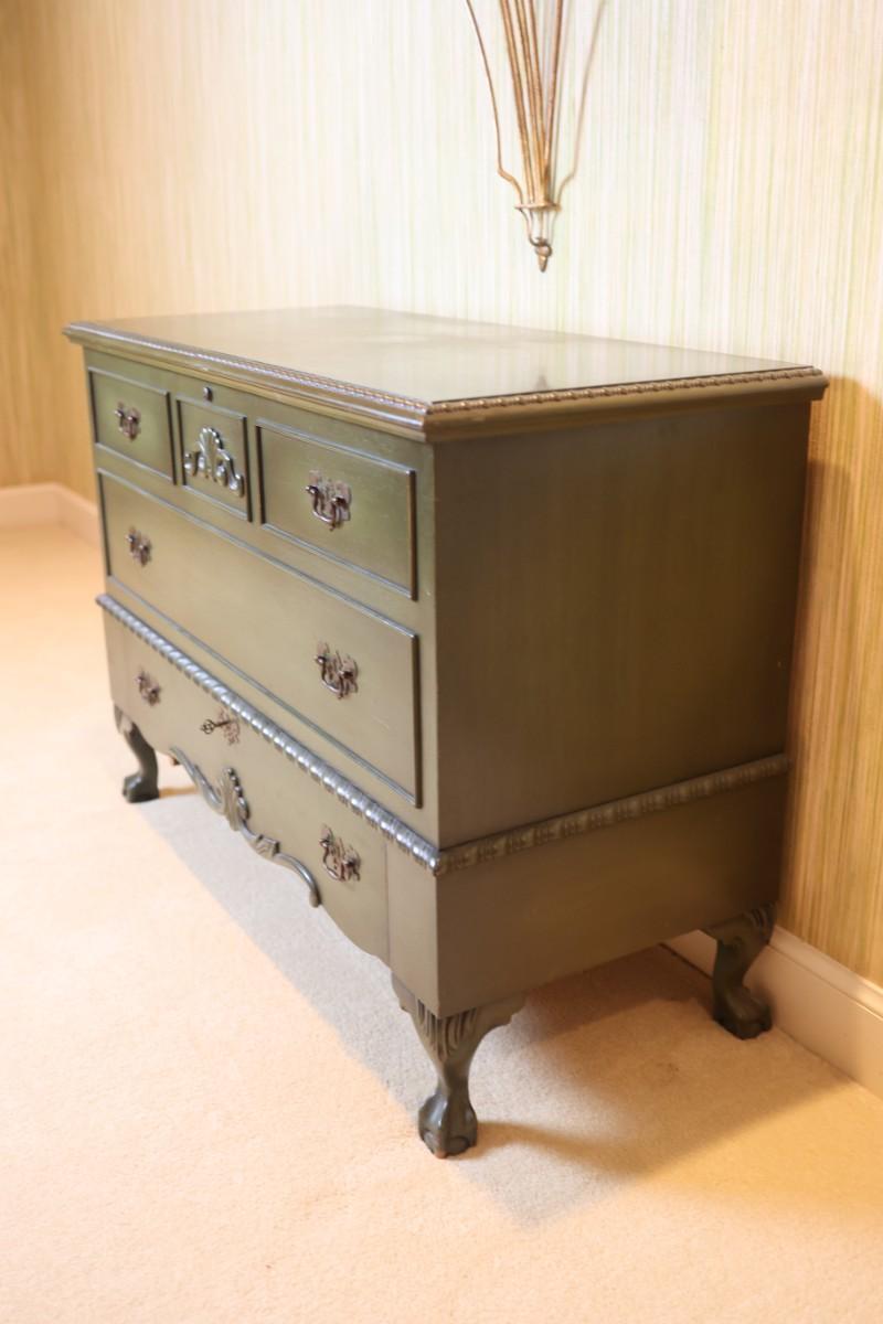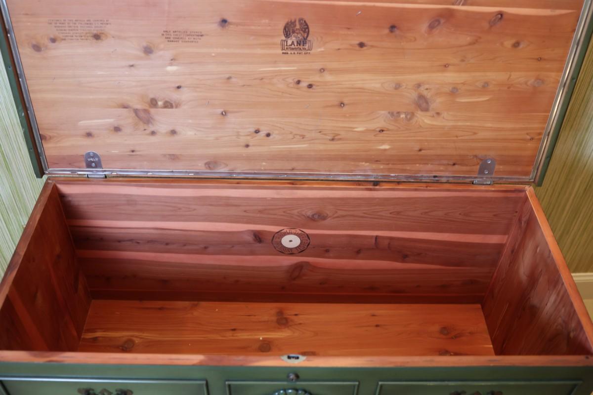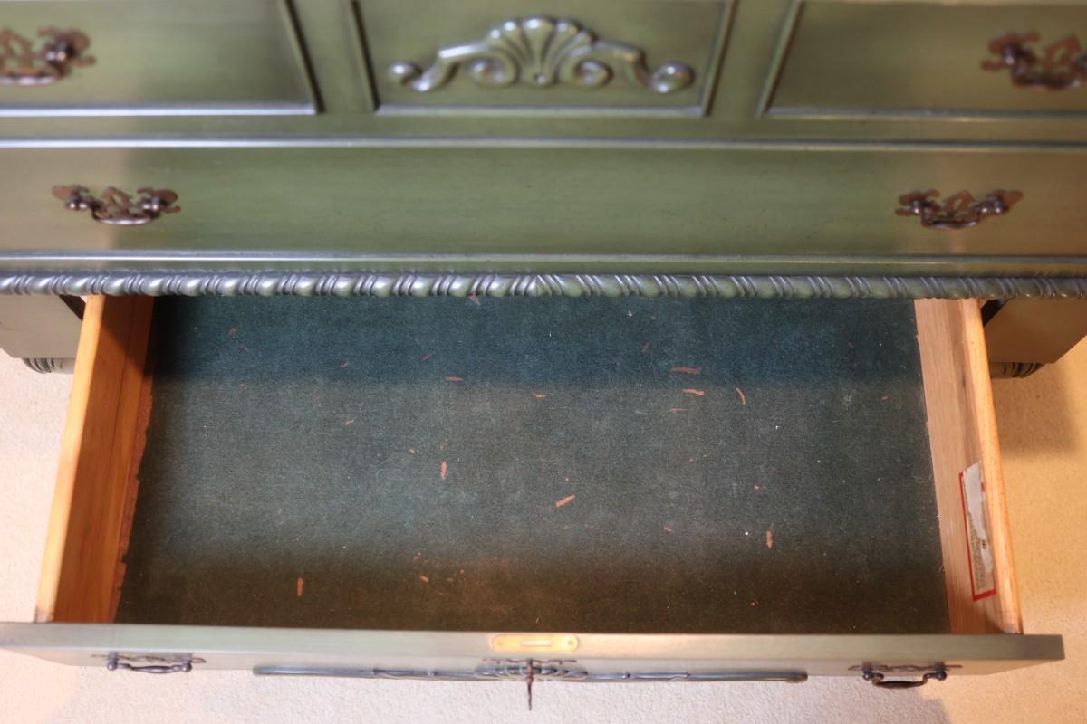 Key for drawer and chest included. There is a chip of the wood on the bottom decor. Light scratches on the edges of surface, see pictures.