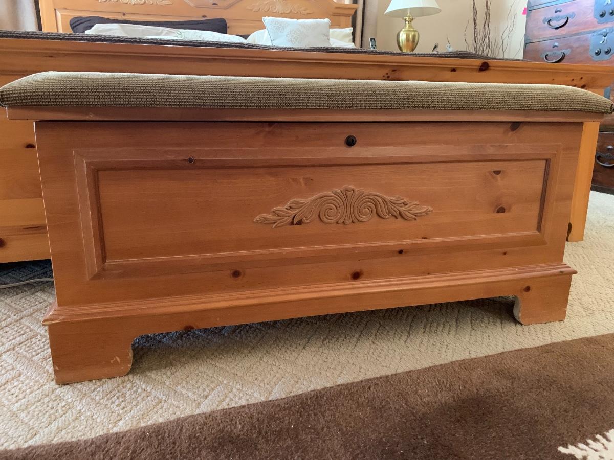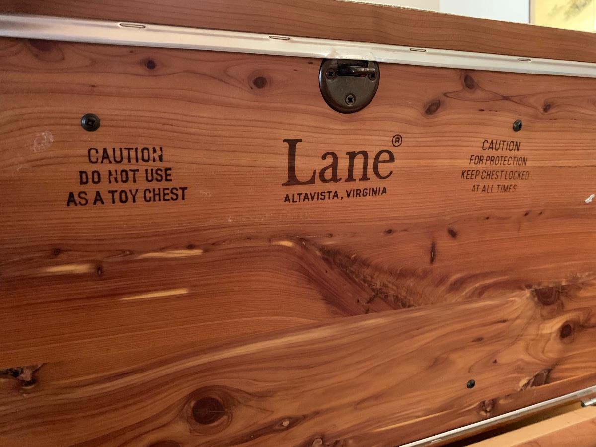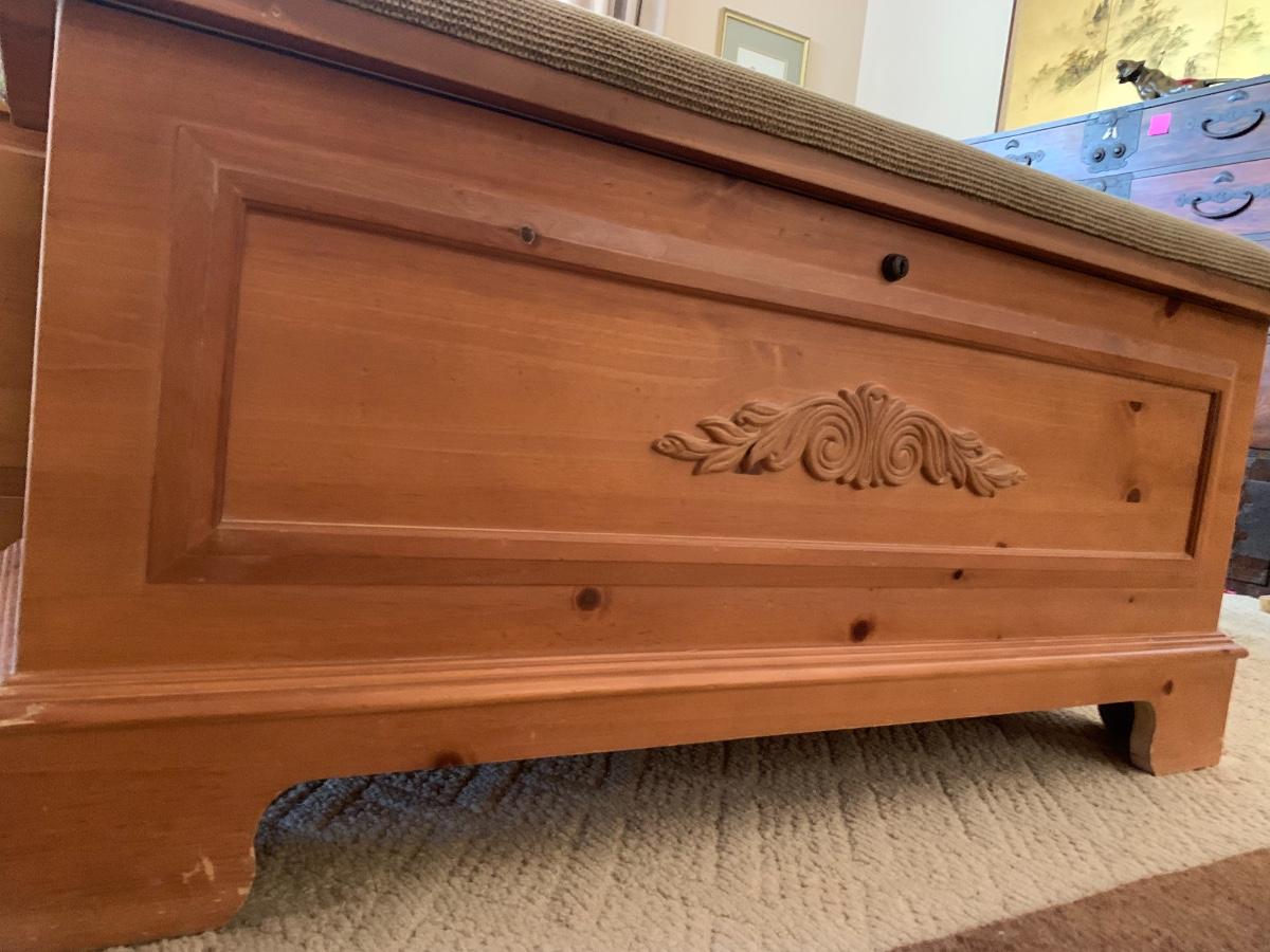 Lane chest in great condition with push lock (no key), front wood carving, and padded top. 43 inches long, 15 inches deep, 20 inches in height