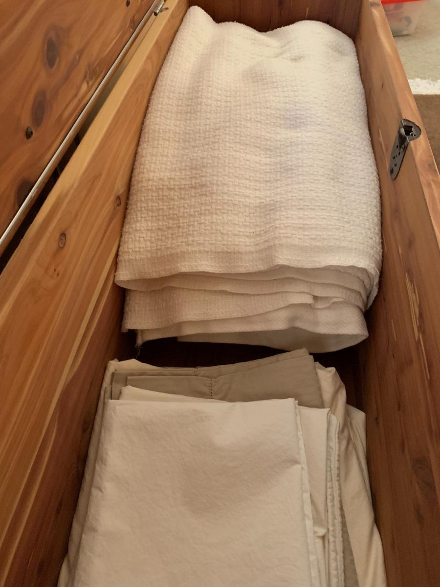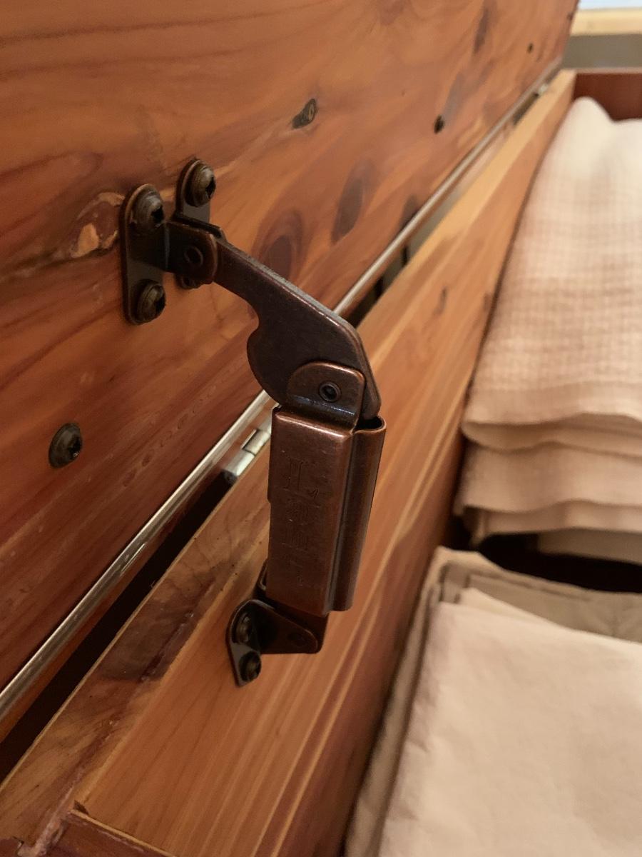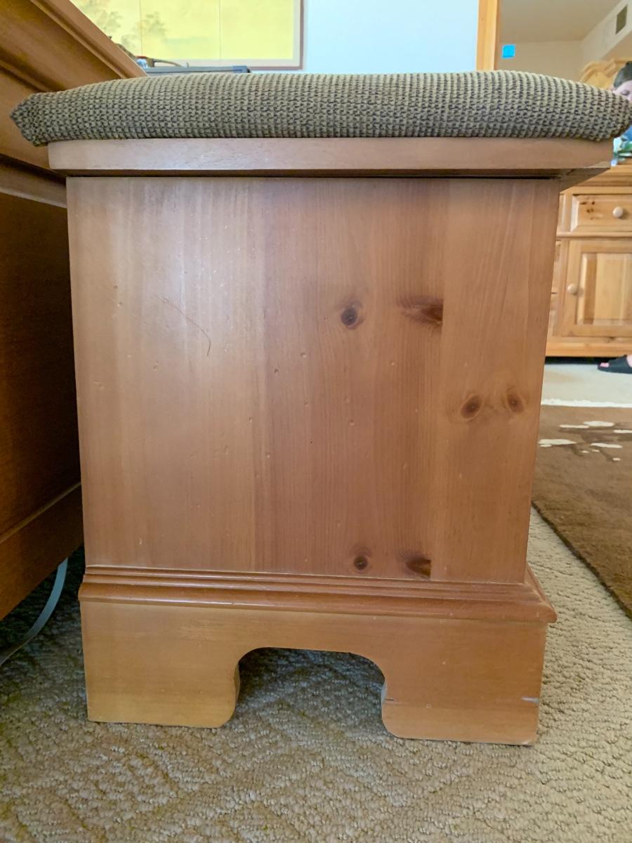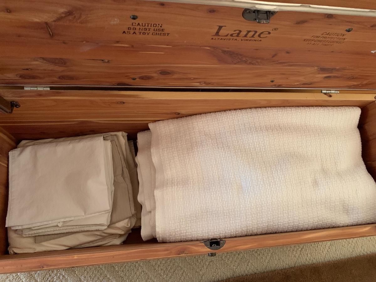 Lane chest in great condition with push lock (no key), front wood carving, and padded top. 43 inches long, 15 inches deep, 20 inches in height