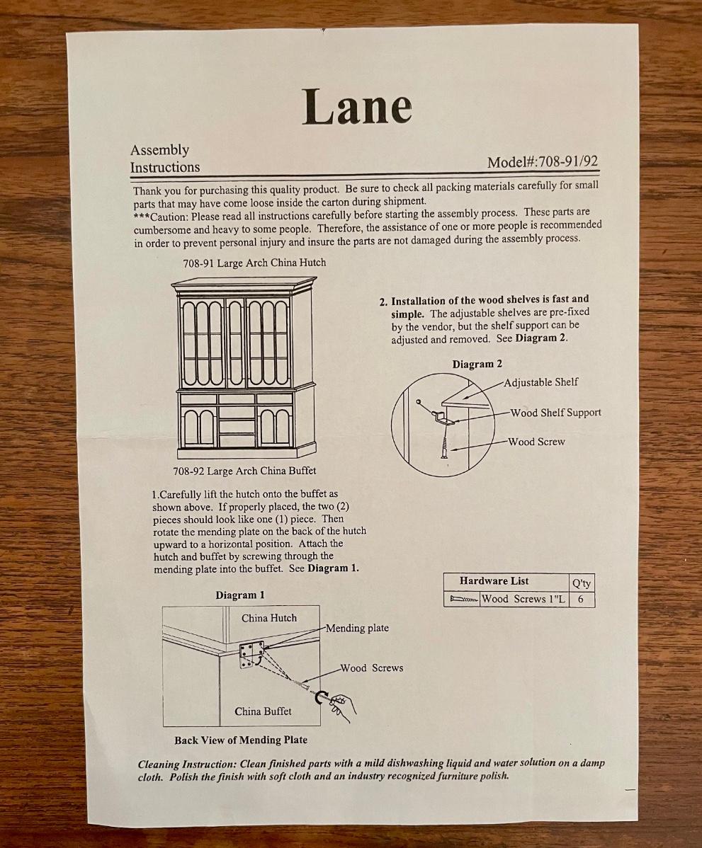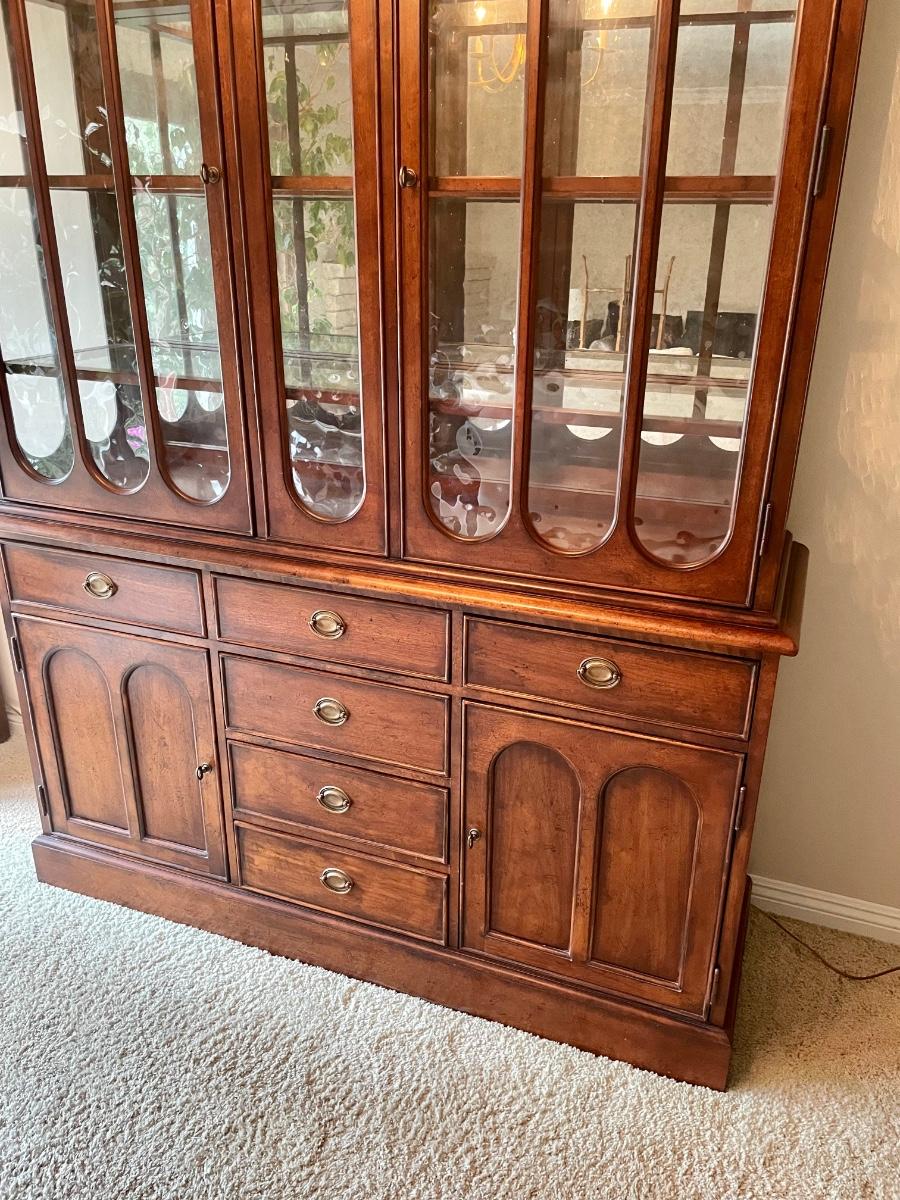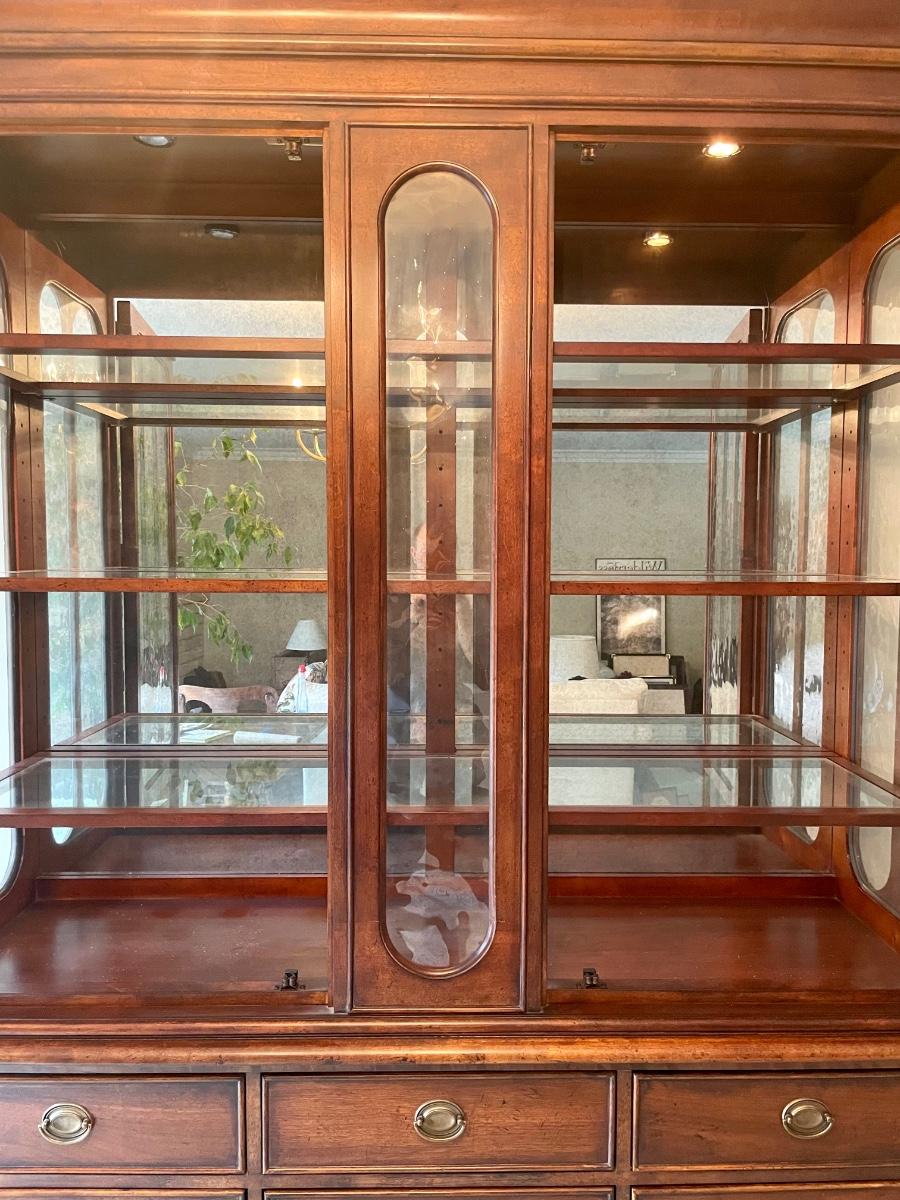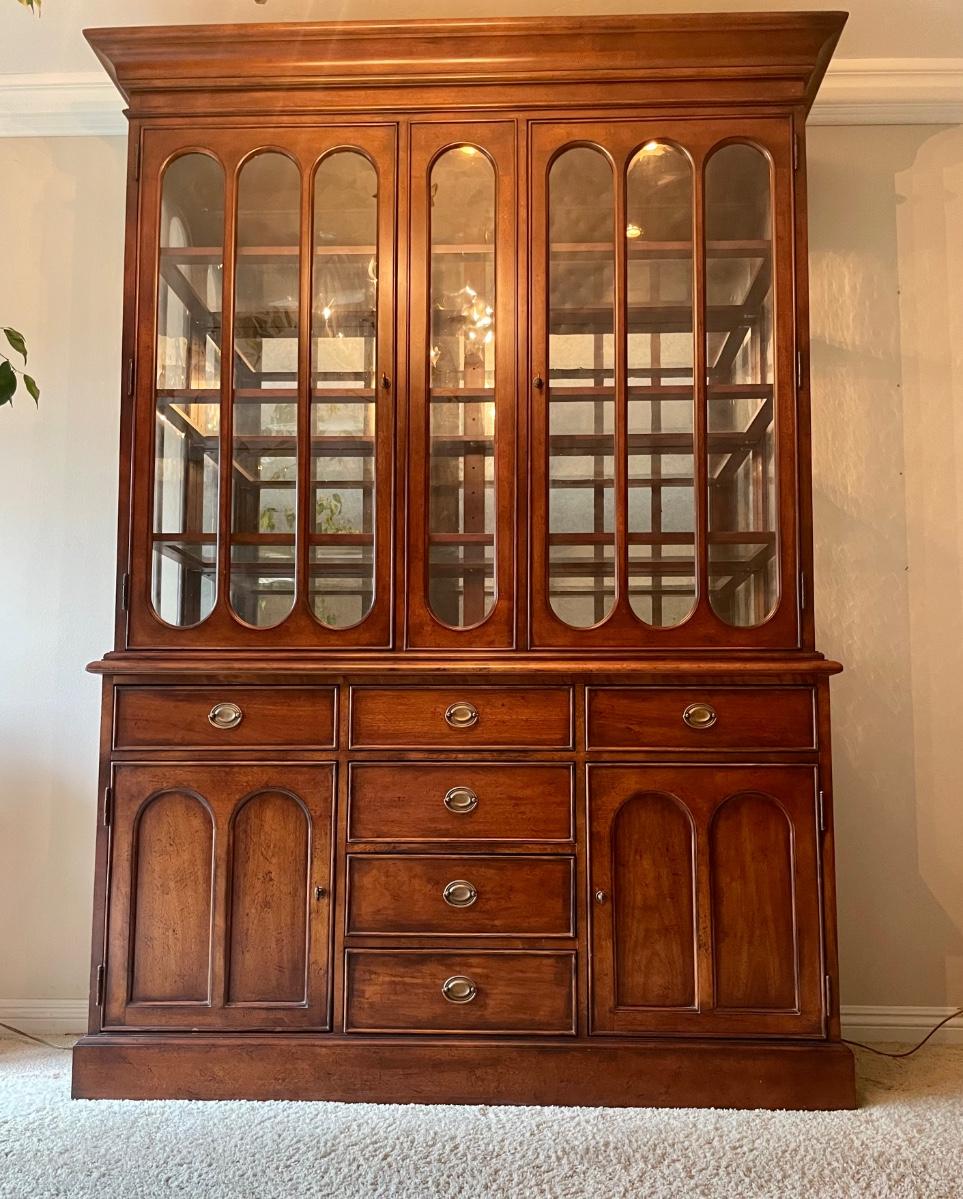 Large arch 2-piece China hutch/buffet by Lane, part of the Country Living Collection. Solid wood construction. Upper section has 2 large front windowpane doors, 3 shelves with glass inserts. Lighted. Lower section has 6 drawers and 2 doors for storing silverware, tablecloths, placemats and larger decor items. 89” tall by 64” wide.
