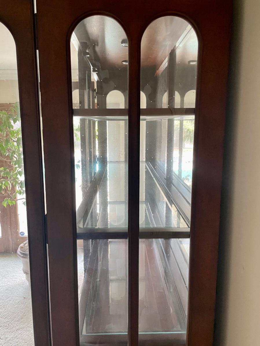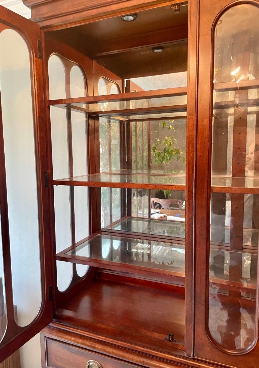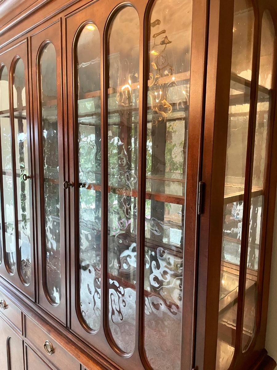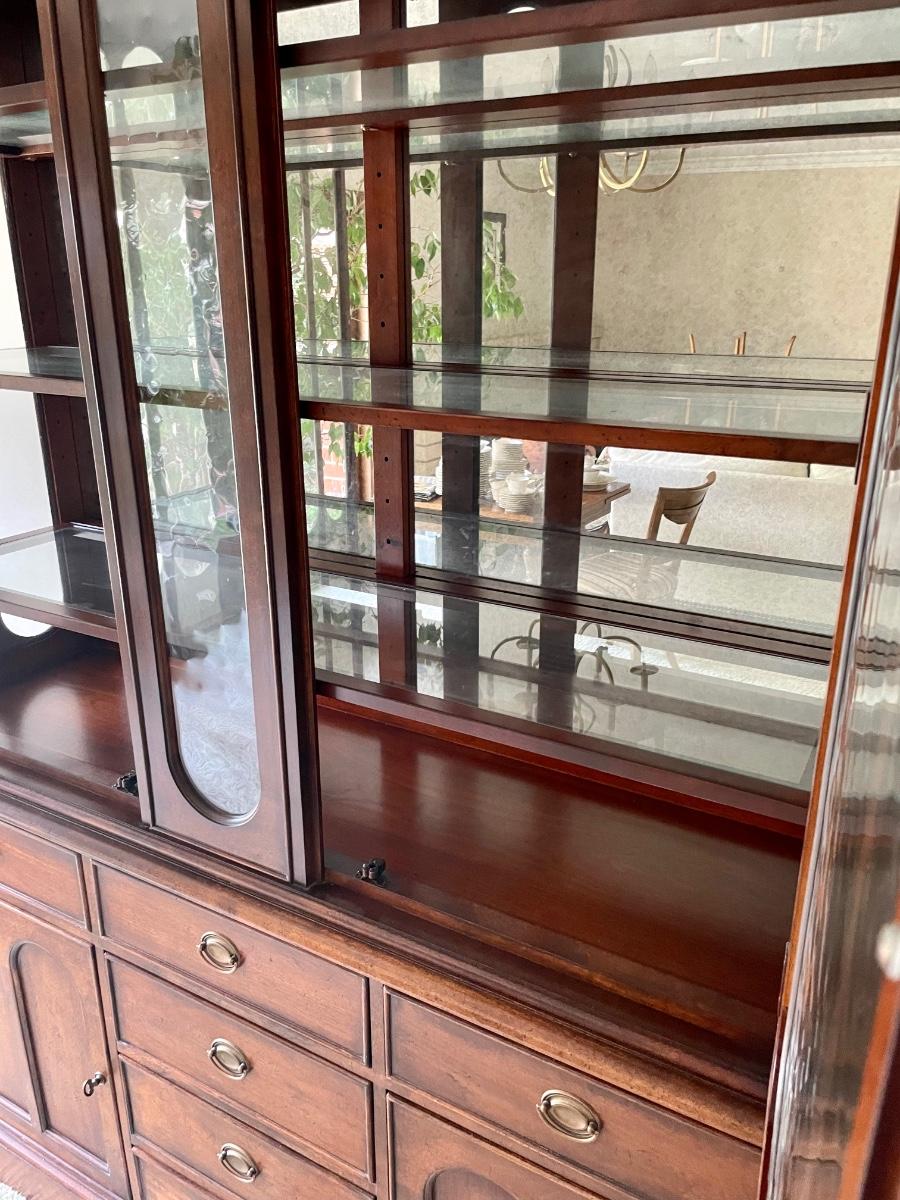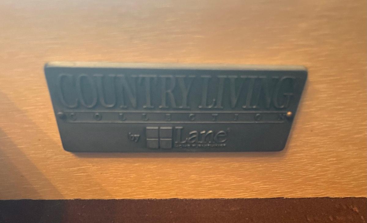 Large arch 2-piece China hutch/buffet by Lane, part of the Country Living Collection. Solid wood construction. Upper section has 2 large front windowpane doors, 3 shelves with glass inserts. Lighted. Lower section has 6 drawers and 2 doors for storing silverware, tablecloths, placemats and larger decor items. 89” tall by 64” wide.