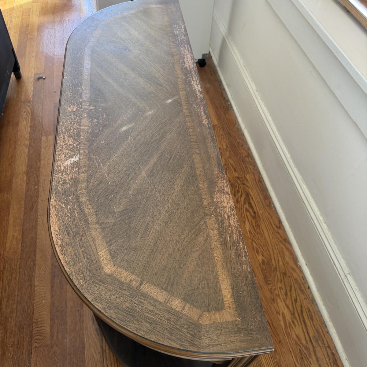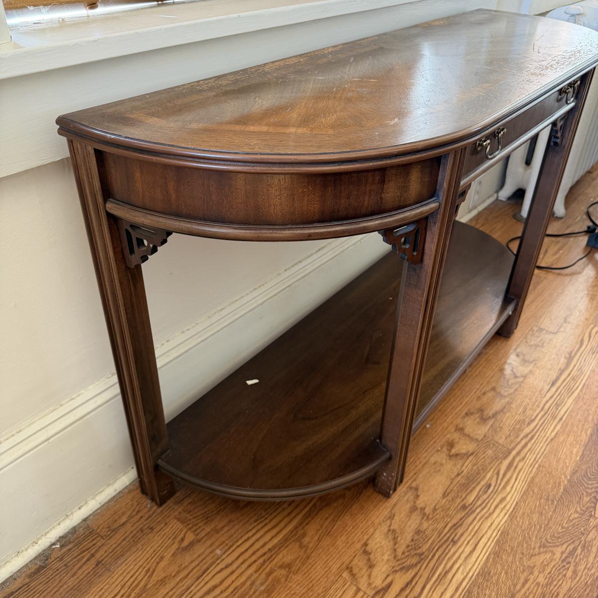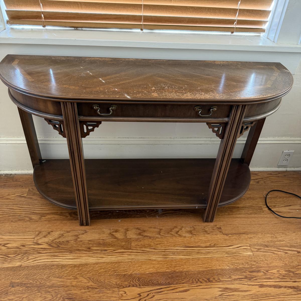 This Lane wooden console table has one dovetailed drawer and a shelf on bottom with a veneer top. Table measures 48” x 15” x 28”H. Table top has scratches and nicks, see pictures.