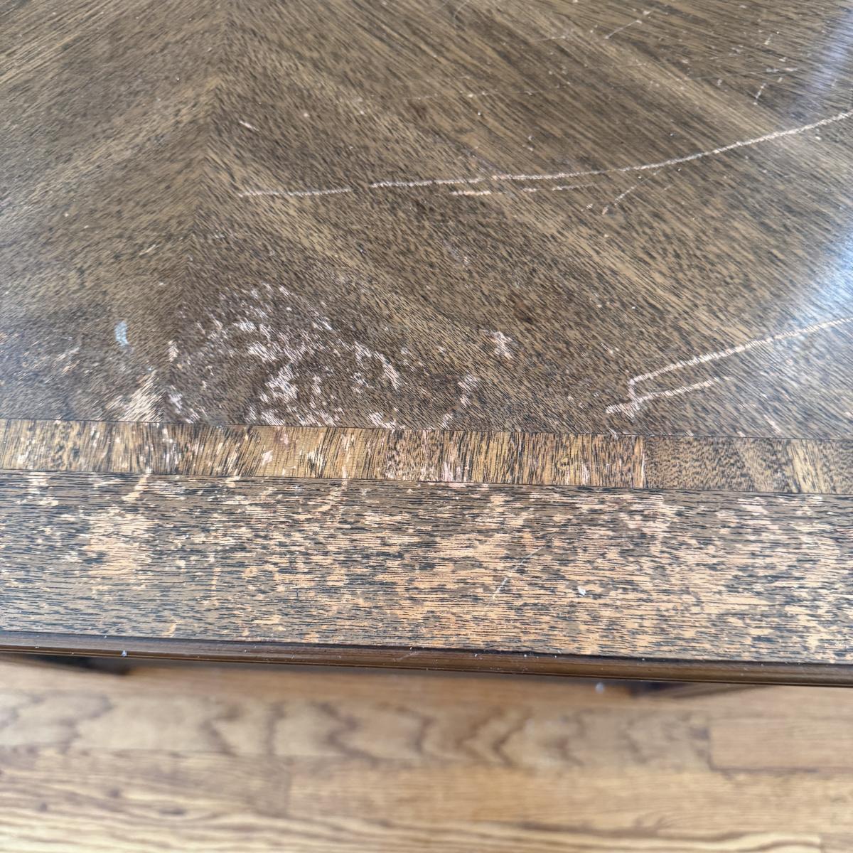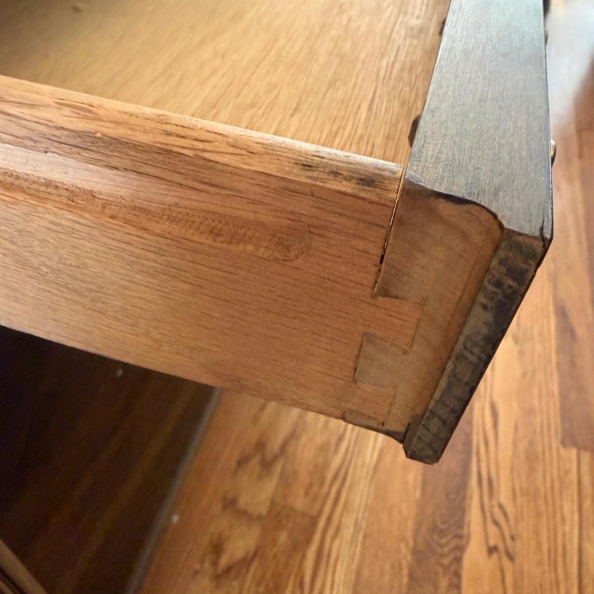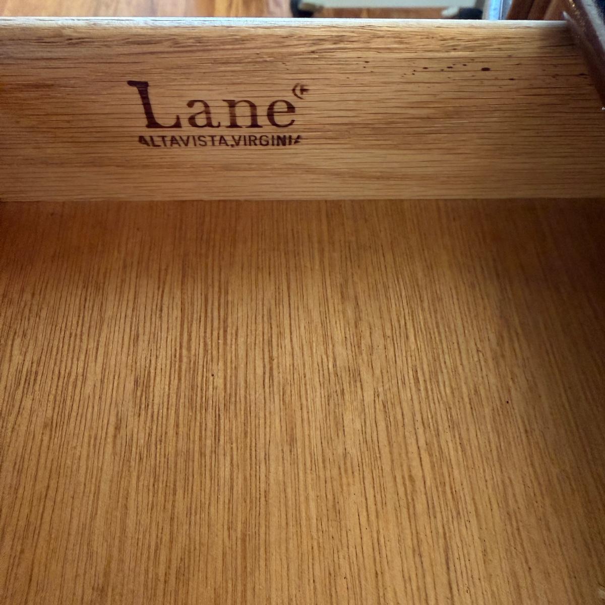 This Lane wooden console table has one dovetailed drawer and a shelf on bottom with a veneer top. Table measures 48” x 15” x 28”H. Table top has scratches and nicks, see pictures.