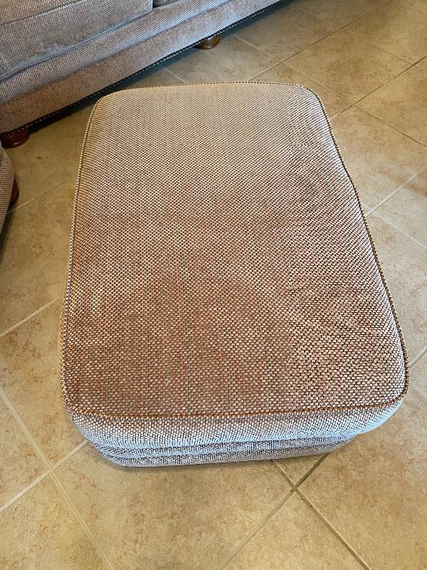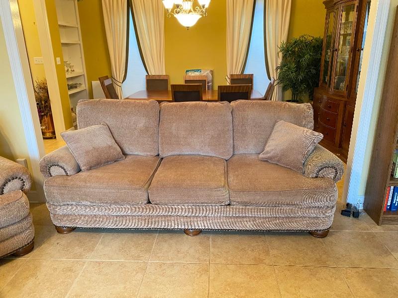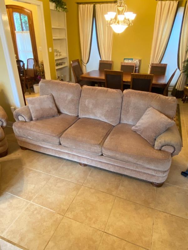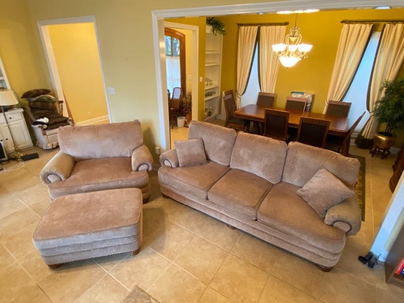 No pets or smoking in home / A light cleaning needed / Includes 2 small matching throw pillows / Couch = 102” L x 44” D x 41” H / Ottoman = 40” L x 27” W x 19” H / Chair = 44”D x 42” H x 60” L