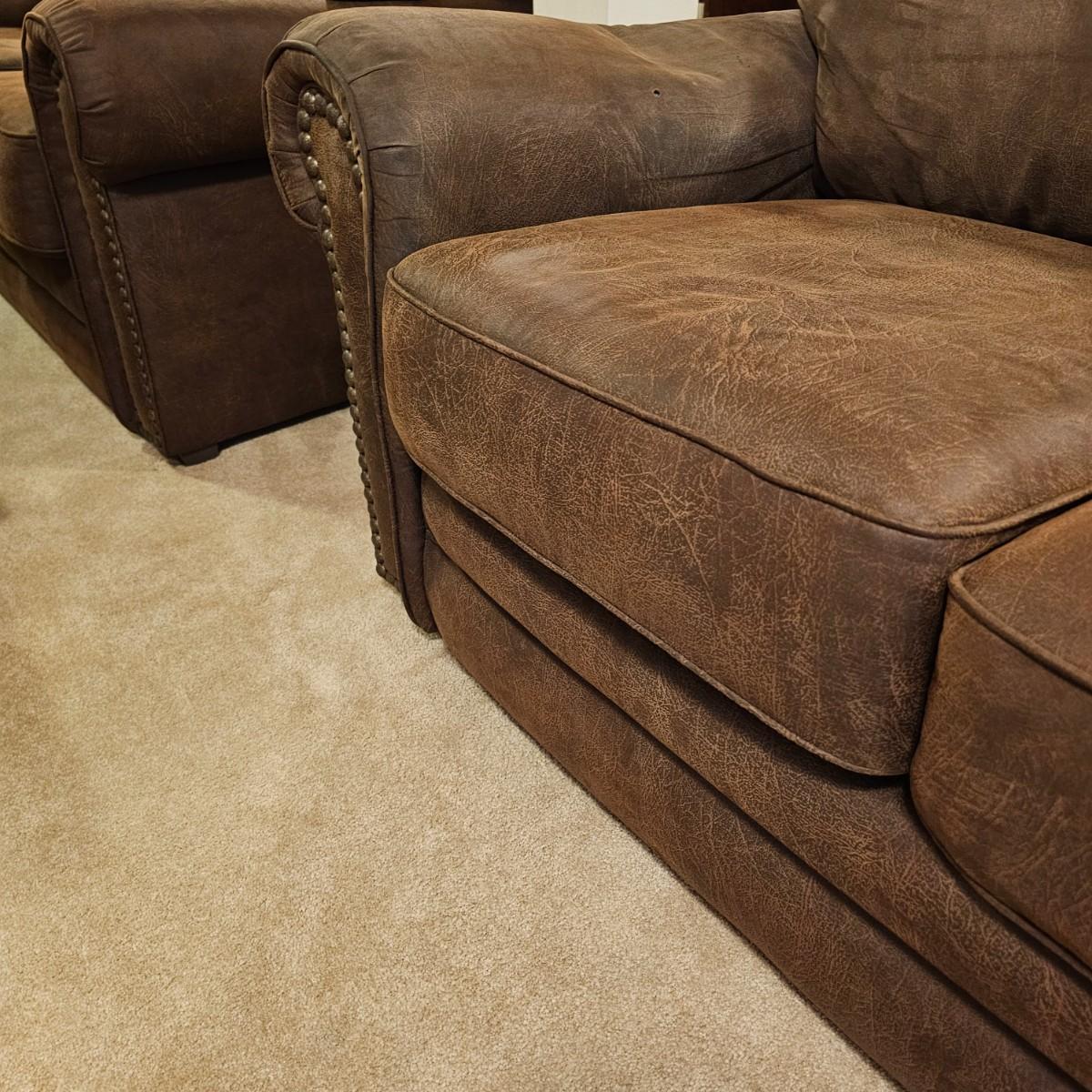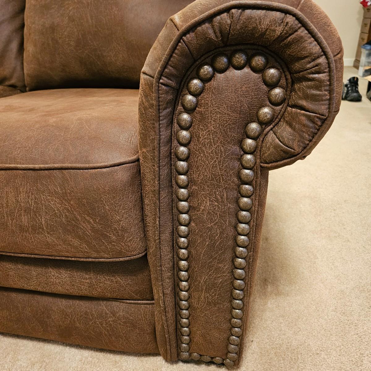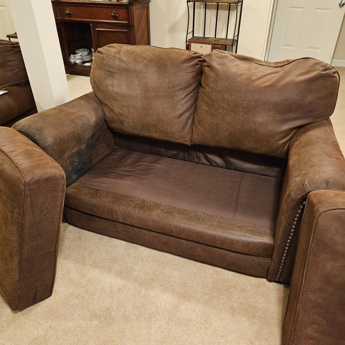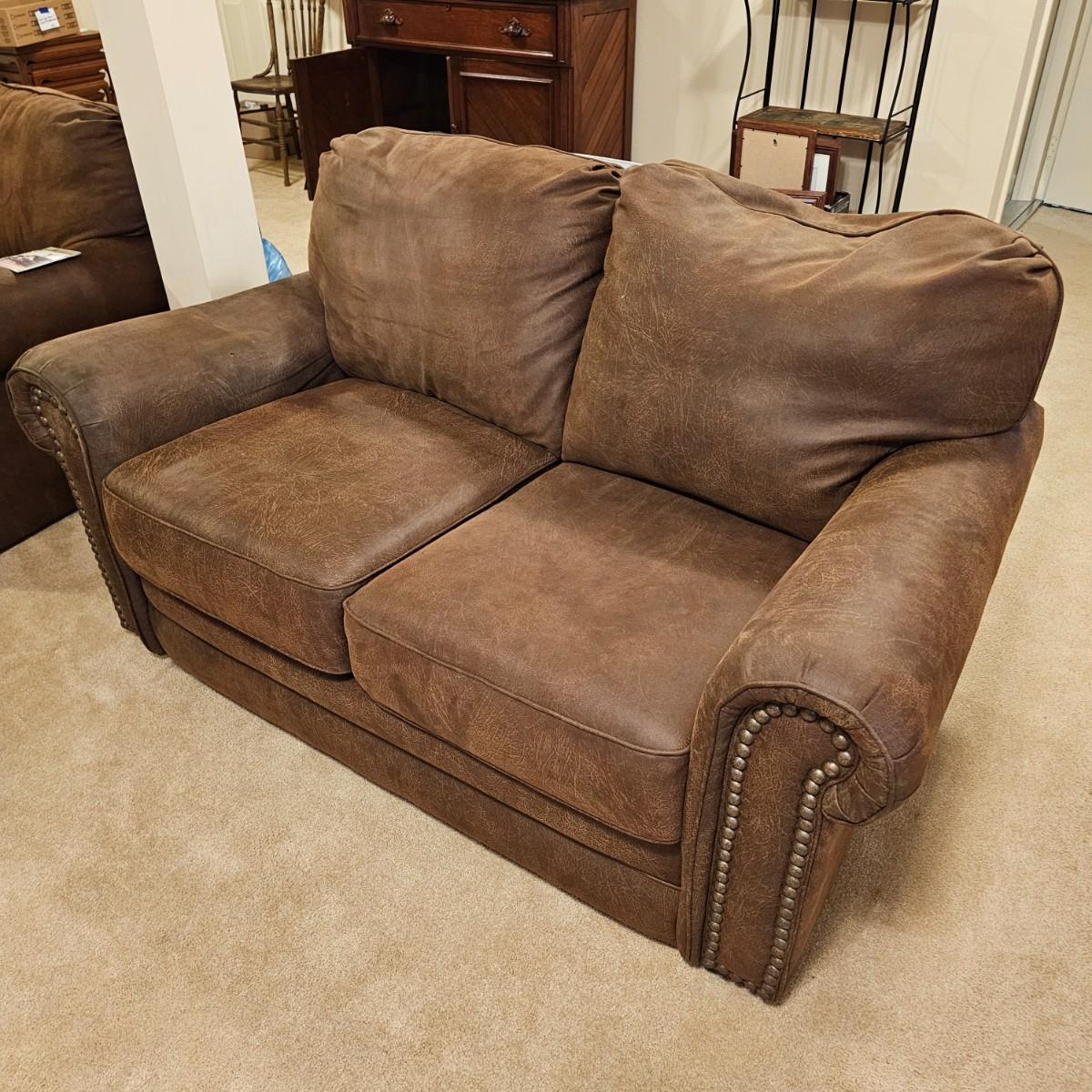 Chocolate brown loveseat by Lane. Rounded arms, fluffed back and bronze nail head trim on front. Material is faux leather and item measures 64" x 38" x 35"H, has 19" seat height. A matching full size sleeper sofa is also available in this auction as a separate lot. There are some burn marks on the right side arm and down inside on cushion. See photos for details. Local pickup only. Winning bidder must bring assistance to help move and load this item due to its weight and/or size. Item is in basement with access out through garage.