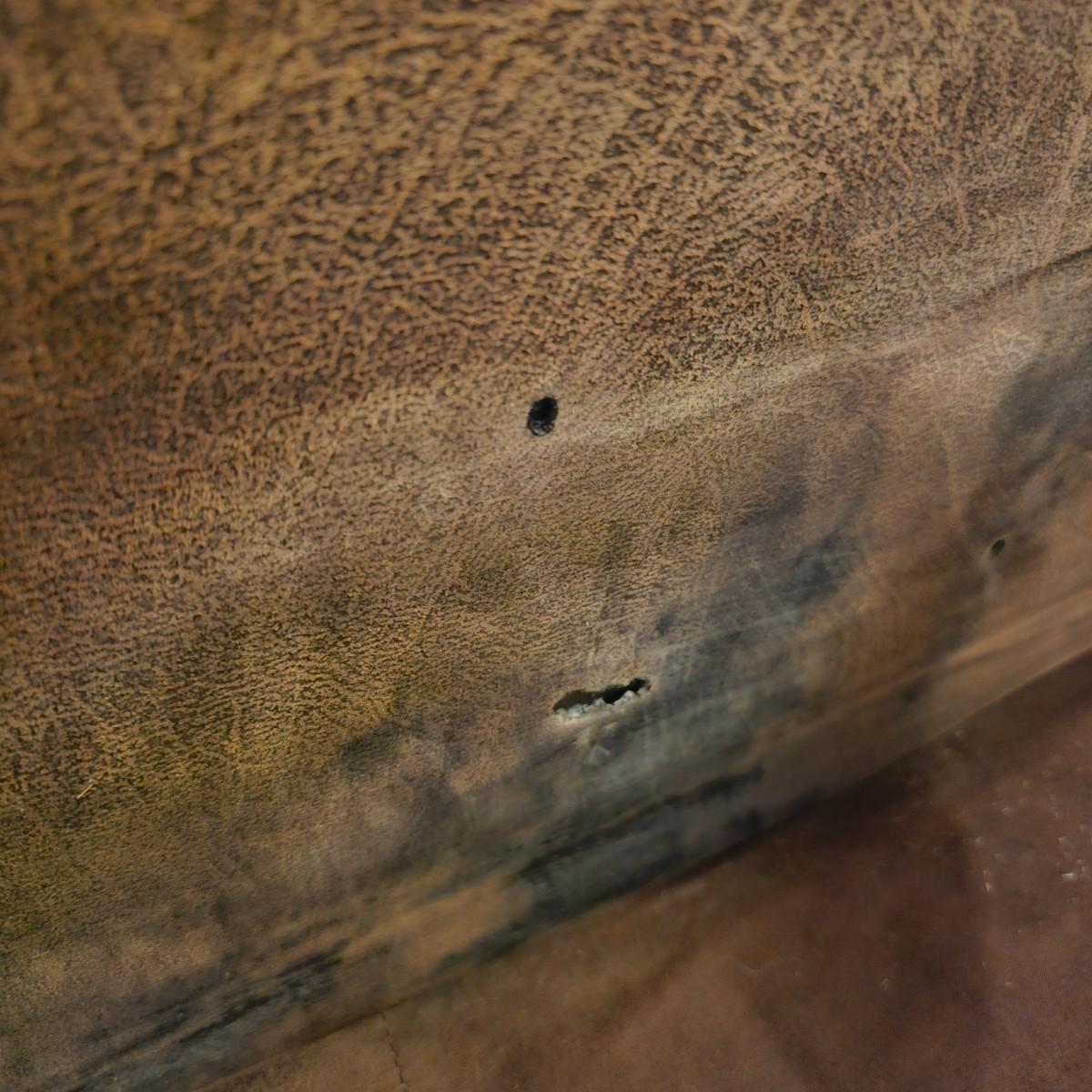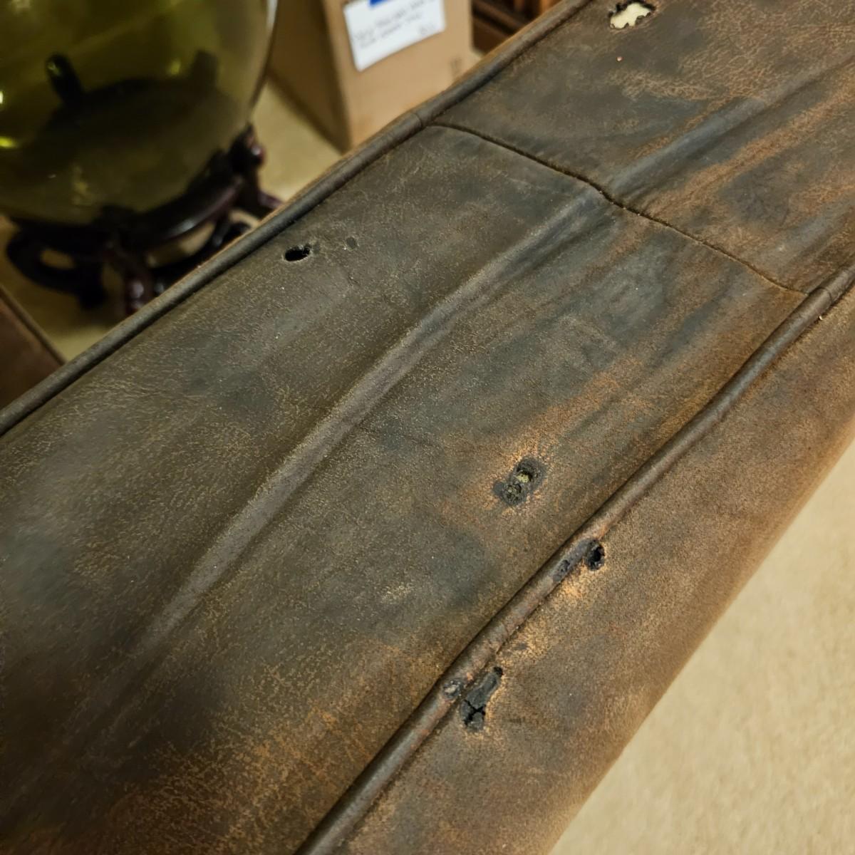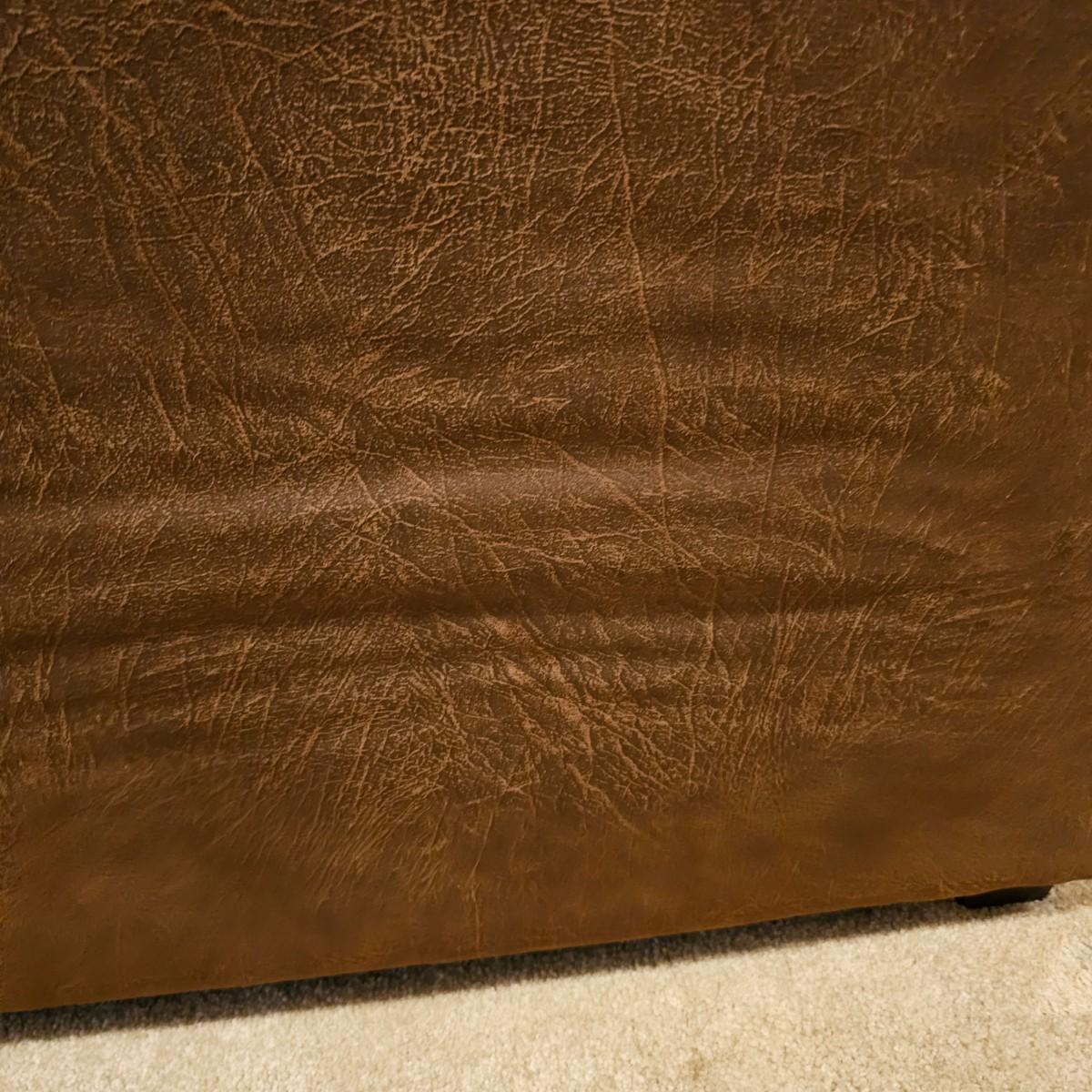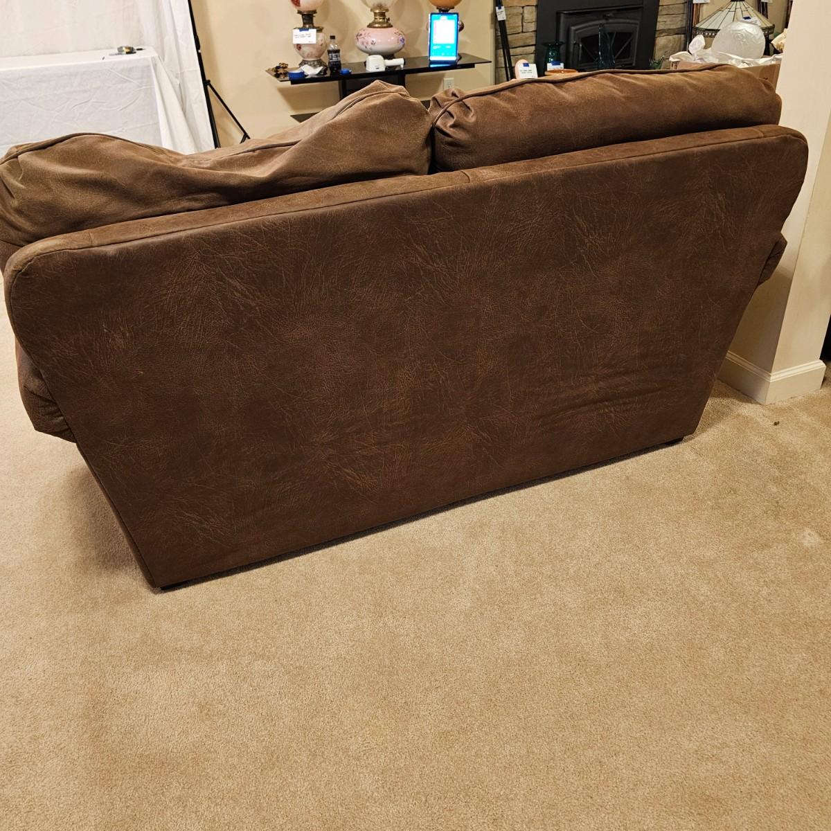 Chocolate brown loveseat by Lane. Rounded arms, fluffed back and bronze nail head trim on front. Material is faux leather and item measures 64" x 38" x 35"H, has 19" seat height. A matching full size sleeper sofa is also available in this auction as a separate lot. There are some burn marks on the right side arm and down inside on cushion. See photos for details. Local pickup only. Winning bidder must bring assistance to help move and load this item due to its weight and/or size. Item is in basement with access out through garage.