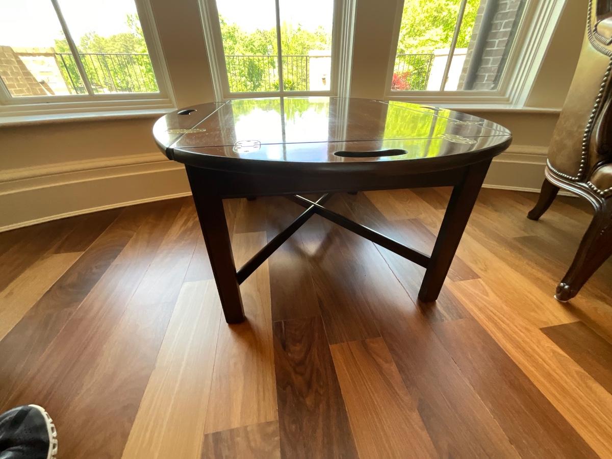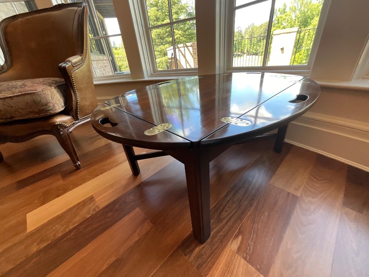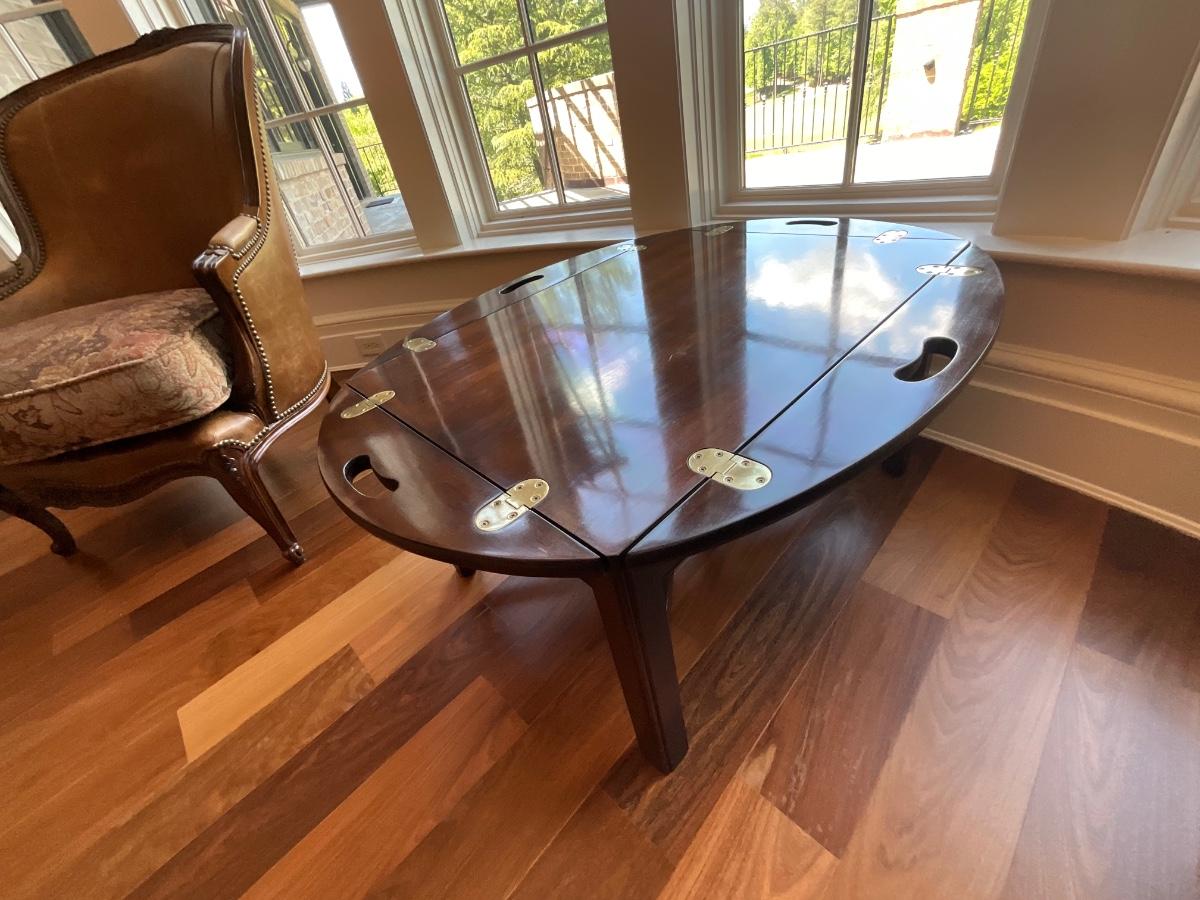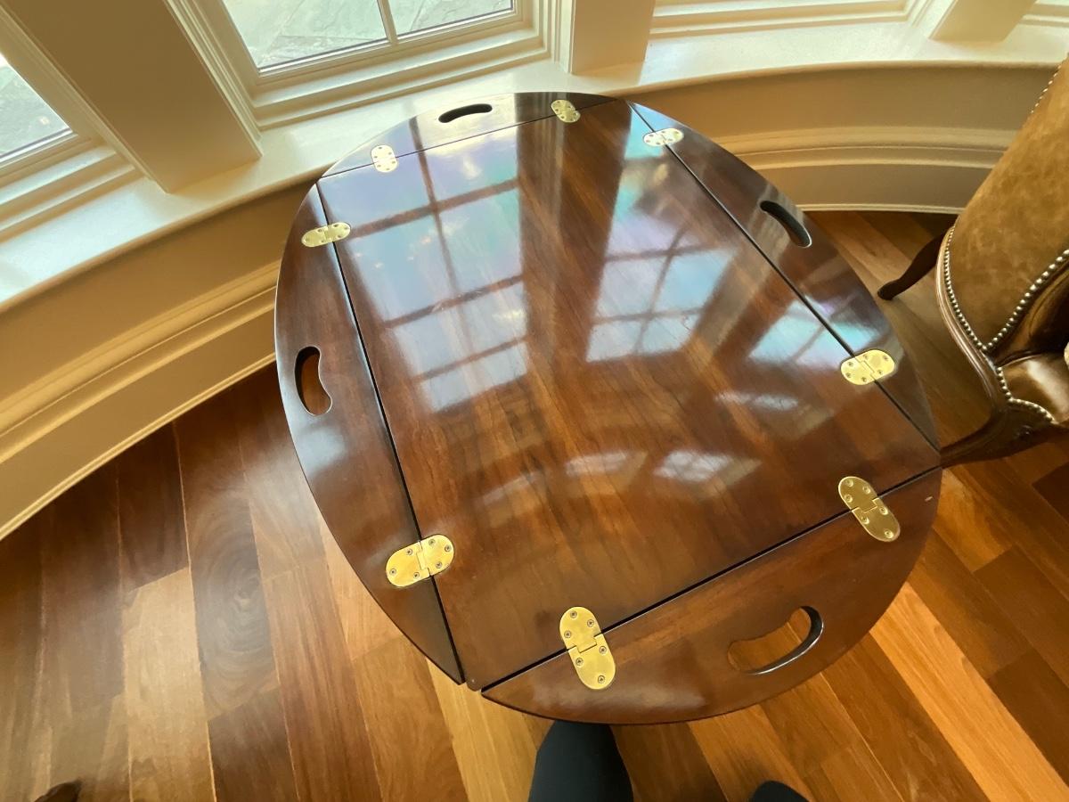 Lane furniture Butler’s table is 17 inches tall, 22 inches tall with the sides flipped up, opened up it is 32“ x 40“.