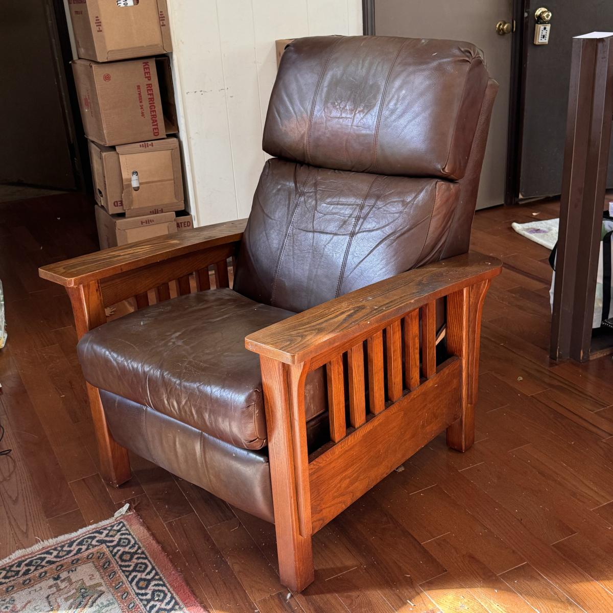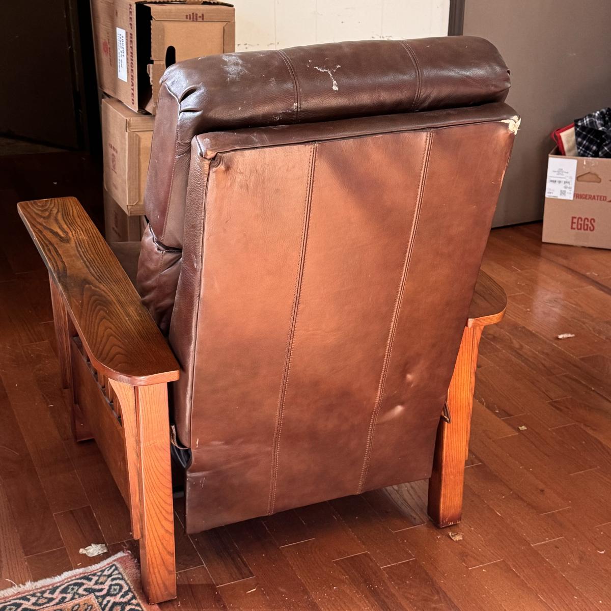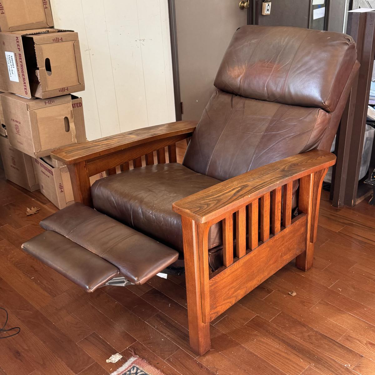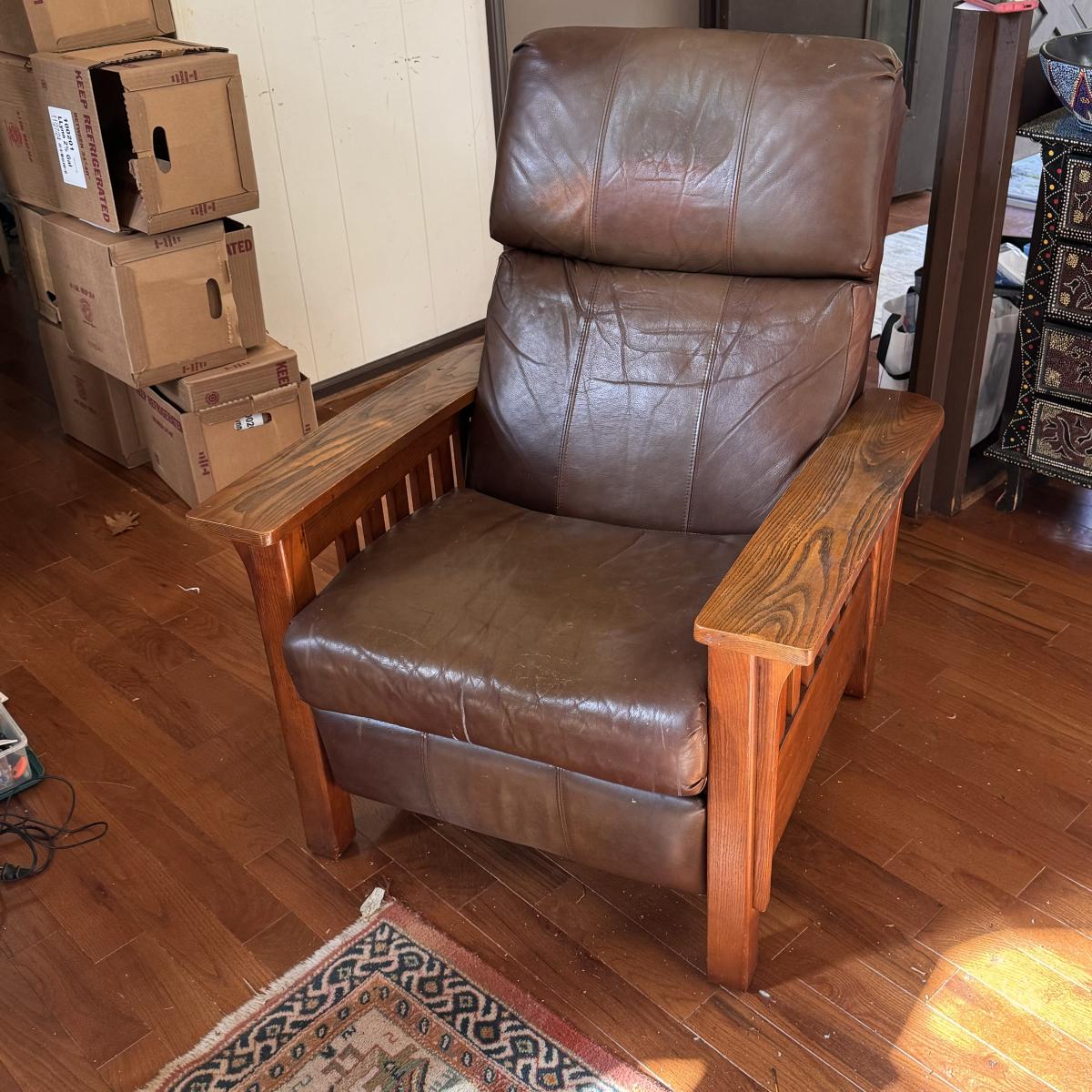 This lot includes one brown leather recliner made by Lane Furniture Industries. The base of the chair is wooden. There are some white paint stains on the leather - see pictures included. The chair measures 33” x 33” x 40”H. When extended it is 50”. From the seat to the floor it’s 20”H. Local pickup only. Winning bidder must bring assistance to help move and load this item due to its weight and/or size...