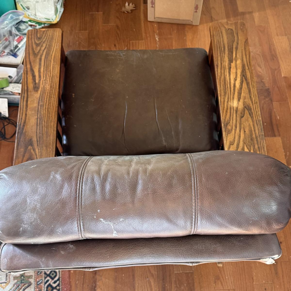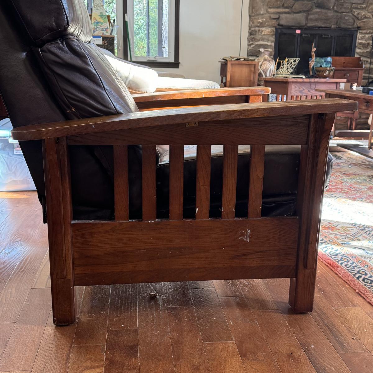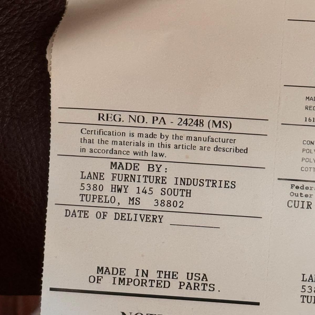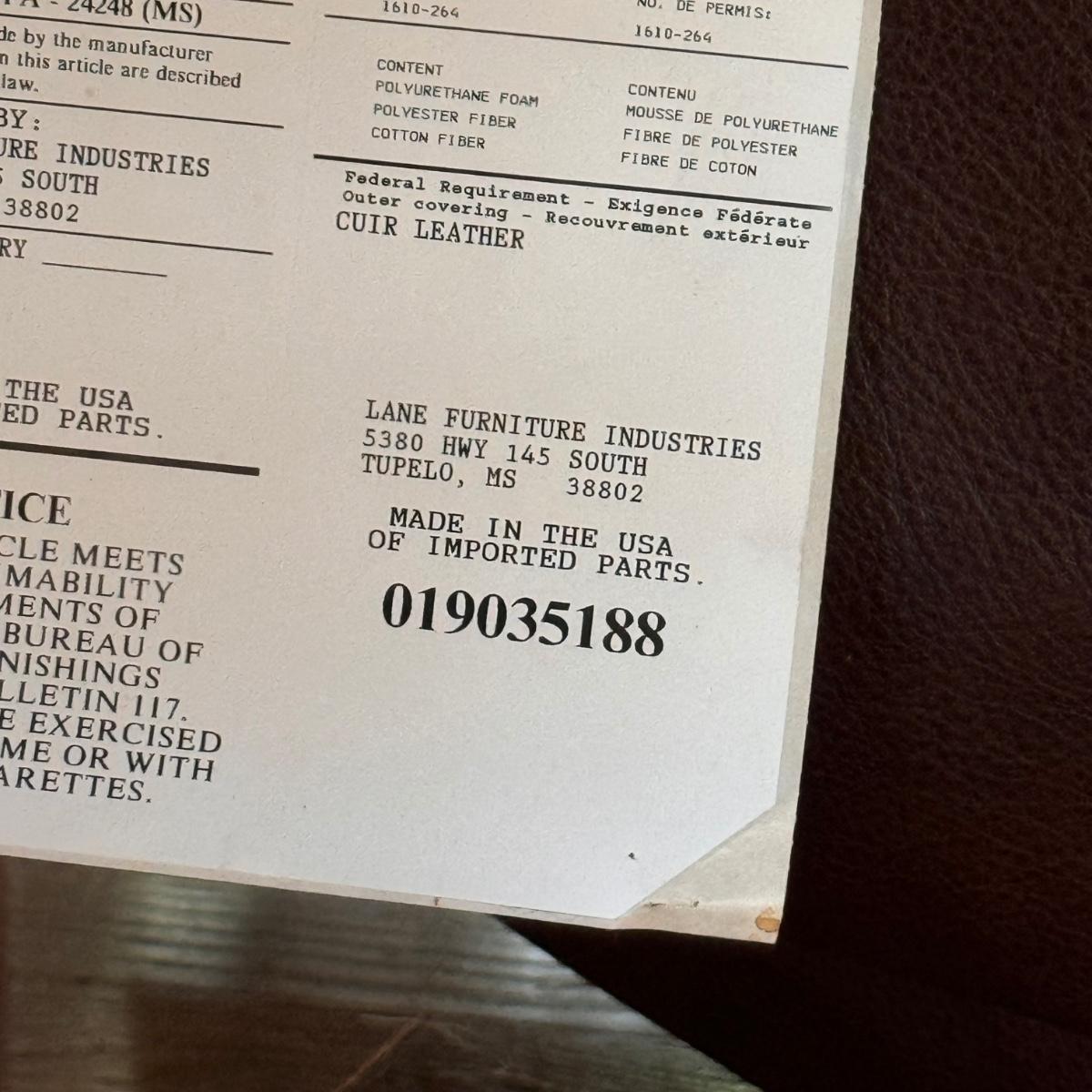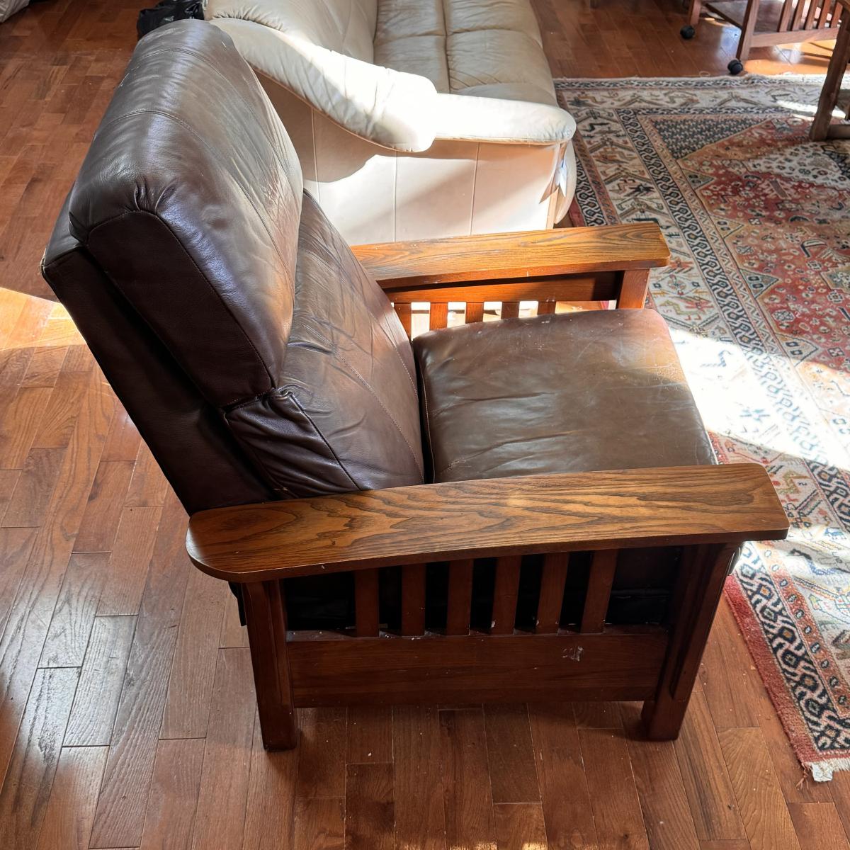 This lot includes one brown leather recliner made by Lane Furniture Industries. The base of the chair is wooden. There are some white paint stains on the leather - see pictures included. The chair measures 33” x 33” x 40”H. When extended it is 50”. From the seat to the floor it’s 20”H. Local pickup only. Winning bidder must bring assistance to help move and load this item due to its weight and/or size...