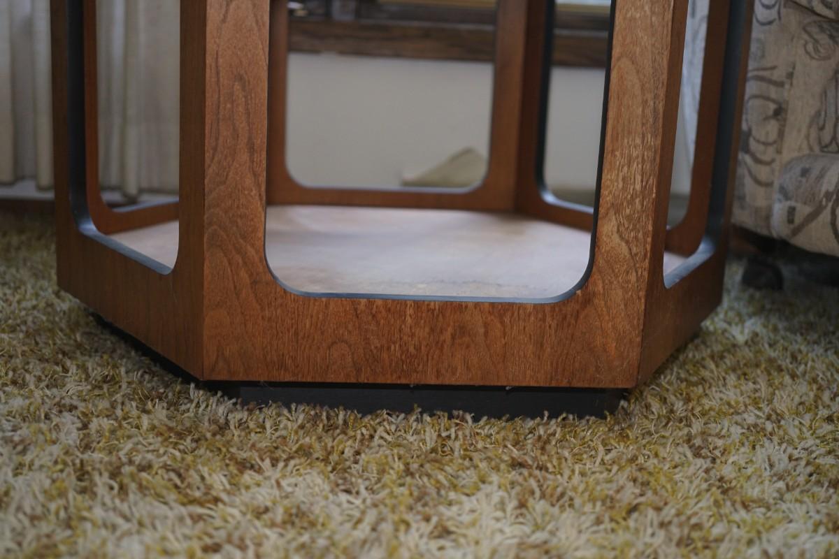 there is water marking on the base and along one side. may need a light sanding and oil to restore. very attractive table with good shelf below to put a plant.