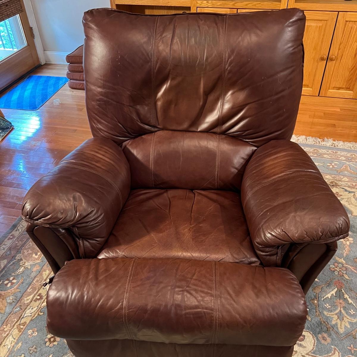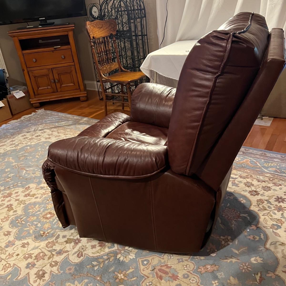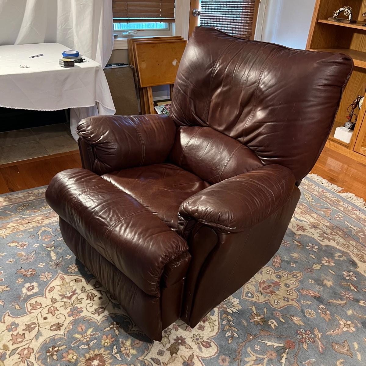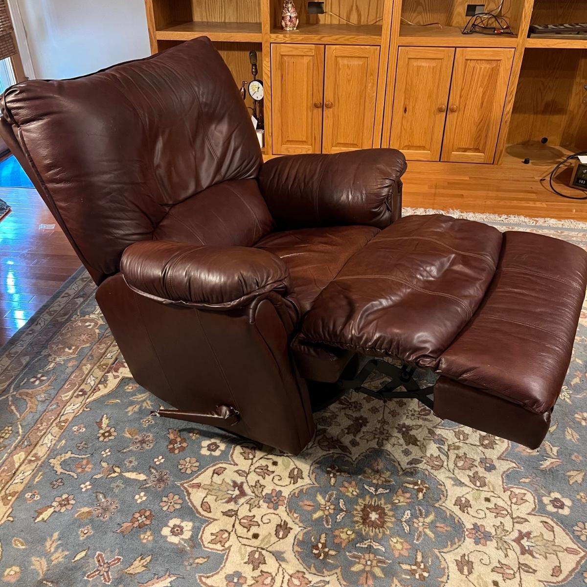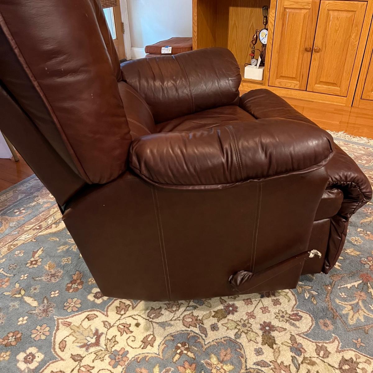 This generously sized Lane recliner is extremely comfortable. It is a soft chocolate brown leather. Manually operated. A few blemishes includes wear on the handle, see photos.