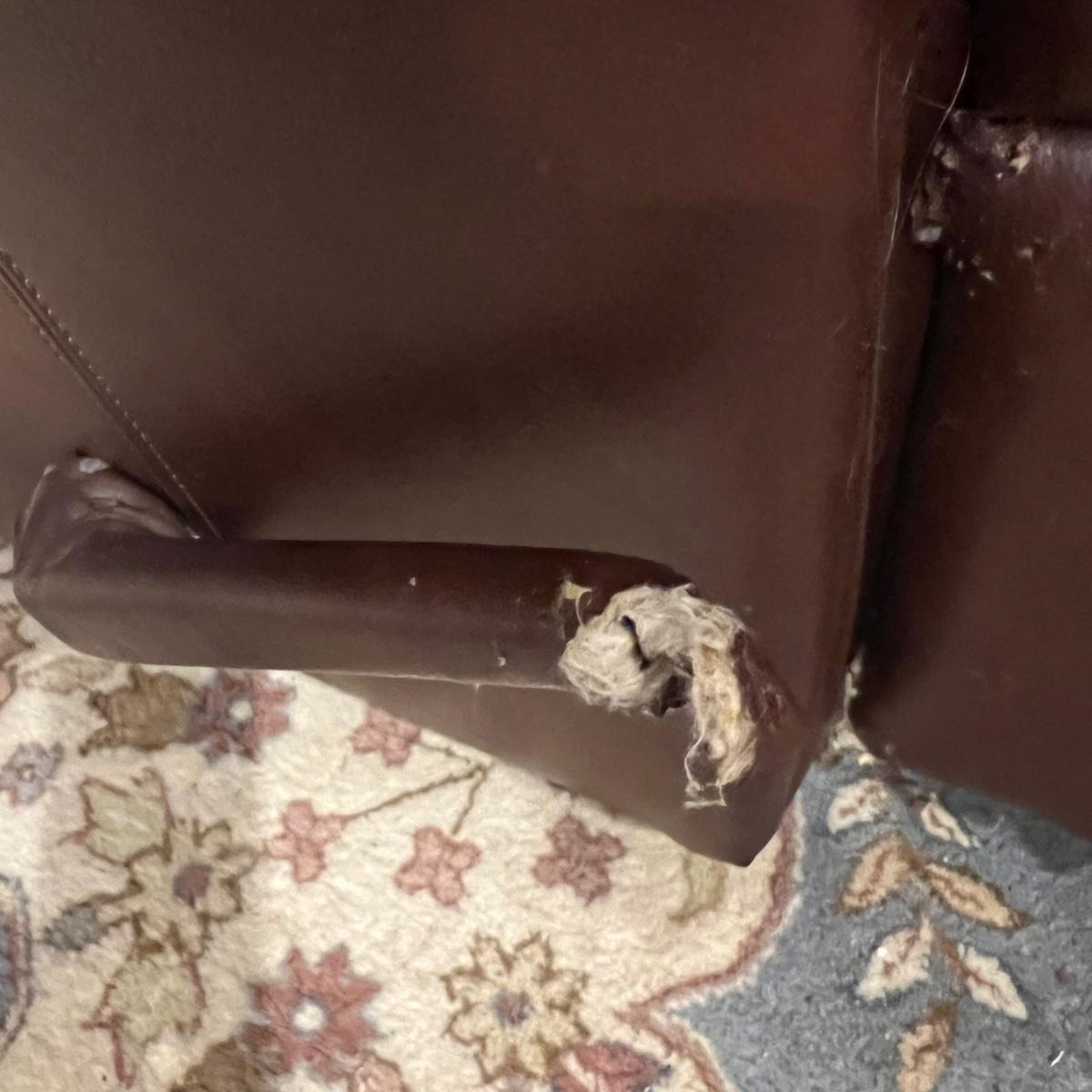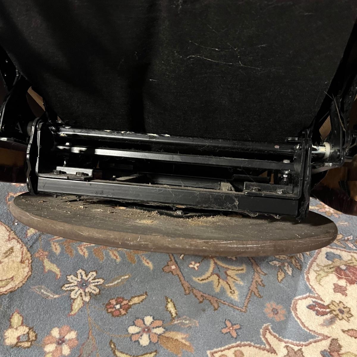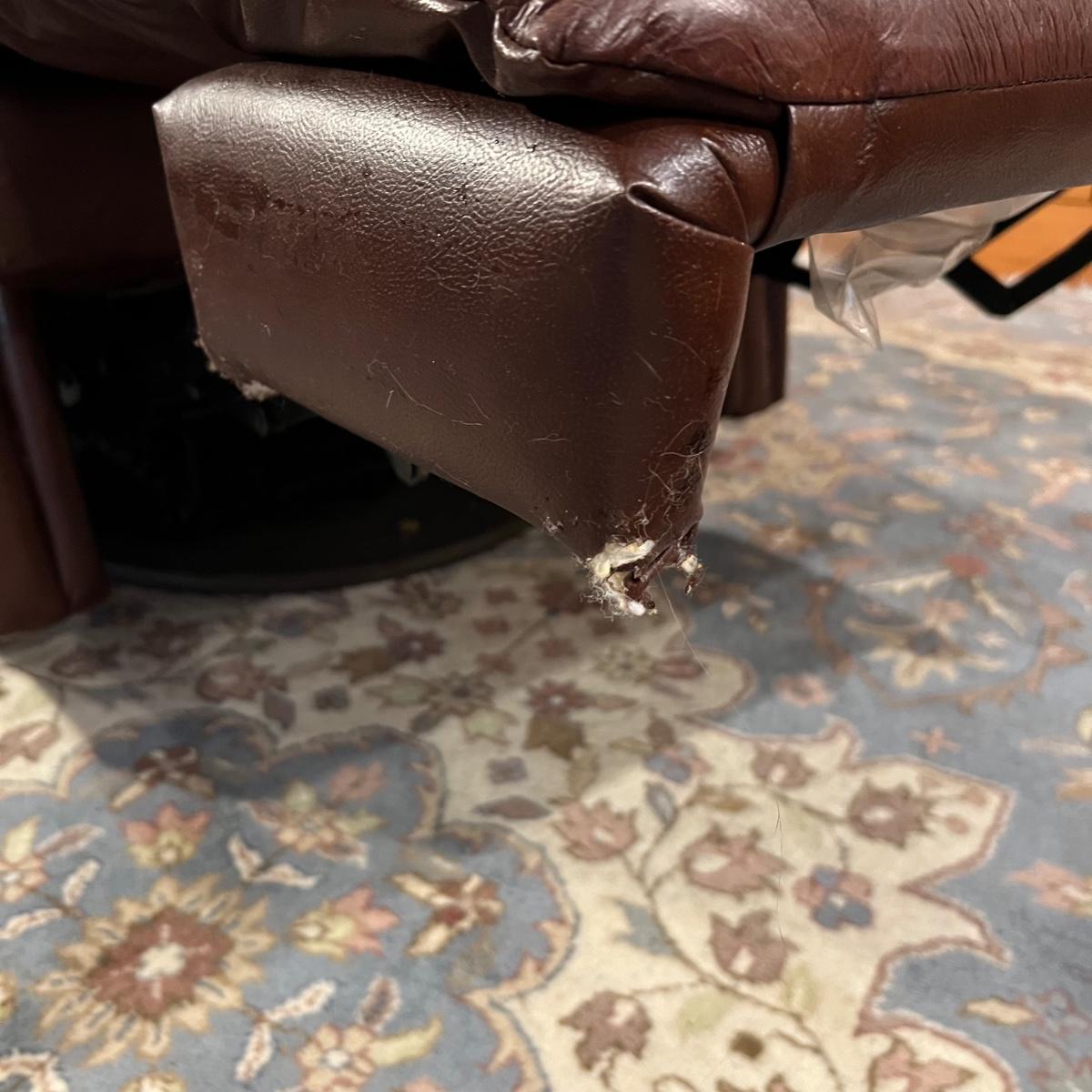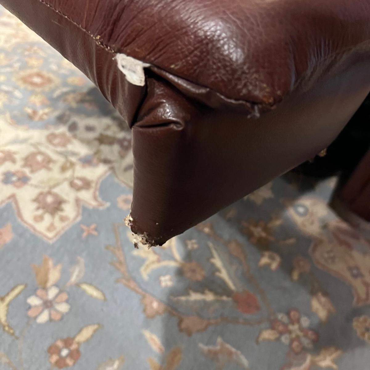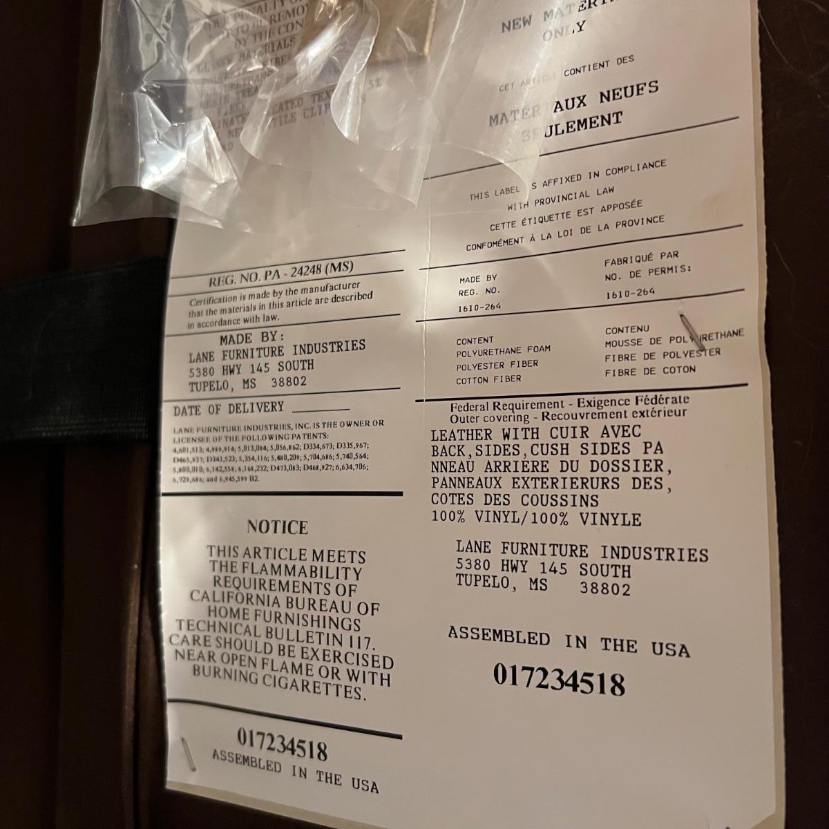 This generously sized Lane recliner is extremely comfortable. It is a soft chocolate brown leather. Manually operated. A few blemishes includes wear on the handle, see photos.
