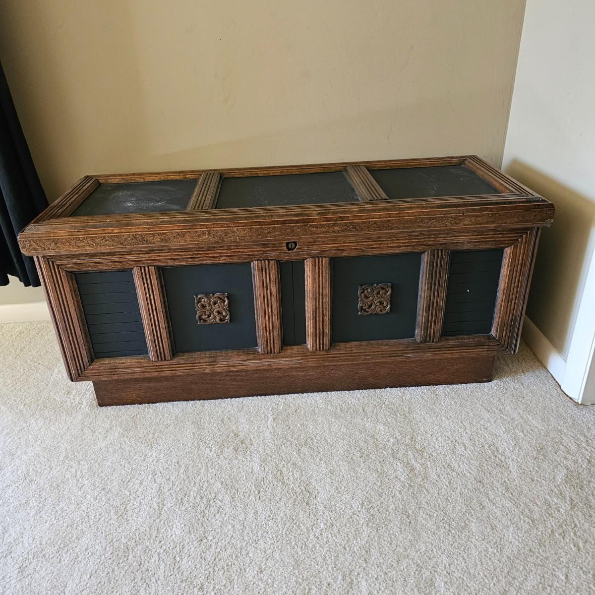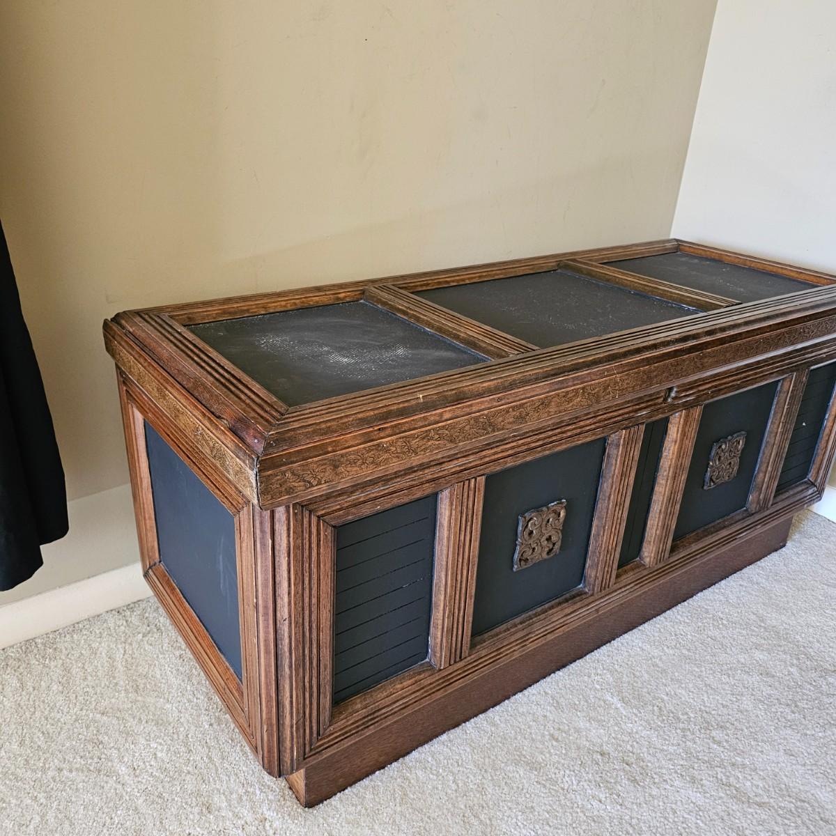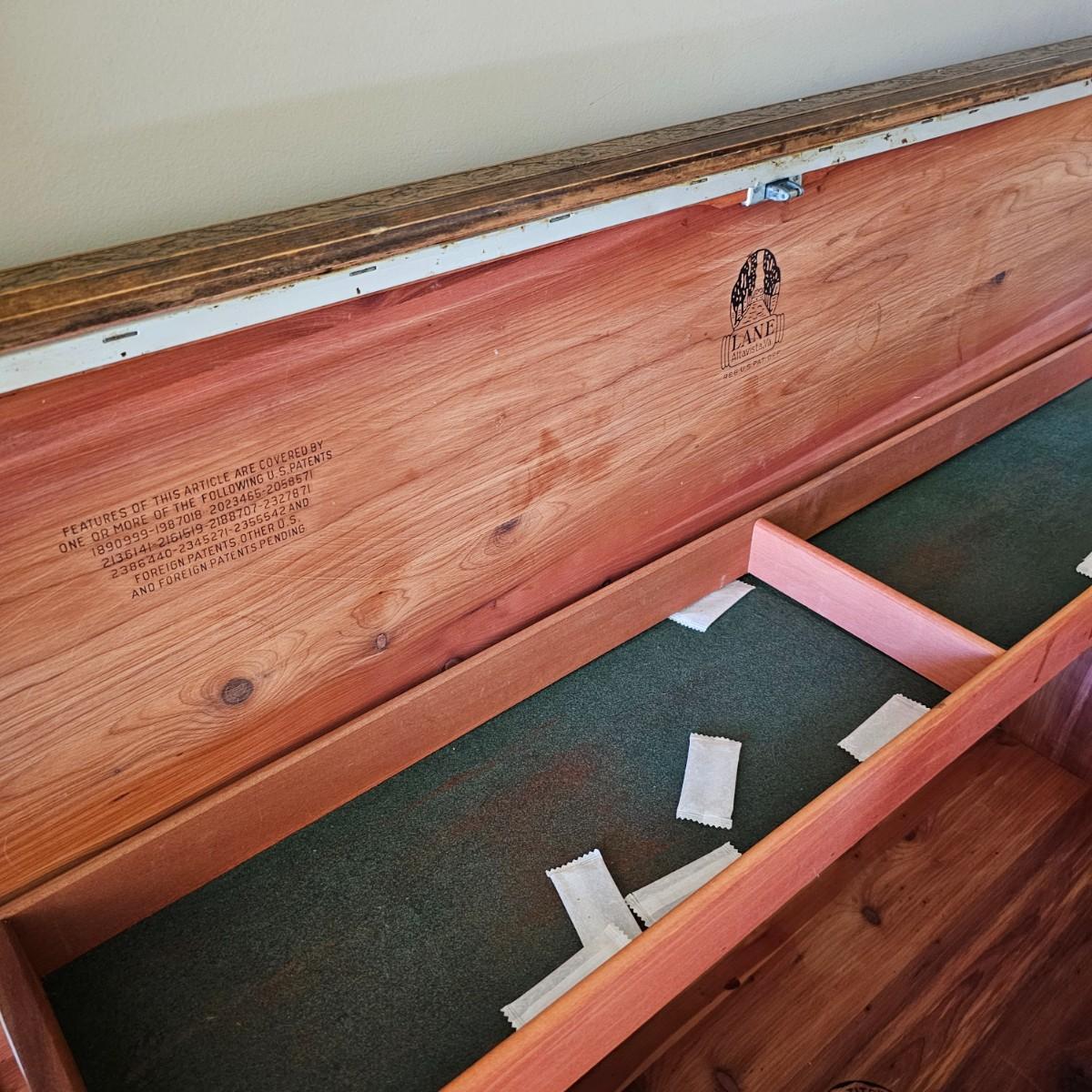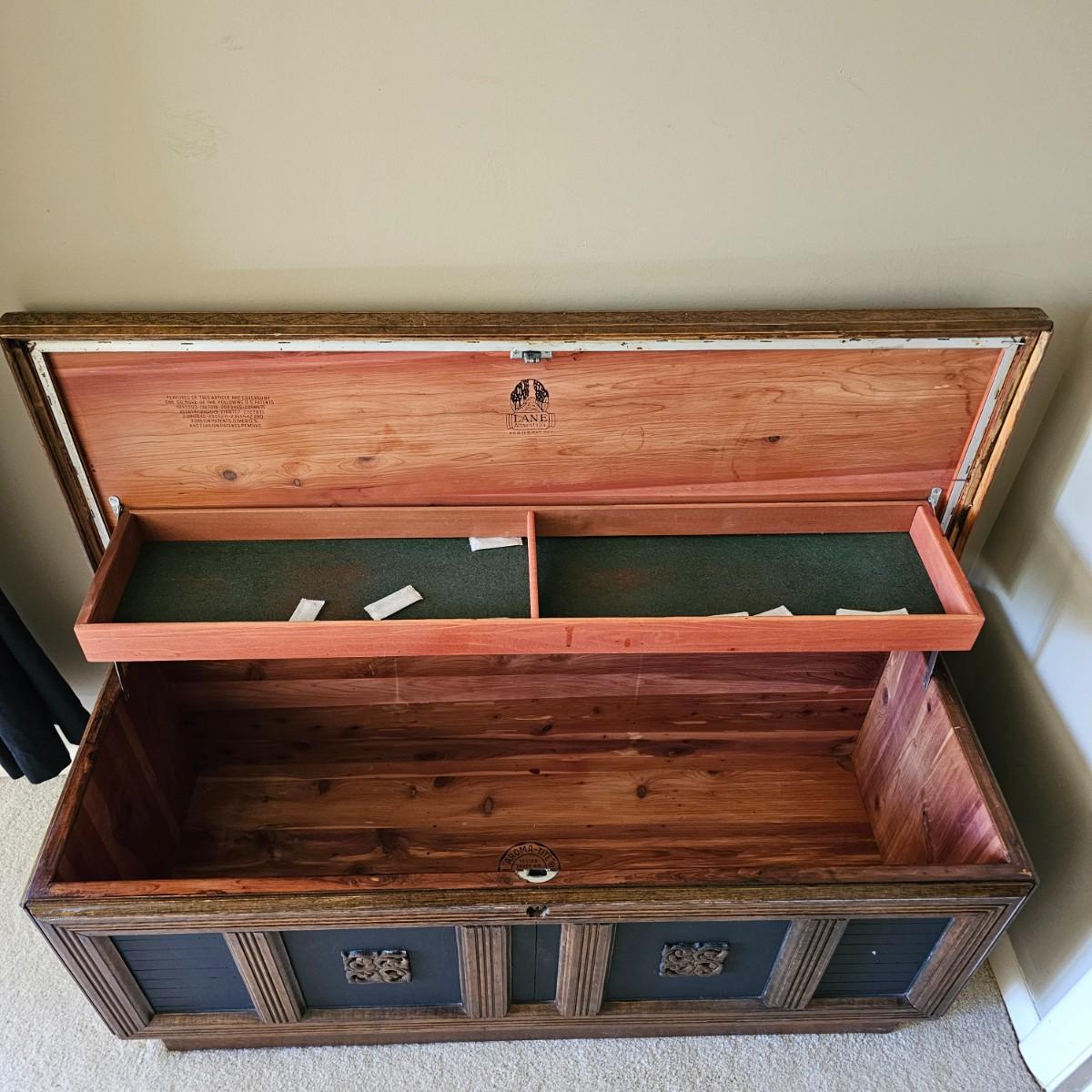 Wood decor with pedestal base and alternating black panels on front and sides. Manufactured by Lane, this cedar chest has push-button latch access but no key. Small drawers inside-out lift lid. Measures 44" x 17" x 19"H. Some dings and scrapes on outside. See photos for details. Please note that Lane had several recalls on chests for locks. You can go to Lane.com to see if this chest needs a replacement lock. There is no charge for replacement. This is a safety recall and we cannot verify that this one has been done.