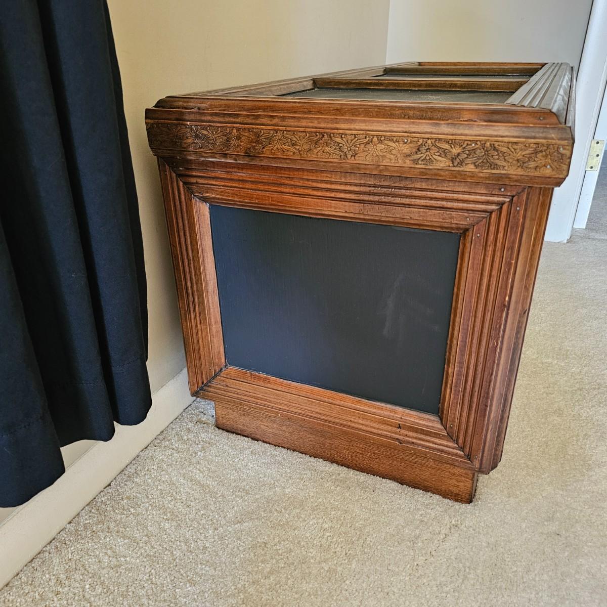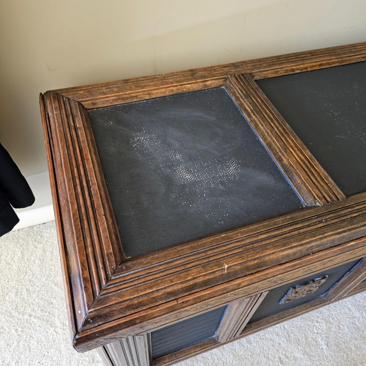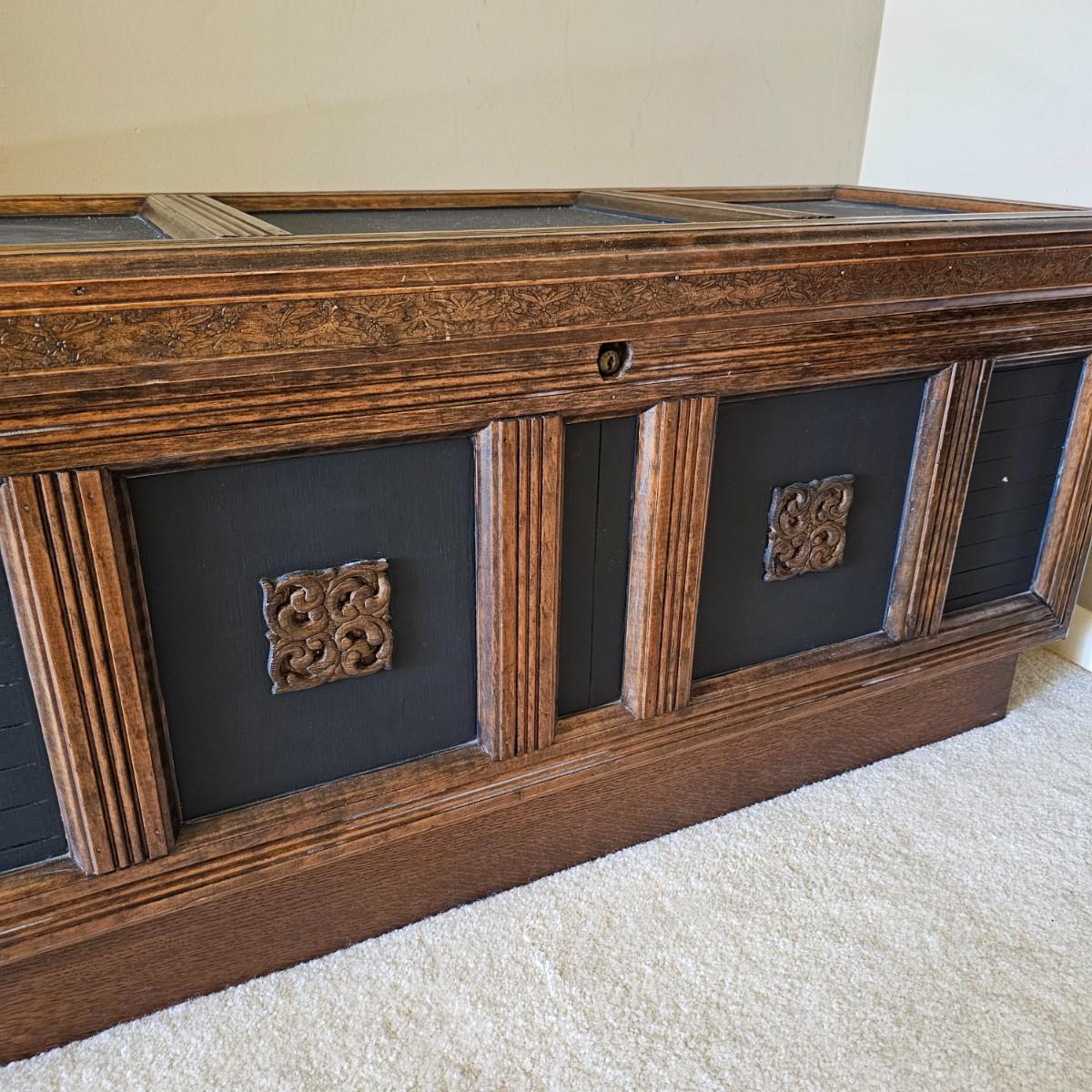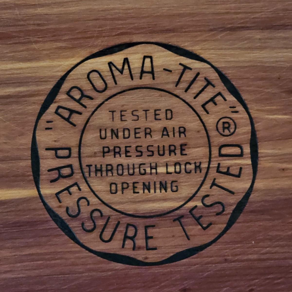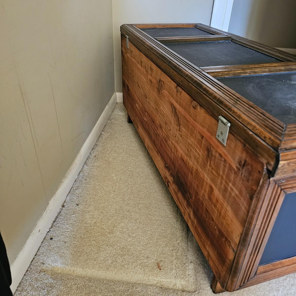 Wood decor with pedestal base and alternating black panels on front and sides. Manufactured by Lane, this cedar chest has push-button latch access but no key. Small drawers inside-out lift lid. Measures 44" x 17" x 19"H. Some dings and scrapes on outside. See photos for details. Please note that Lane had several recalls on chests for locks. You can go to Lane.com to see if this chest needs a replacement lock. There is no charge for replacement. This is a safety recall and we cannot verify that this one has been done.