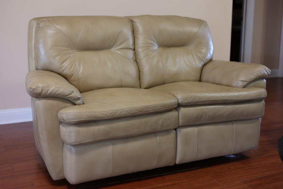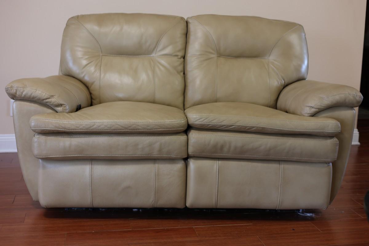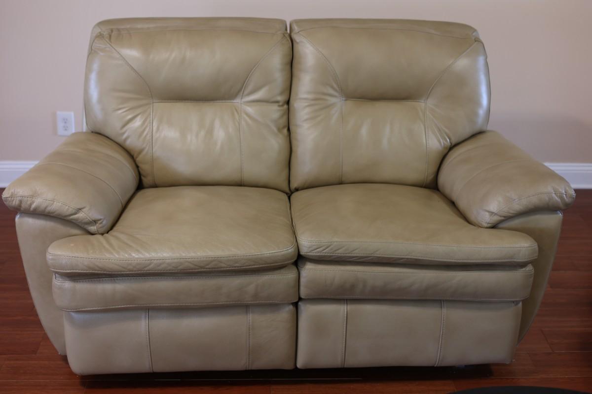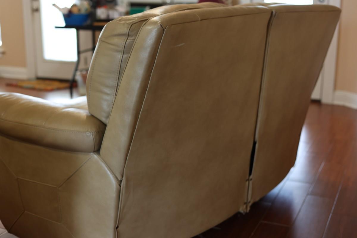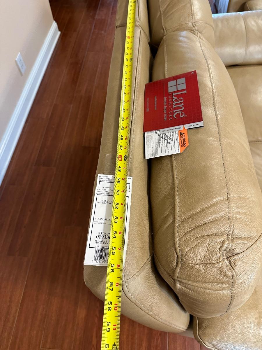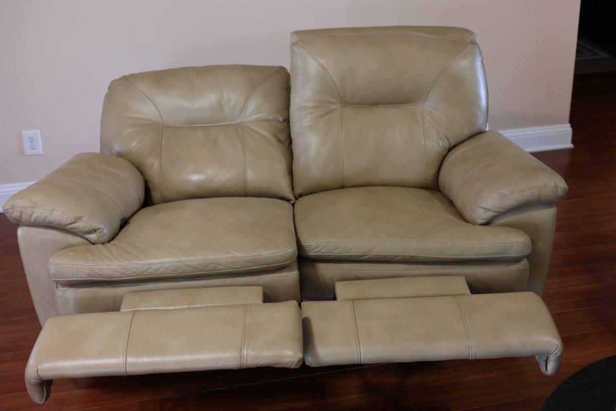 Recliner leather & vinyl comnbination love seat. Dimensions are in the pictures.