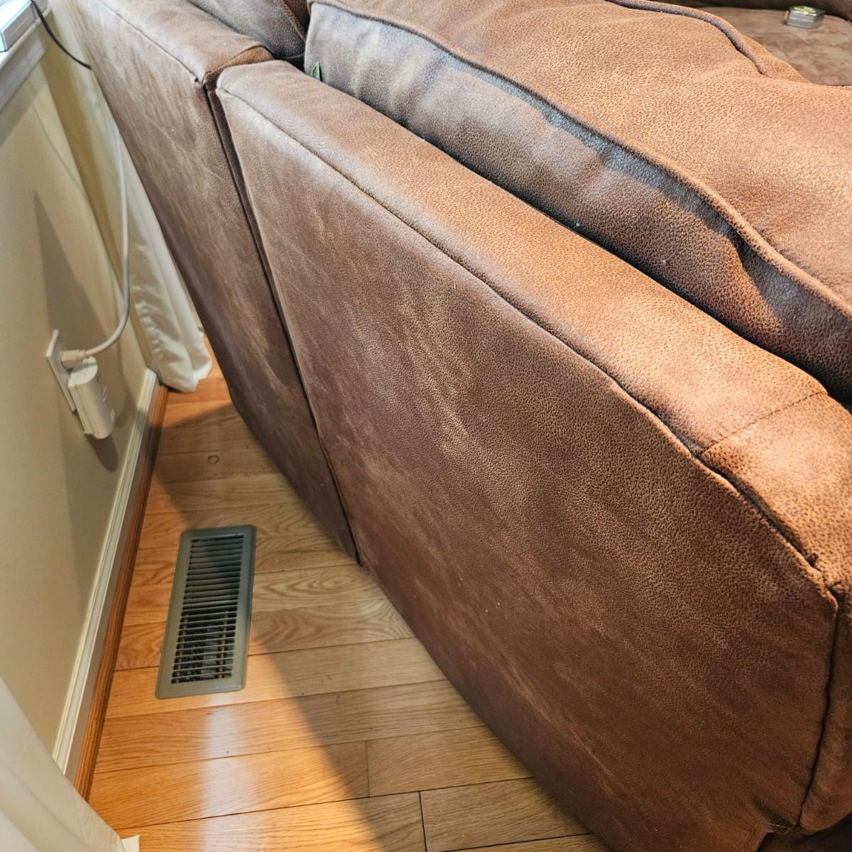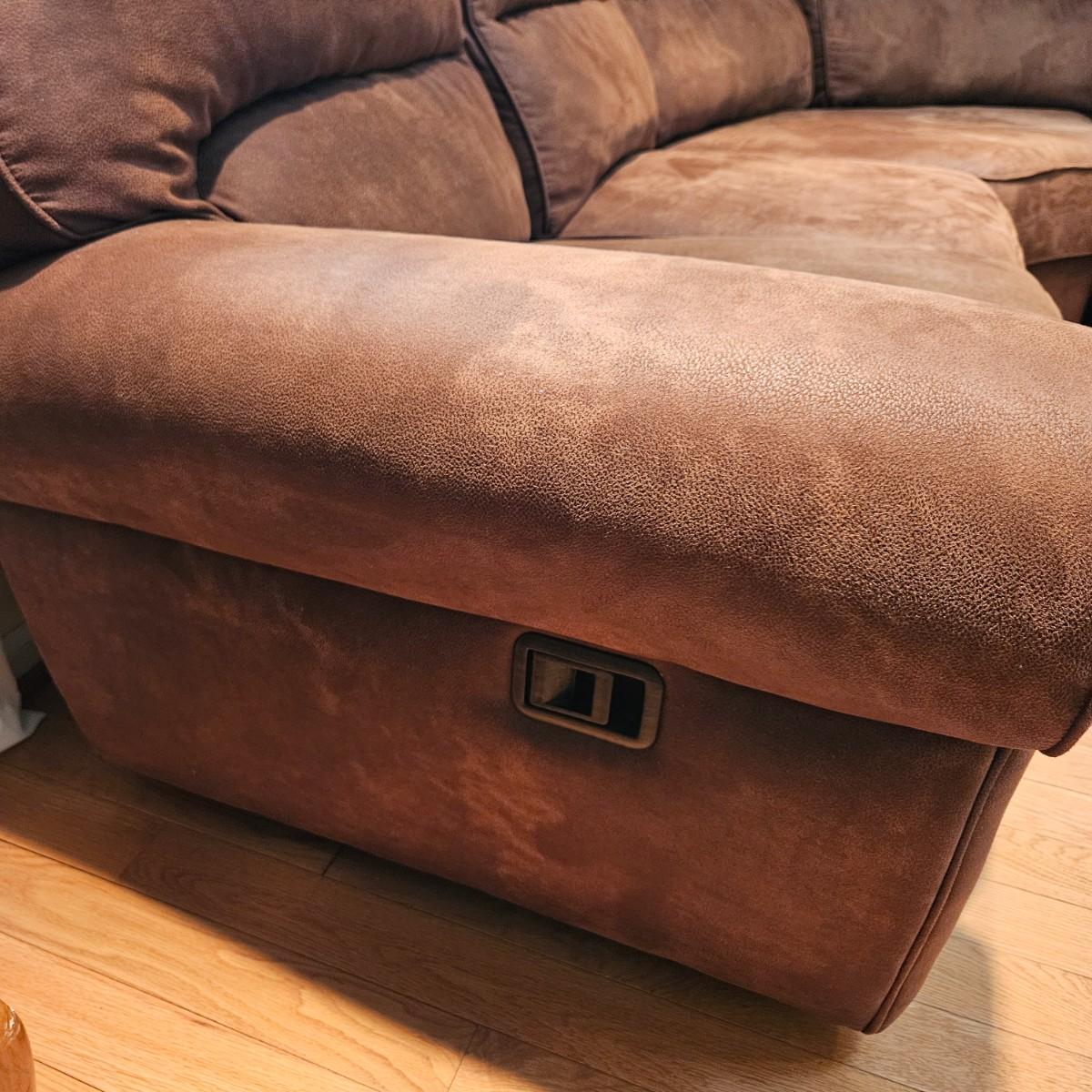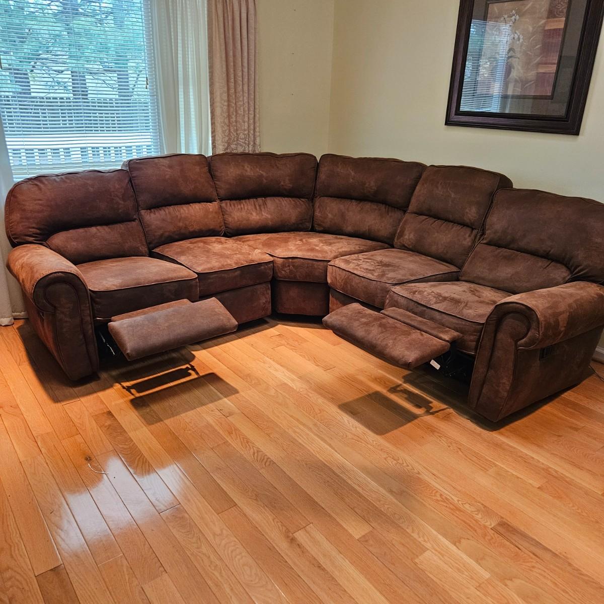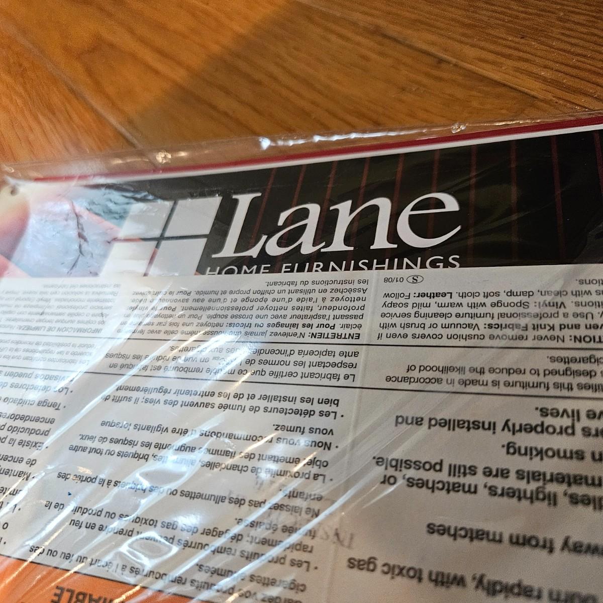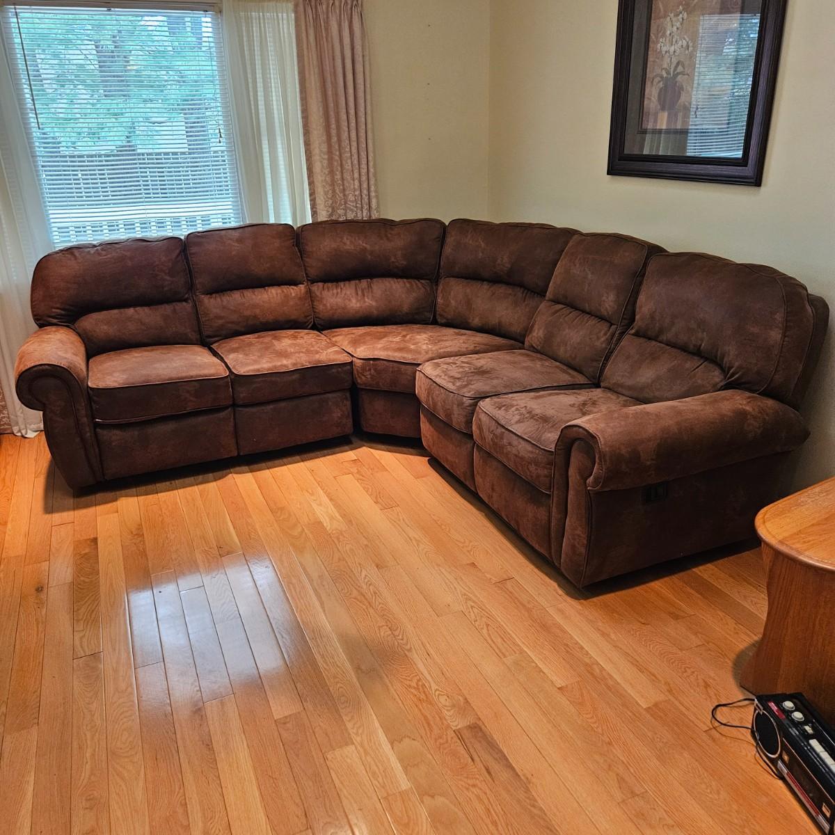 A Lane three piece reclining sectional that has a brown, faux leather upholstery. The two end sections measure approximately 55" x 40" x 39"H with a seat height of 19"H. The middle section measures approximately 67" x 40" x 39"H. There are two recliners on the ends and the cushions cannot be removed. Local pickup only. Winning bidder must bring assistance to help move and load this item due to its weight and/or size.