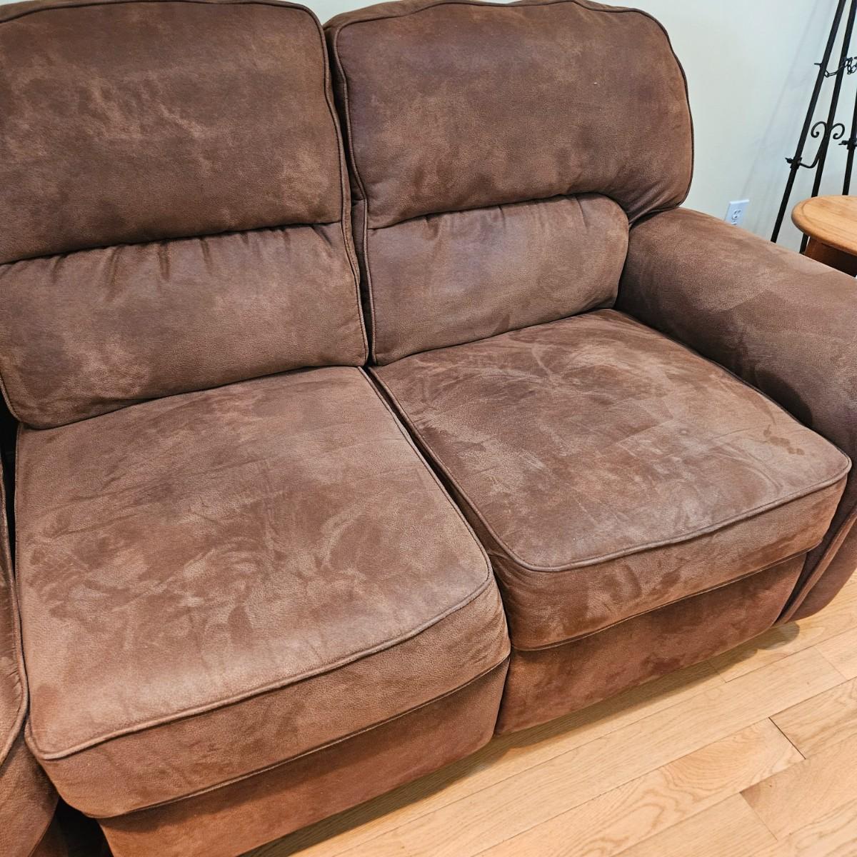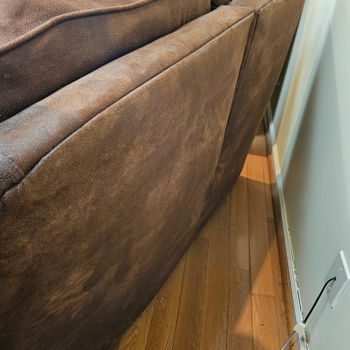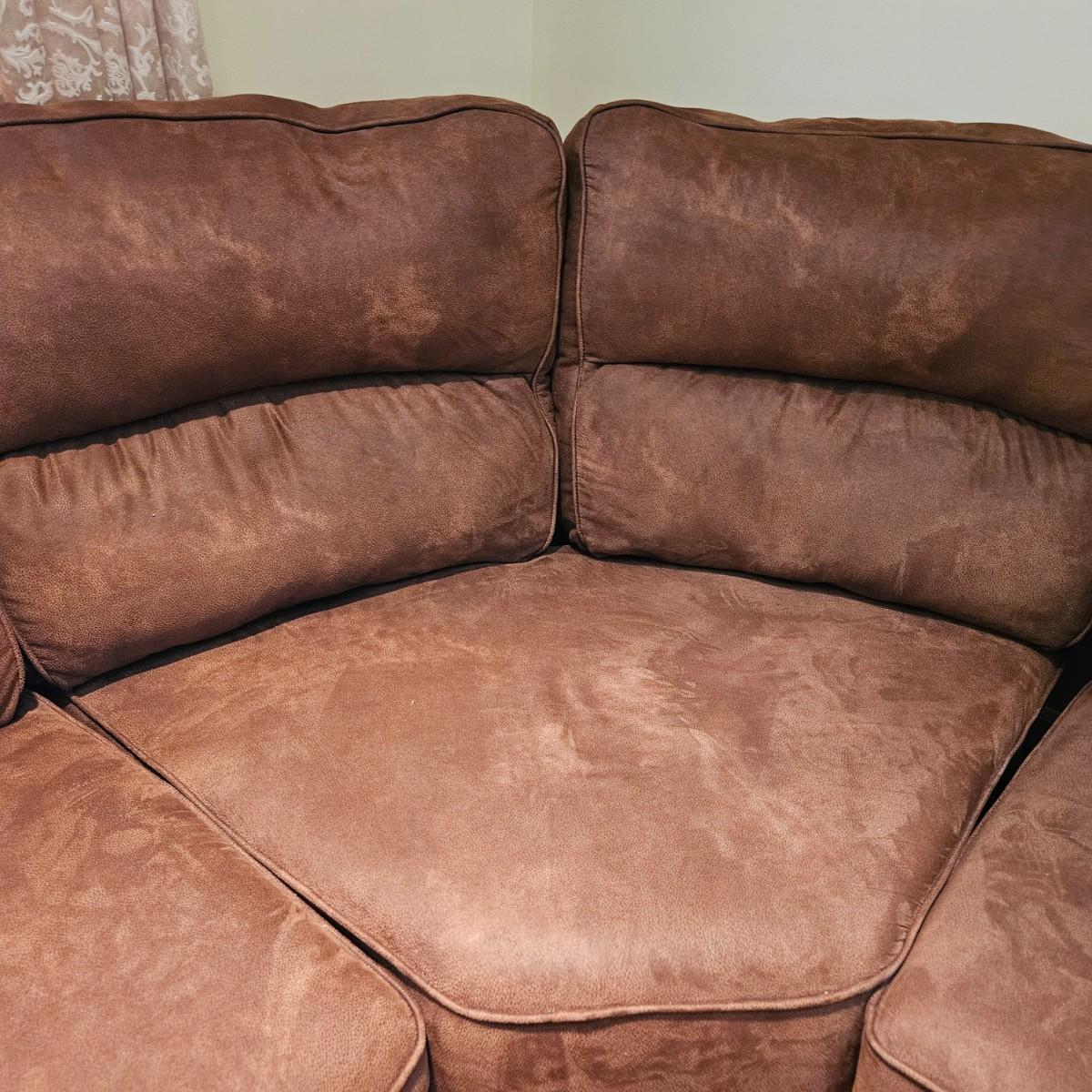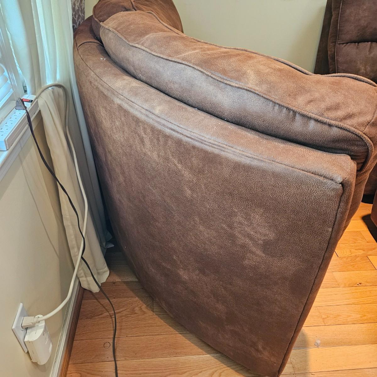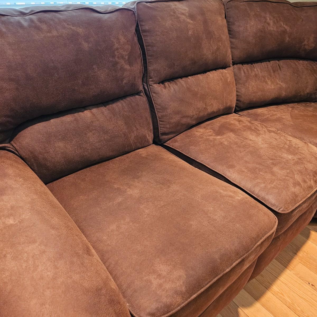 A Lane three piece reclining sectional that has a brown, faux leather upholstery. The two end sections measure approximately 55" x 40" x 39"H with a seat height of 19"H. The middle section measures approximately 67" x 40" x 39"H. There are two recliners on the ends and the cushions cannot be removed. Local pickup only. Winning bidder must bring assistance to help move and load this item due to its weight and/or size.