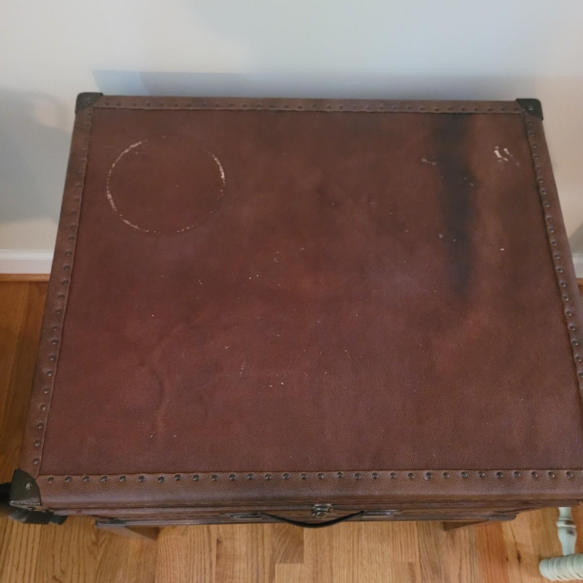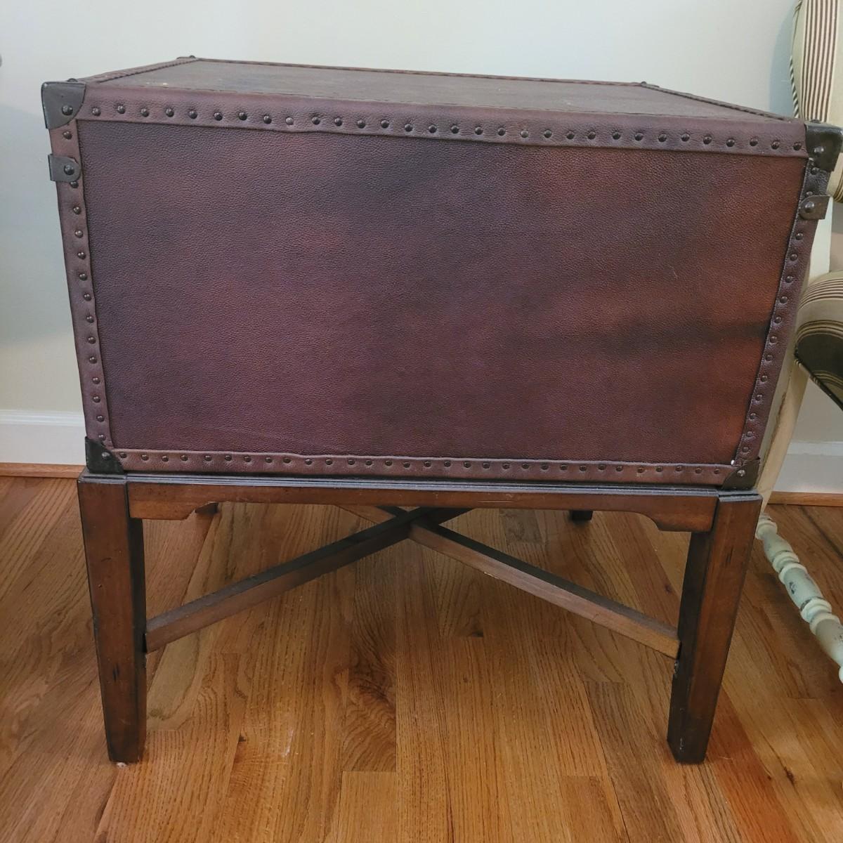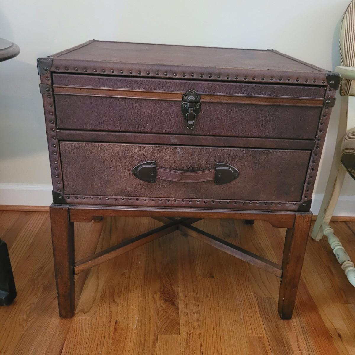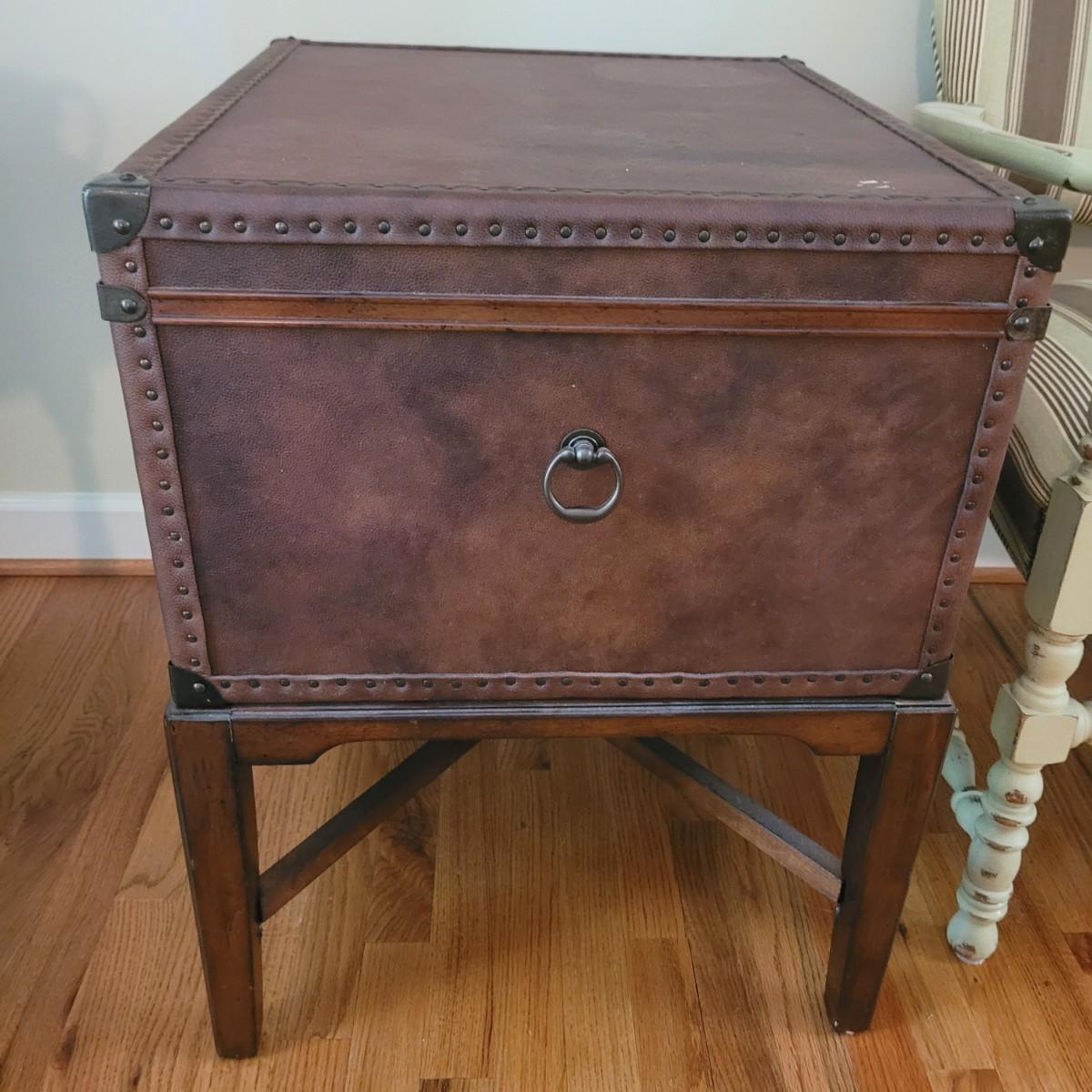 This end table by Lane Furniture is fashioned in the style of a leather trunk. Cannot confirm if leather is real. And note there are some blemishes, see images. Measures approximately 24" x 20" x 26"H. Local pickup only.