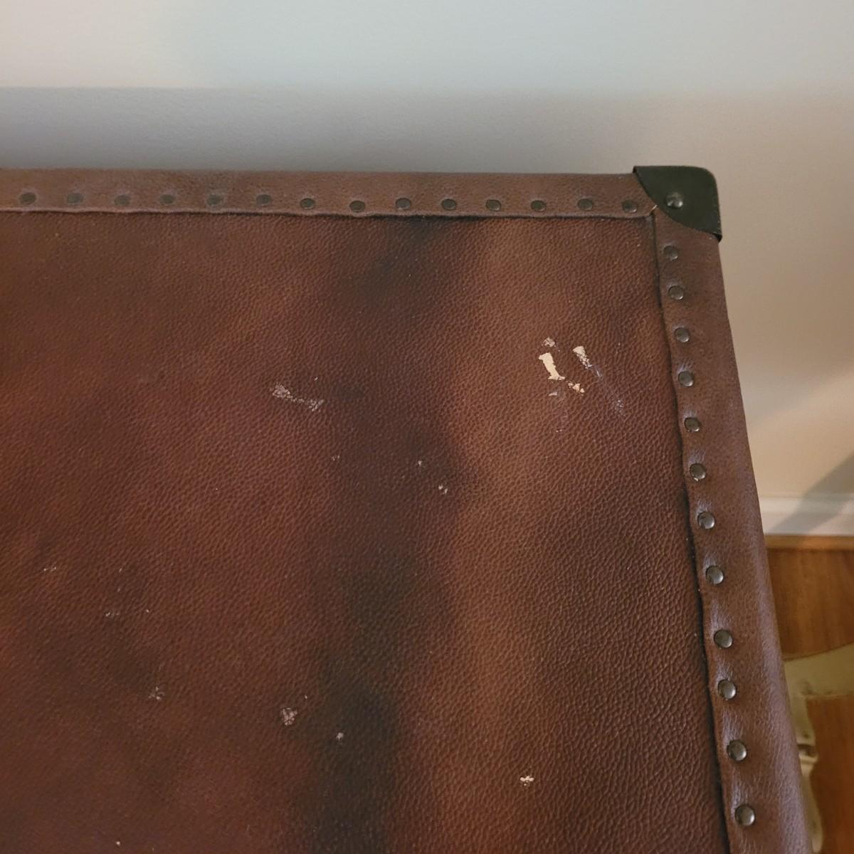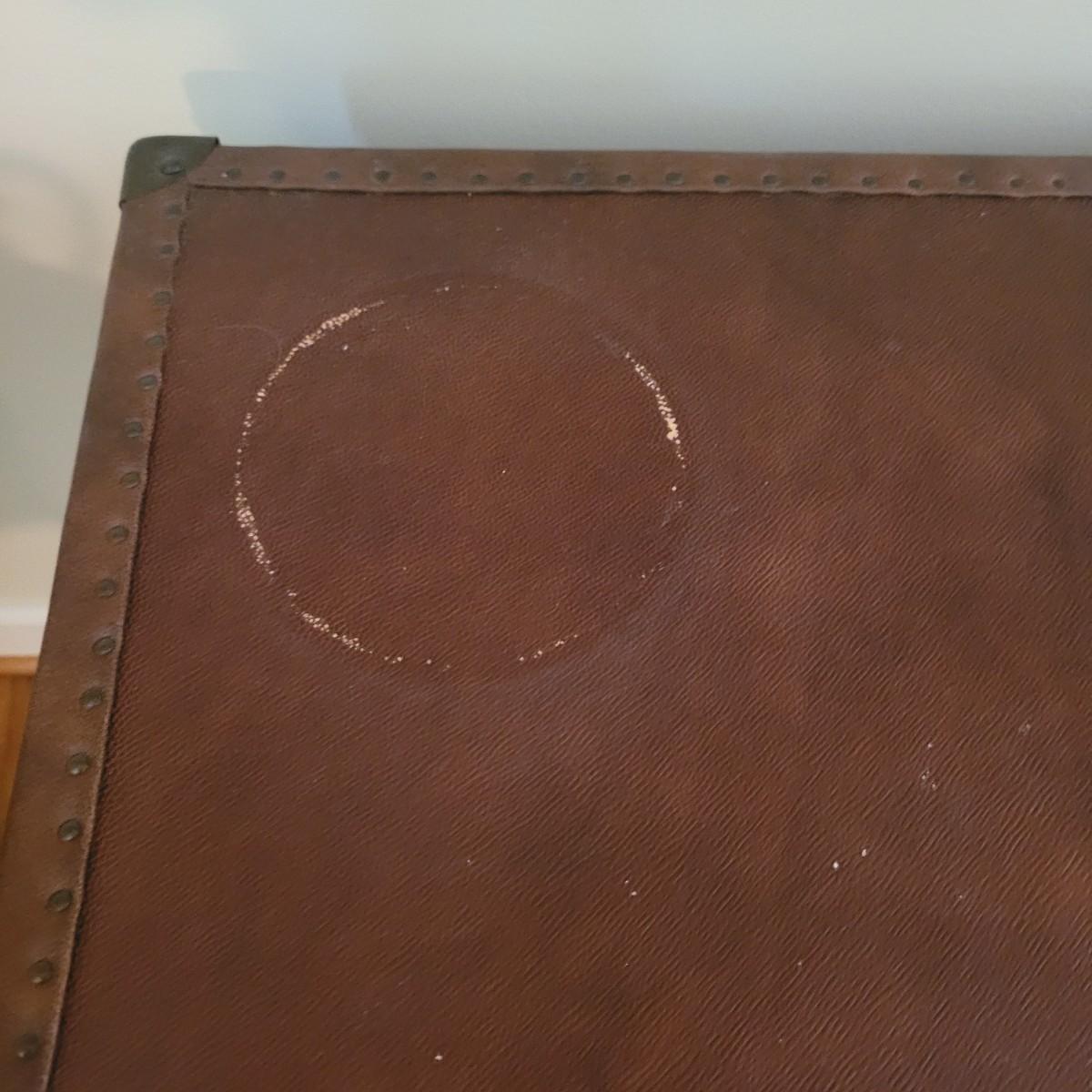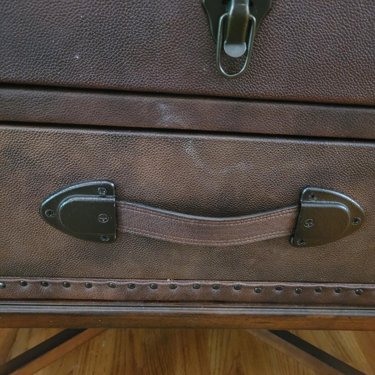 This end table by Lane Furniture is fashioned in the style of a leather trunk. Cannot confirm if leather is real. And note there are some blemishes, see images. Measures approximately 24" x 20" x 26"H. Local pickup only.