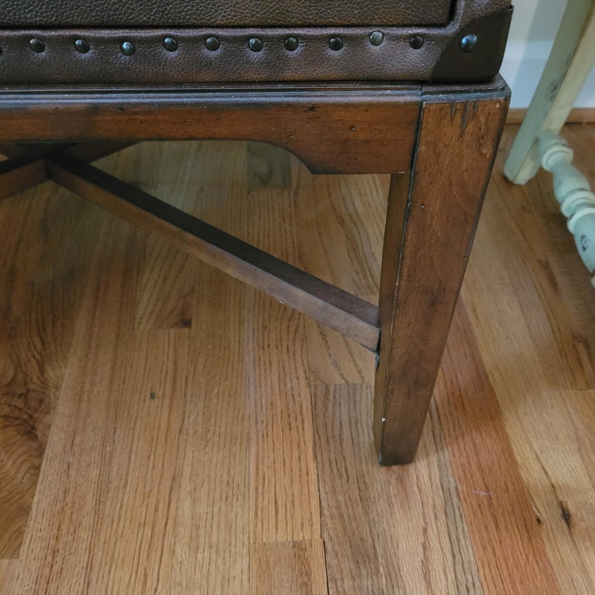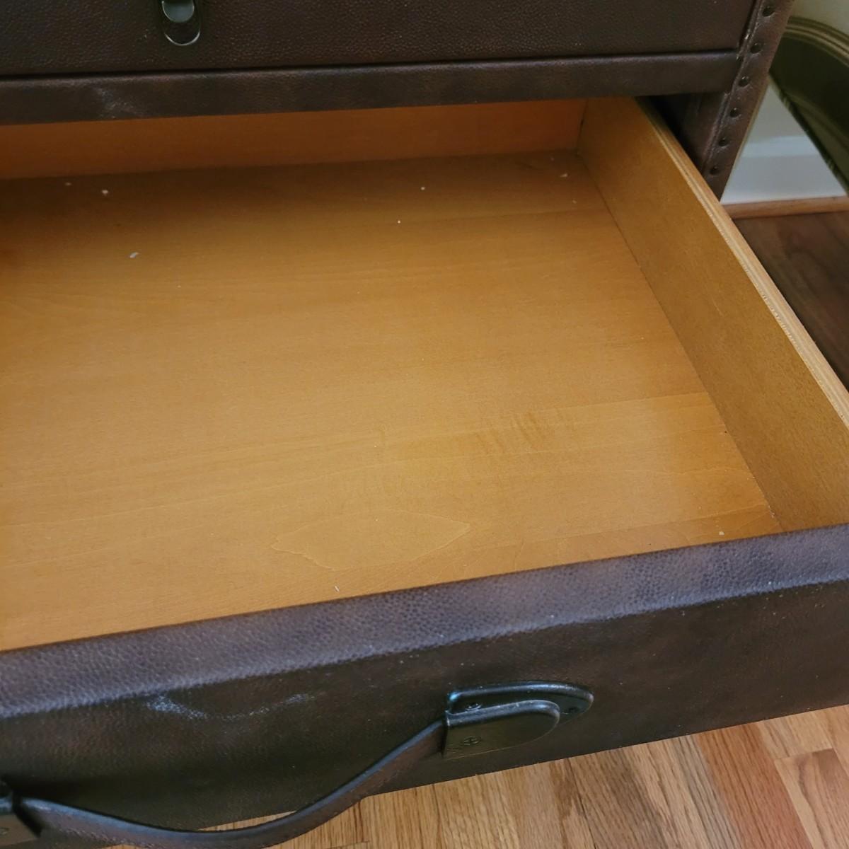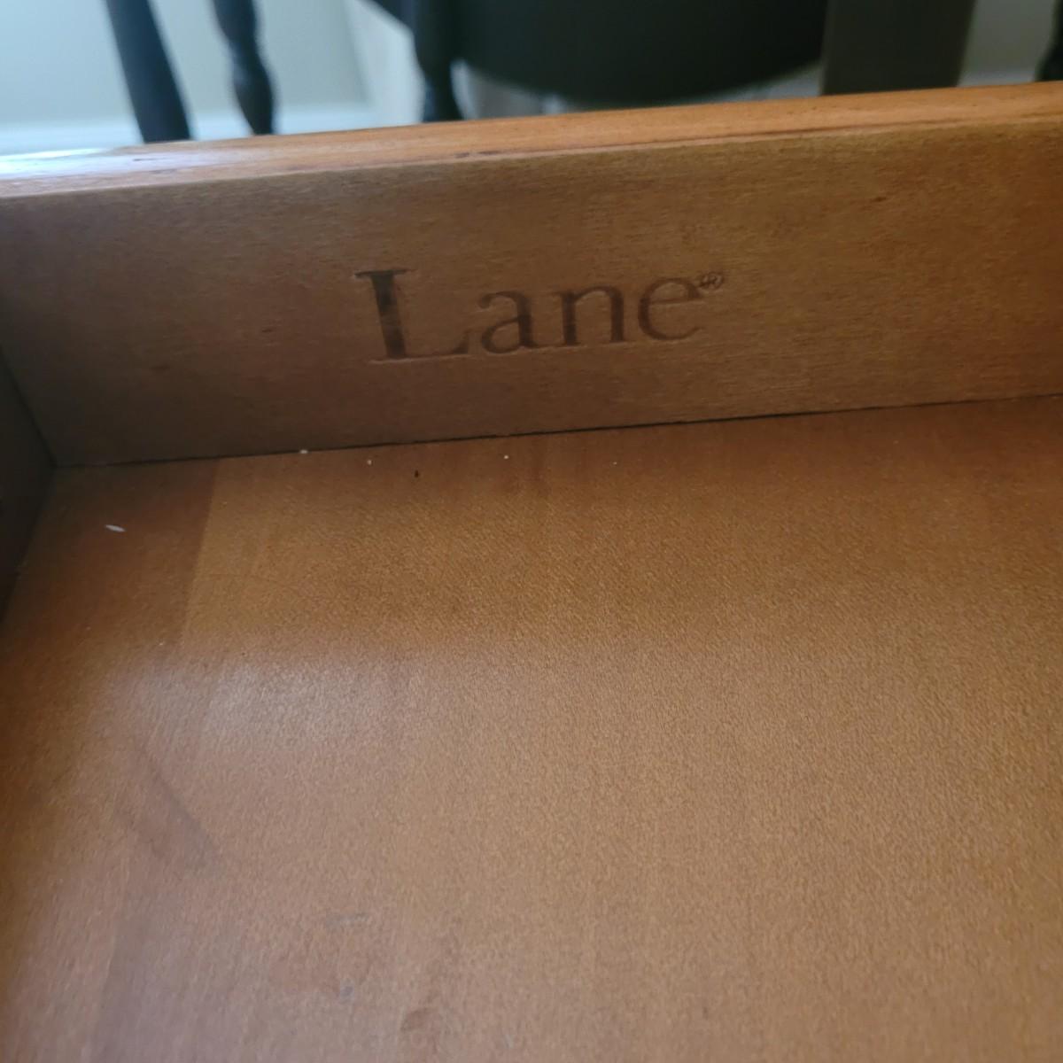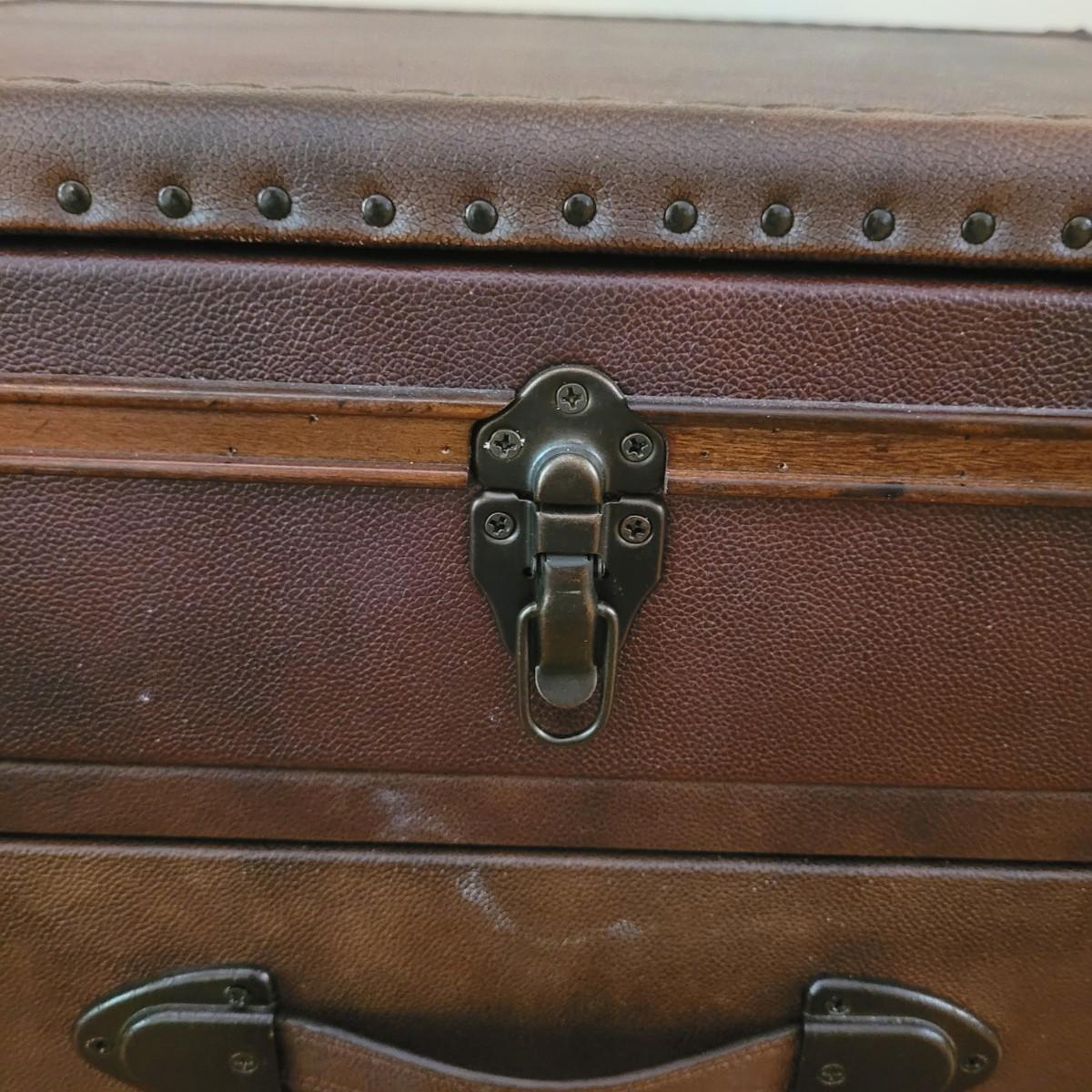 This end table by Lane Furniture is fashioned in the style of a leather trunk. Cannot confirm if leather is real. And note there are some blemishes, see images. Measures approximately 24" x 20" x 26"H. Local pickup only.