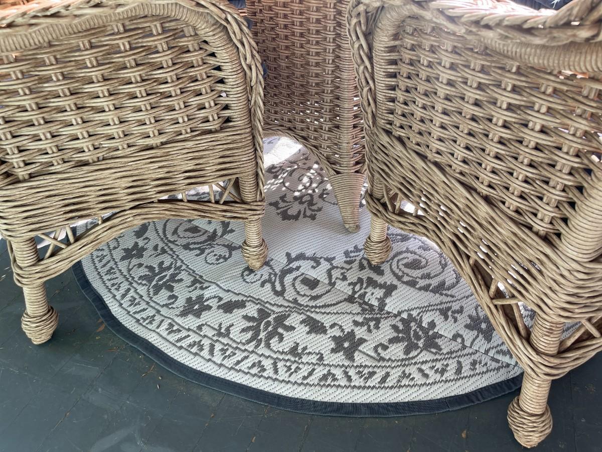 Good condition. Piece was kept in three season room so it was never outside but does have some fading and wear to the wicker.