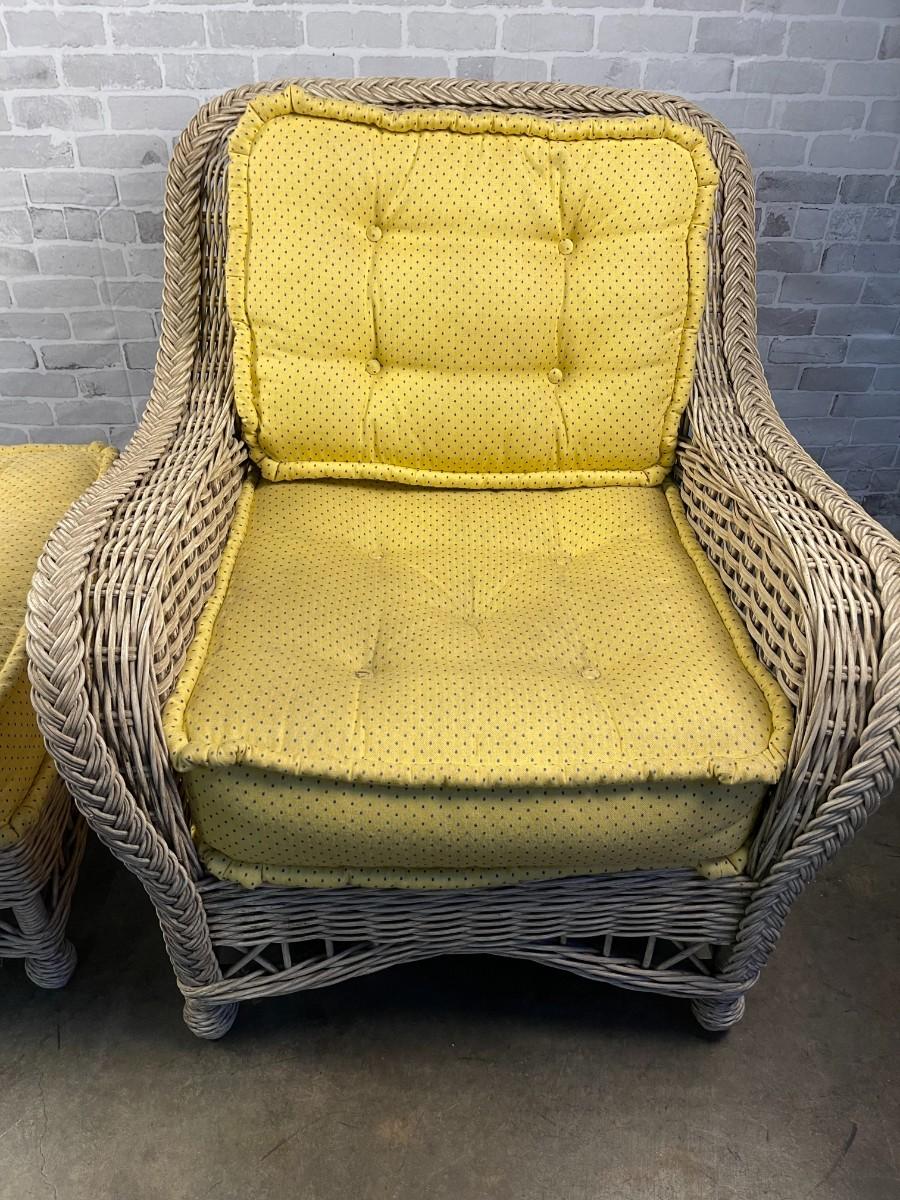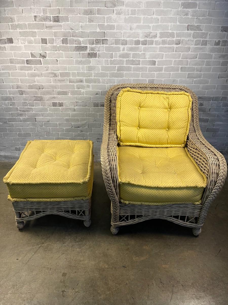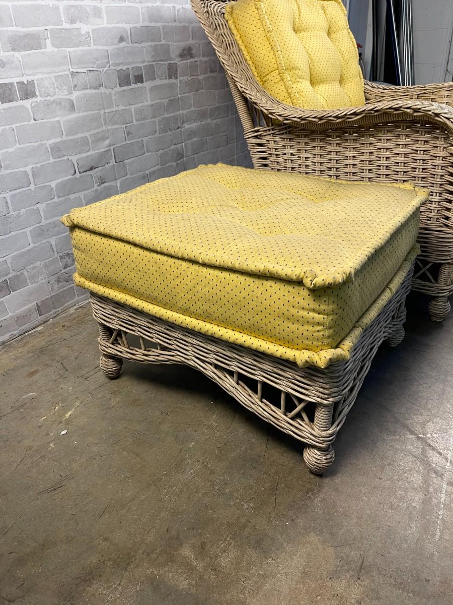 Lane Venture wicker club chair with ottoman. Chair is 37" high x 34" wide. Ottoman is 19" high x 24" x 27". Indoor/outdoor. Good condition, cushions have some staining. # 1525