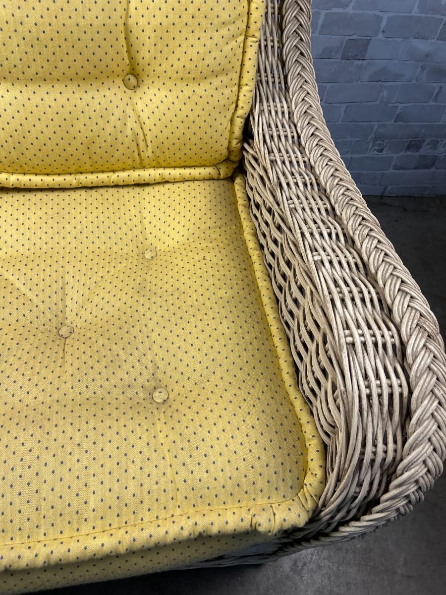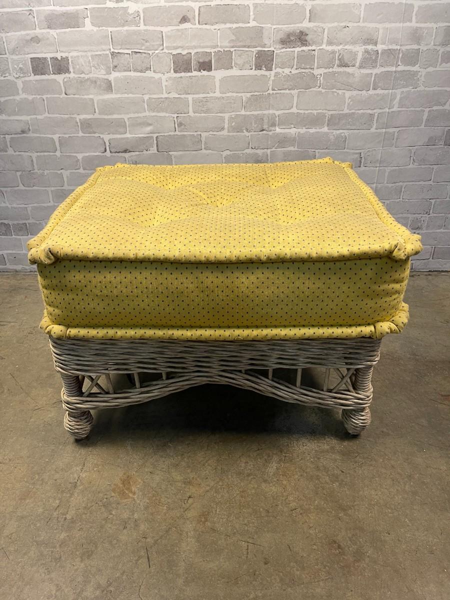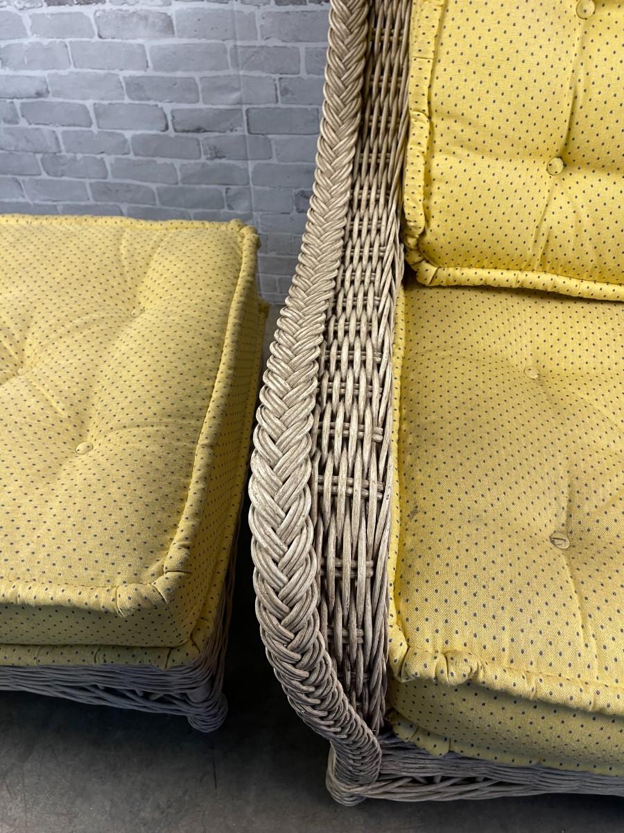 Lane Venture wicker club chair with ottoman. Chair is 37" high x 34" wide. Ottoman is 19" high x 24" x 27". Indoor/outdoor. Good condition, cushions have some staining. # 1525