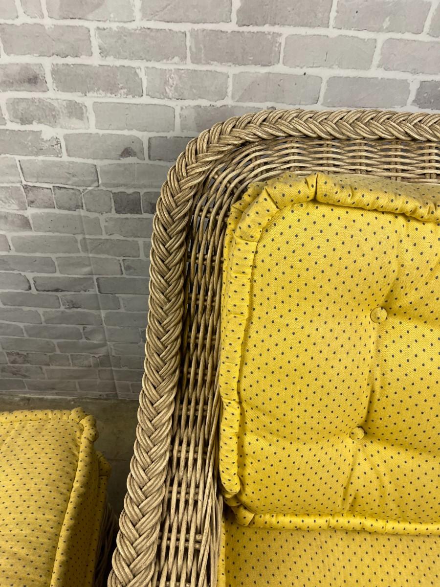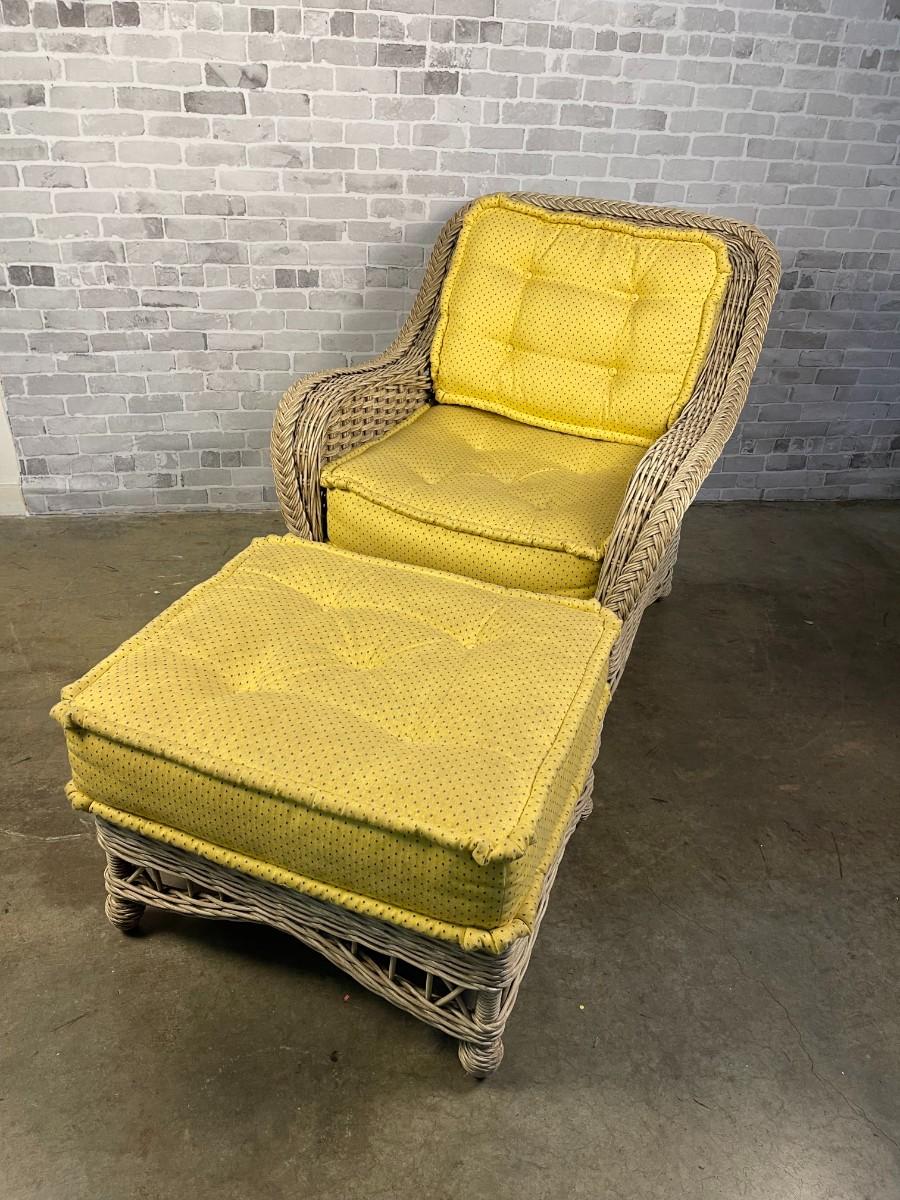 Lane Venture wicker club chair with ottoman. Chair is 37" high x 34" wide. Ottoman is 19" high x 24" x 27". Indoor/outdoor. Good condition, cushions have some staining. # 1525