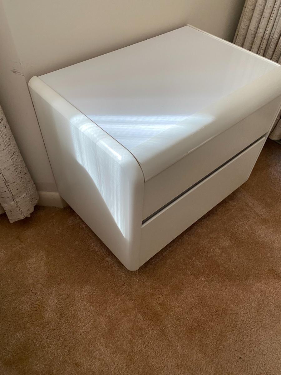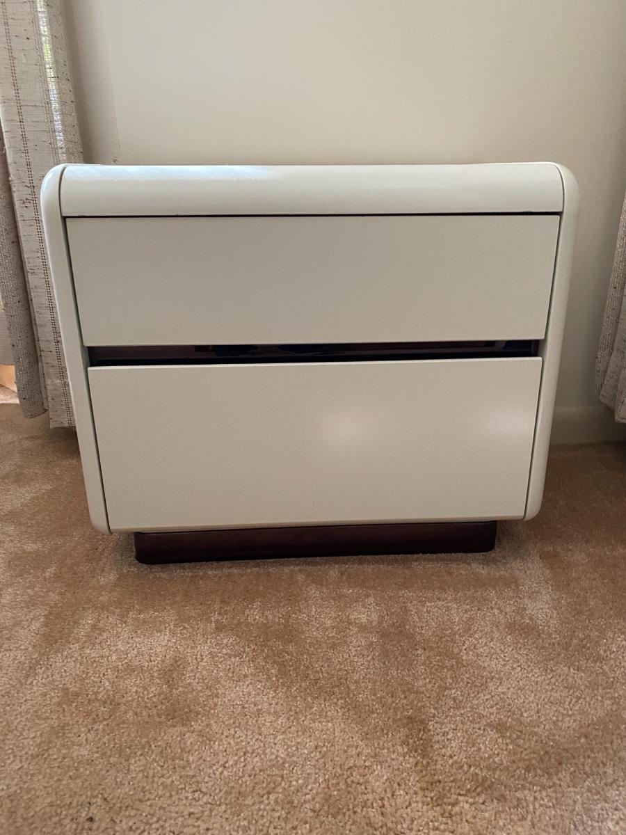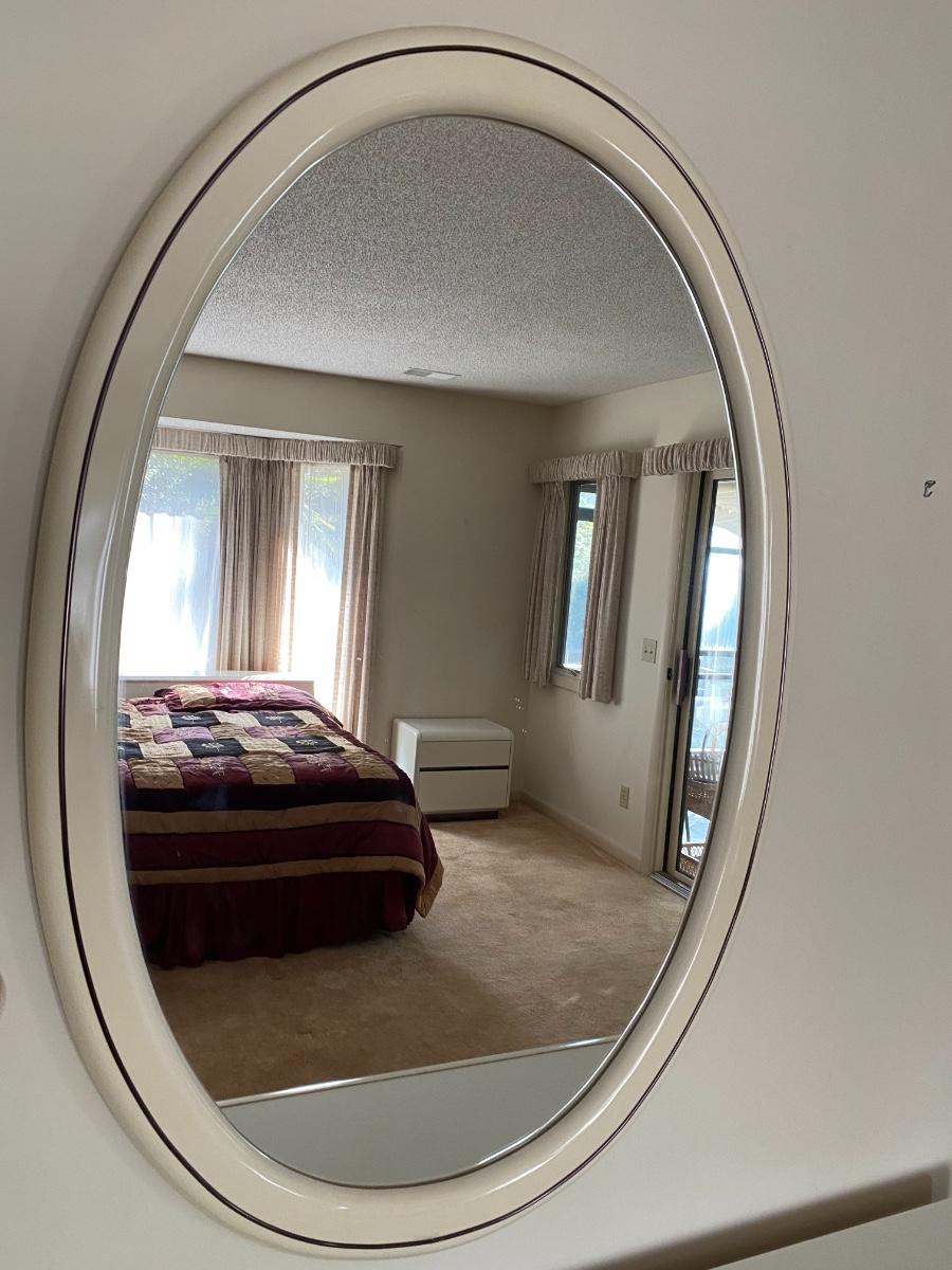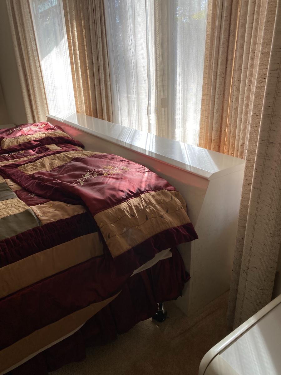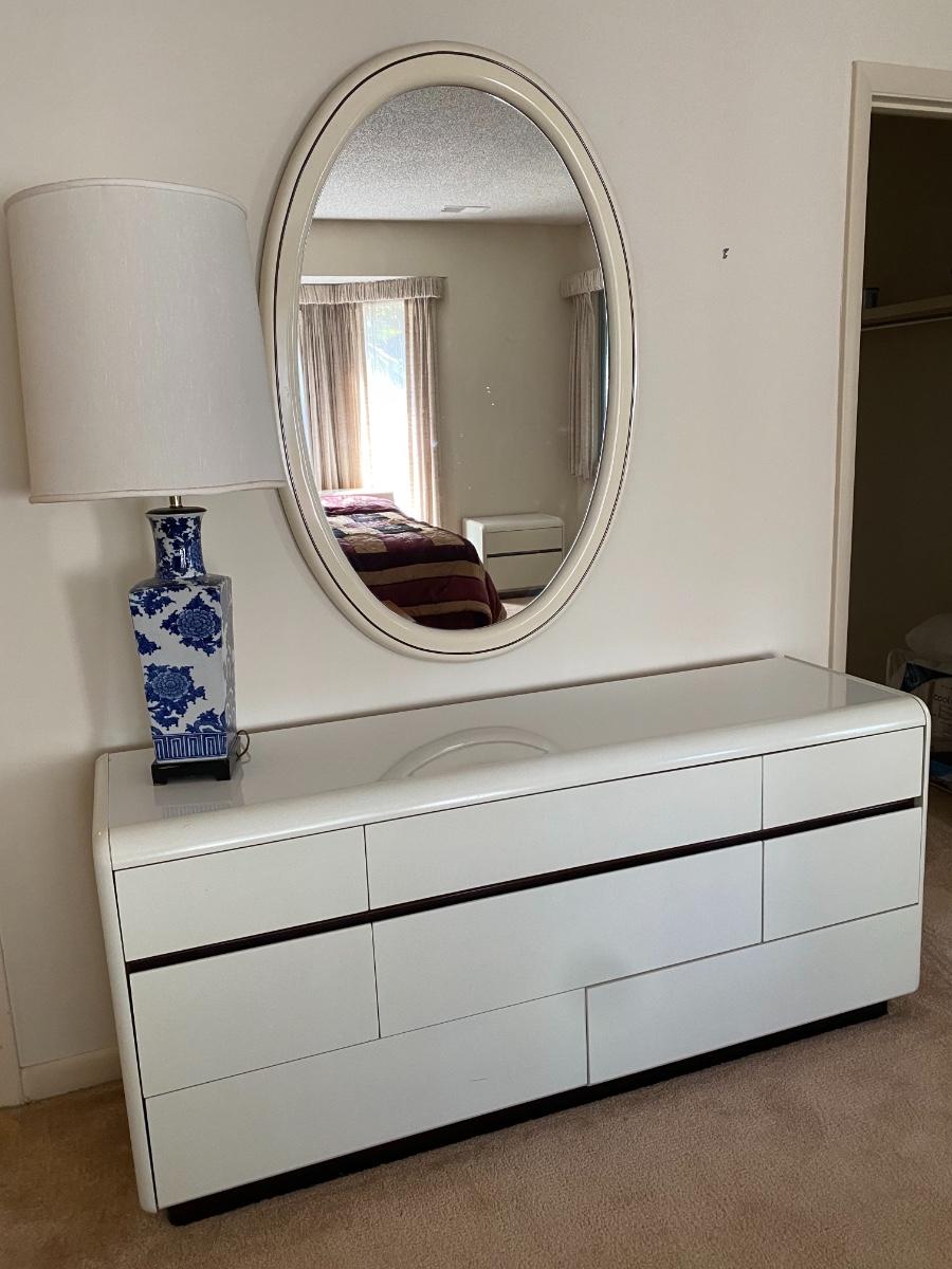Heavy. You must bring help to move or coordinate professional movers. Includes a California king bed with headboard, two nightstands, a dresser and a wall mirror. Stamped with maker mark Altavista, Virginia. The headboard measures 82 inches wide by 13 inches deep by 30 inches high. The mirror measures 33 inches wide by 48 inches high. The dresser measures 63 inches wide by 19 inches deep by 29 inches high. Each of the two nightstands measures 24 inches wide by 16 inches deep by 21 inches high. These are very heavy pieces of furniture. You will need to bring tools to disassemble them and help to move these items out of the house. They are on the ground level and near the garage. Overall condition is good. As is. Mattress and box spring are optional. Heavy!!!