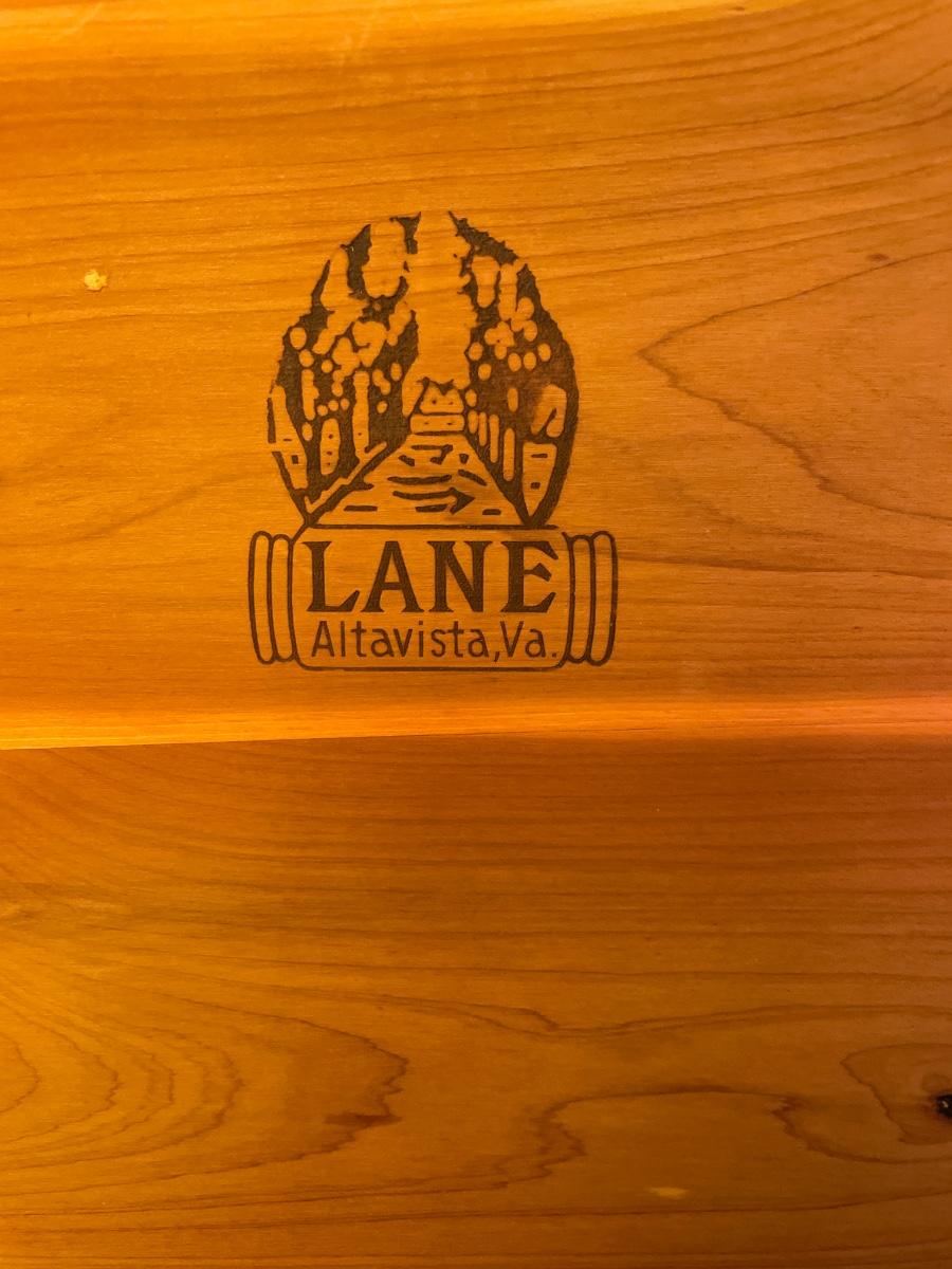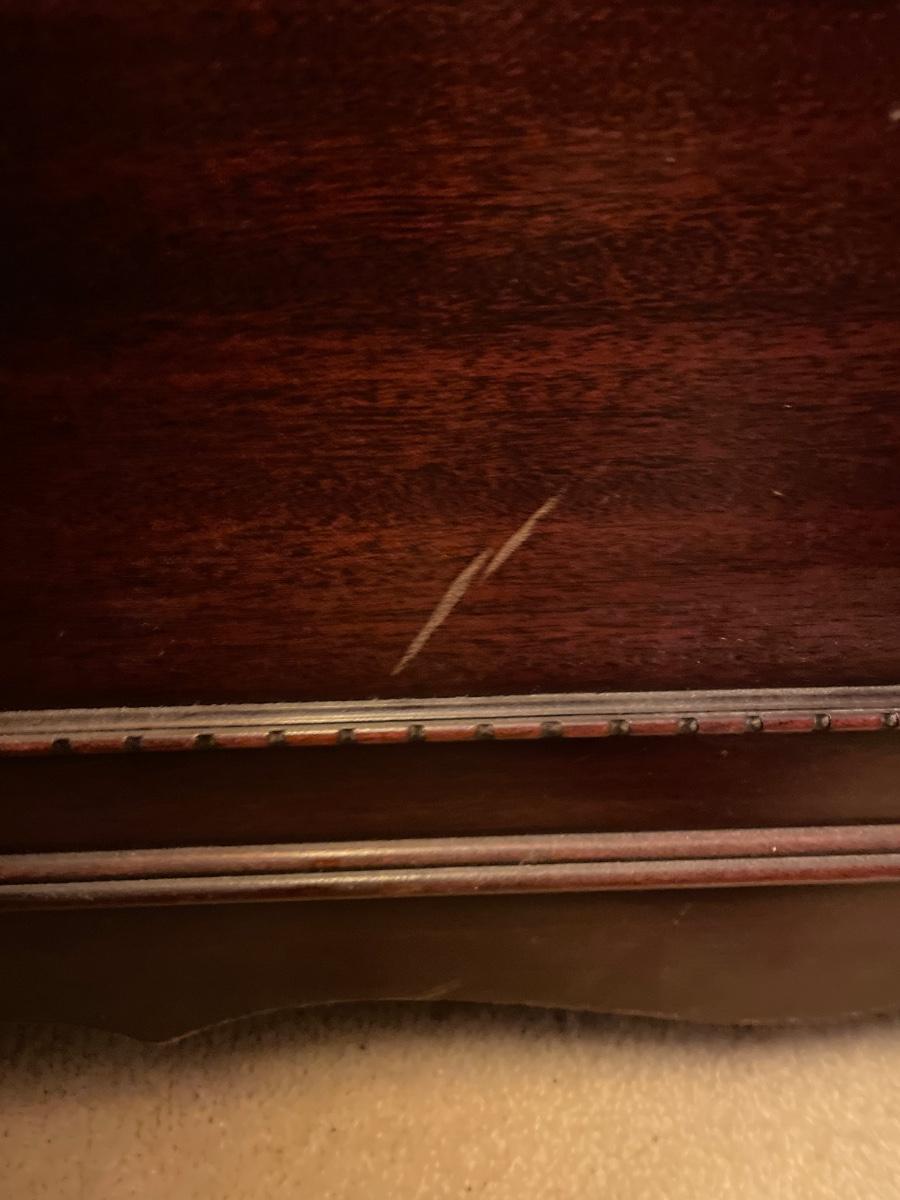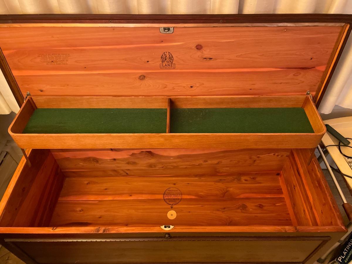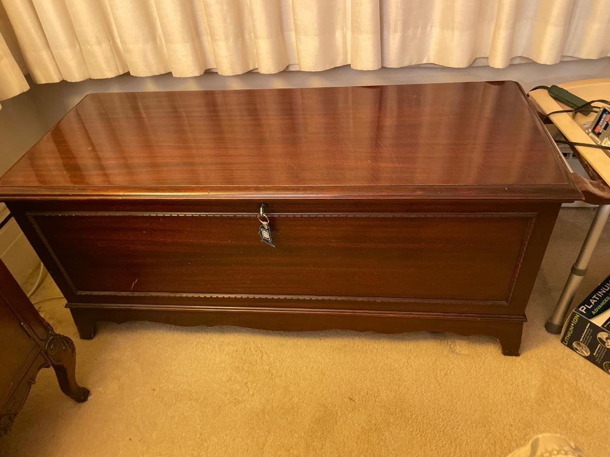 Has lock and key.There are some noticeable scratches on the lid and front side lower left. Dimensions are 48” long x 19” deep x 21” tall