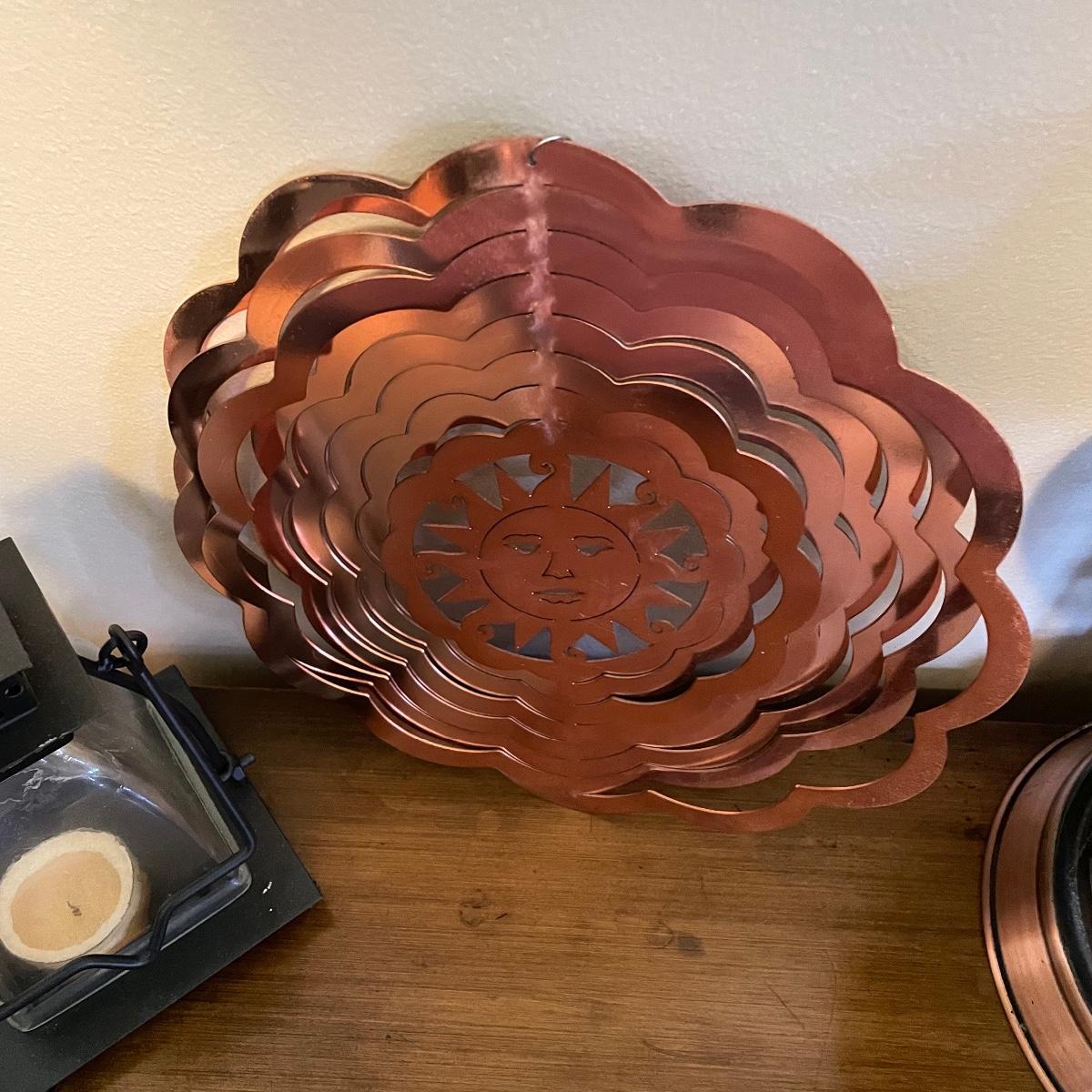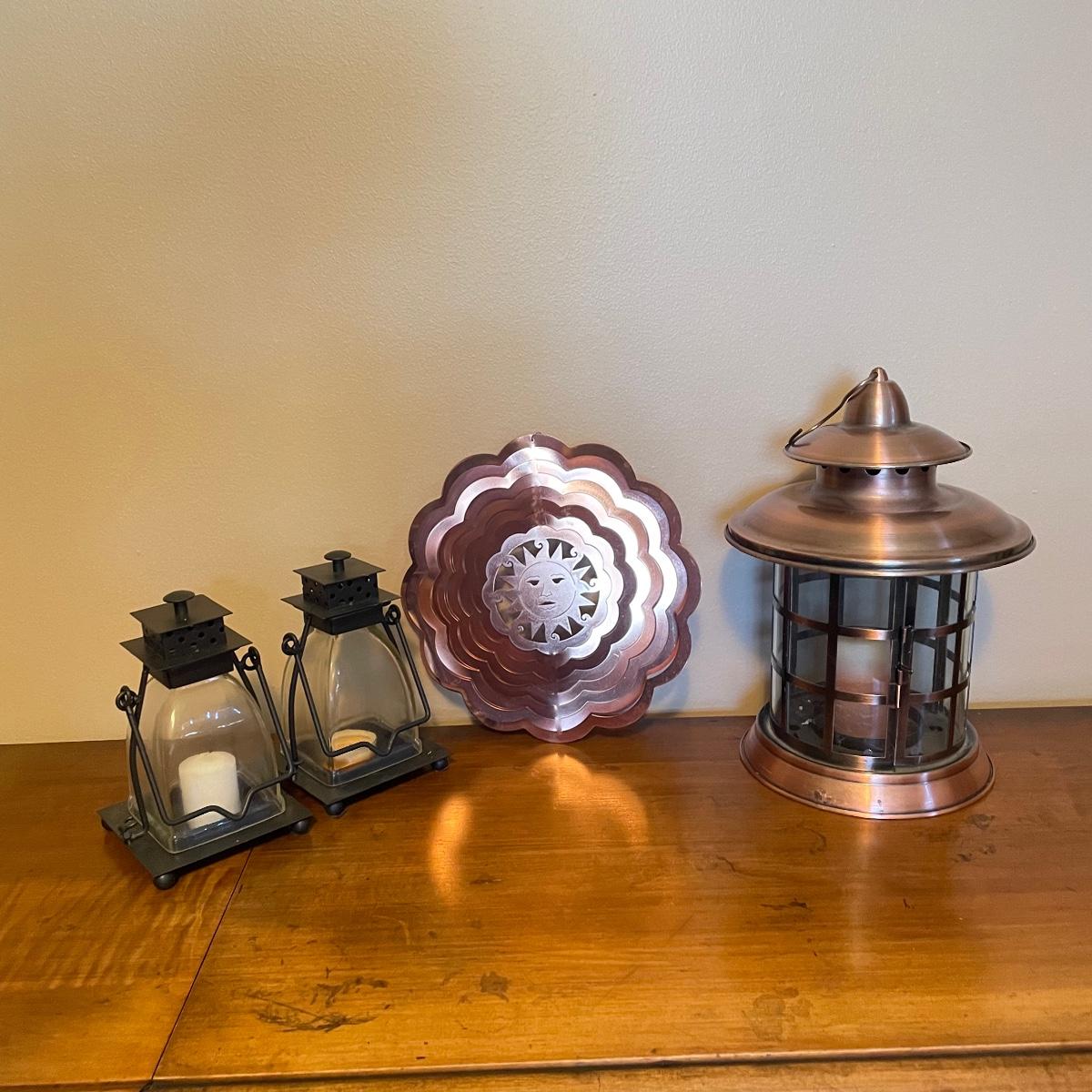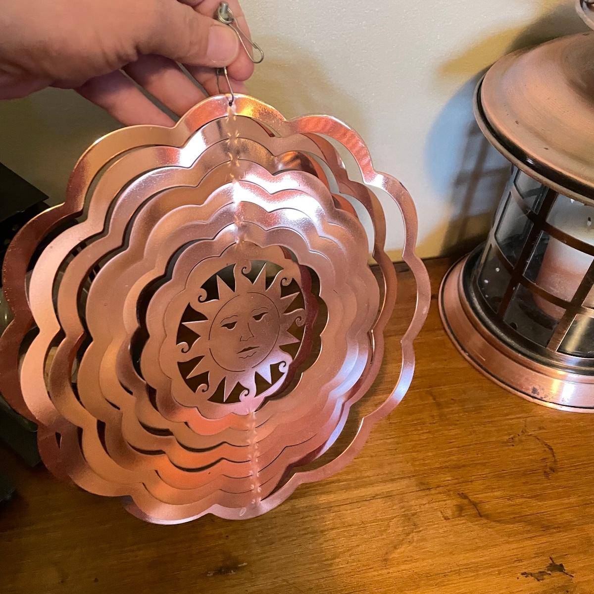 An 11” copper colored metal lantern with another copper colored sun spinner. Lot also offers two more black 6.5” lanterns. See images. Local pick up only.