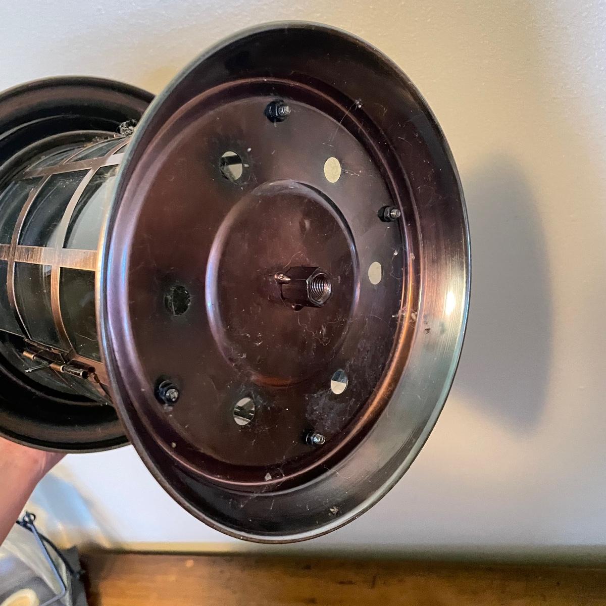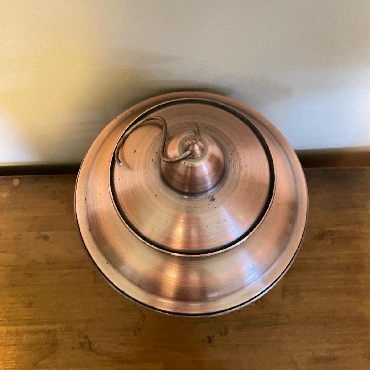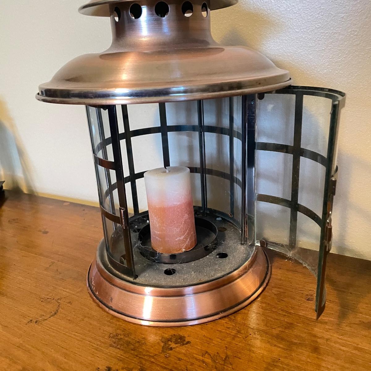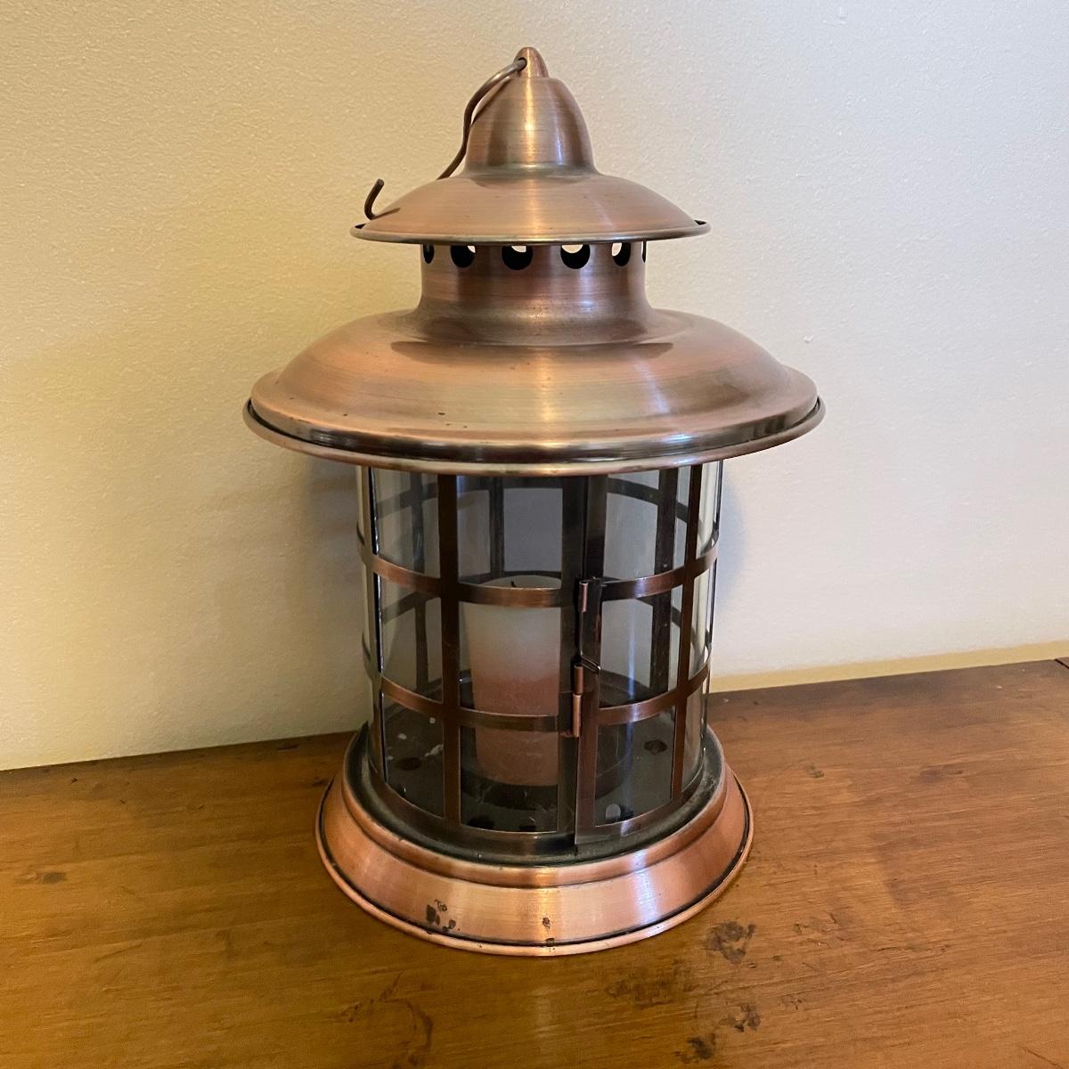 An 11” copper colored metal lantern with another copper colored sun spinner. Lot also offers two more black 6.5” lanterns. See images. Local pick up only.