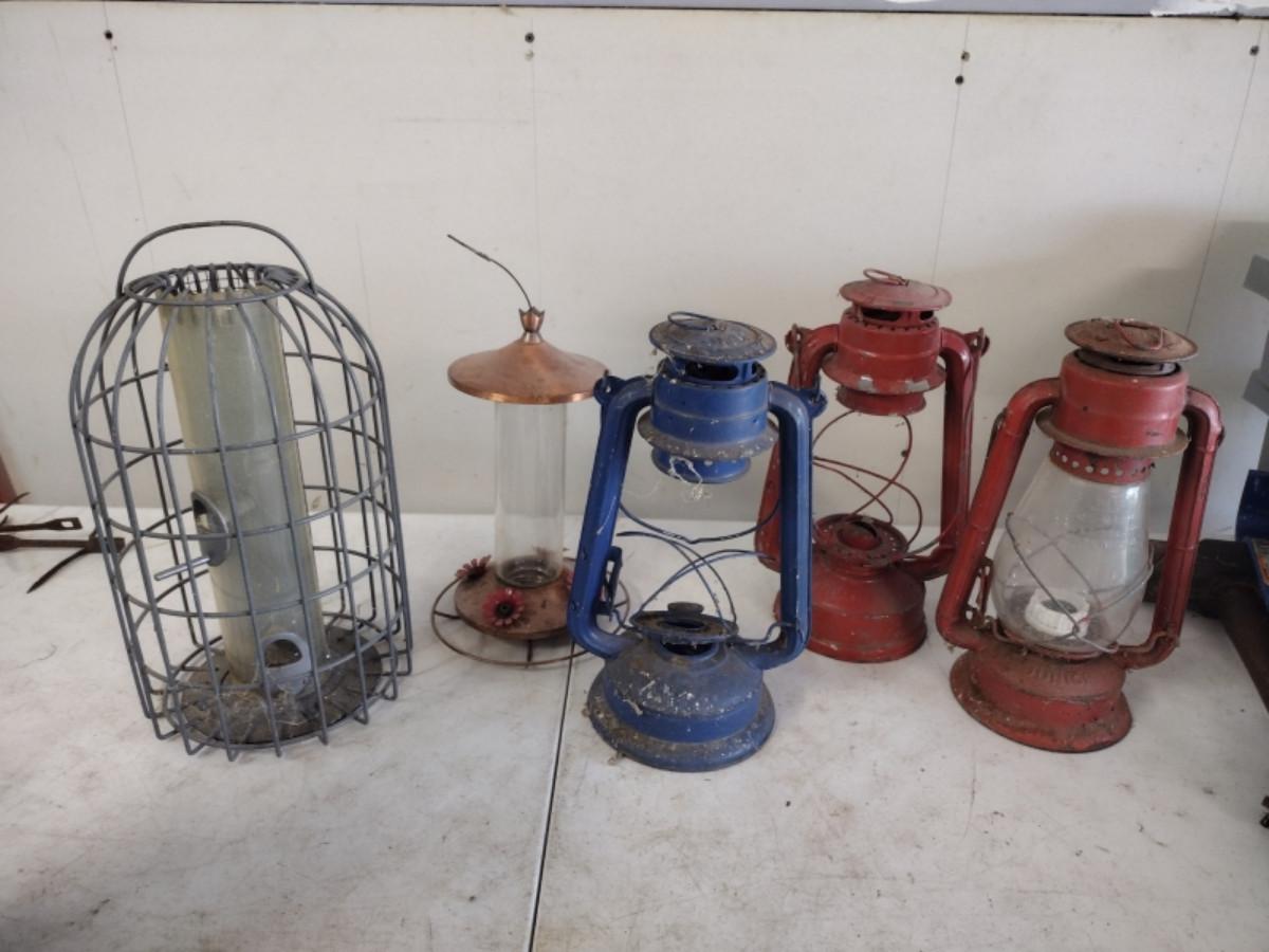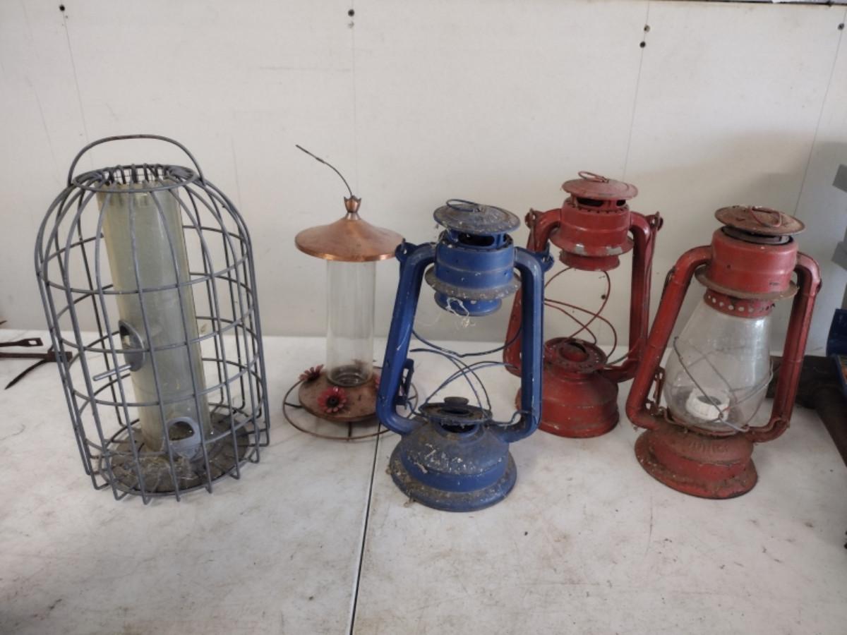 See pictures for more details. Includes 3 lanterns in various condition and two bird feeders.